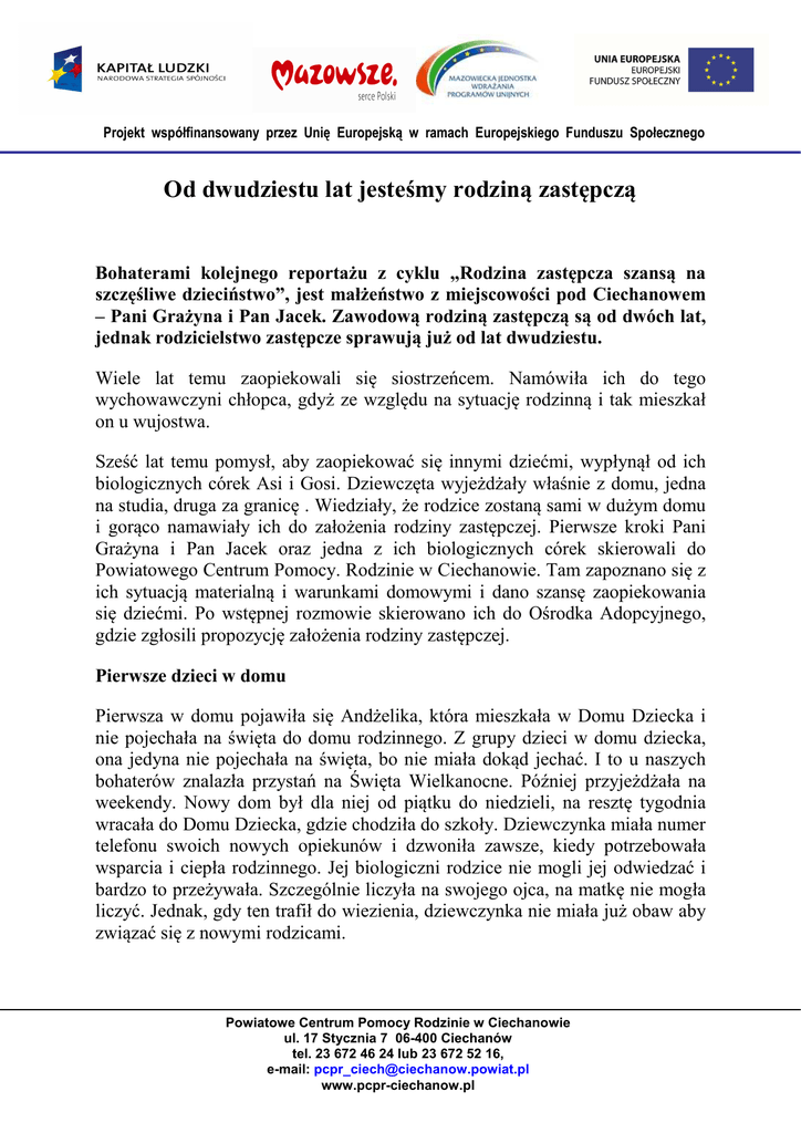 Projekt współfinansowany przez Unię Europejską w ramach Europejskiego Funduszu Społecznego Od dwudziestu lat jesteśmy rodziną zastępczą Bohaterami kolejnego reportażu z cyklu „Rodzina zastępcza szansą na szczęśliwe dzieciństwo”, jest małżeństwo z miejscowości pod Ciechanowem – Pani Grażyna i Pan Jacek. Zawodową rodziną zastępczą są od dwóch lat, jednak rodzicielstwo zastępcze sprawują już od lat dwudziestu. Wiele lat temu zaopiekowali się siostrzeńcem. Namówiła ich do tego wychowawczyni chłopca, gdyż ze względu na sytuację rodzinną i tak mieszkał on u wujostwa. Sześć lat temu pomysł, aby zaopiekować się innymi dziećmi, wypłynął od ich biologicznych córek Asi i Gosi. Dziewczęta wyjeżdżały właśnie z domu, jedna na studia, druga za granicę . Wiedziały, że rodzice zostaną sami w dużym domu i gorąco namawiały ich do założenia rodziny zastępczej. Pierwsze kroki Pani Grażyna i Pan Jacek oraz jedna z ich biologicznych córek skierowali do Powiatowego Centrum Pomocy. Rodzinie w Ciechanowie. Tam zapoznano się z ich sytuacją materialną i warunkami domowymi i dano szansę zaopiekowania się dziećmi. Po wstępnej rozmowie skierowano ich do Ośrodka Adopcyjnego, gdzie zgłosili propozycję założenia rodziny zastępczej. Pierwsze dzieci w domu Pierwsza w domu pojawiła się Andżelika, która mieszkała w Domu Dziecka i nie pojechała na święta do domu rodzinnego. Z grupy dzieci w domu dziecka, ona jedyna nie pojechała na święta, bo nie miała dokąd jechać. I to u naszych bohaterów znalazła przystań na Święta Wielkanocne. Później przyjeżdżała na weekendy. Nowy dom był dla niej od piątku do niedzieli, na resztę tygodnia wracała do Domu Dziecka, gdzie chodziła do szkoły. Dziewczynka miała numer telefonu swoich nowych opiekunów i dzwoniła zawsze, kiedy potrzebowała wsparcia i ciepła rodzinnego. Jej biologiczni rodzice nie mogli jej odwiedzać i bardzo to przeżywała. Szczególnie liczyła na swojego ojca, na matkę nie mogła liczyć. Jednak, gdy ten trafił do wiezienia, dziewczynka nie miała już obaw aby związać się z nowymi rodzicami. Powiatowe Centrum Pomocy Rodzinie w Ciechanowie ul. 17 Stycznia 7 06-400 Ciechanów tel. 23 672 46 24 lub 23 672 52 16, e-mail: [email protected] www.pcpr-ciechanow.pl Projekt współfinansowany przez Unię Europejską w ramach Europejskiego Funduszu Społecznego Dziewczynka i jej przyjaciółki znalazły nowy dom W Domu Dziecka mieszkała w pokoju z dwoma innymi dziewczynkami Olą i Kają, z którymi była bardzo zaprzyjaźniona. To ona zabiegała o to, aby jej koleżanki także przyjeżdżały do nowego domu. Potem do domu naszych bohaterów przyjeżdżali również bracia dziewczynek i tak z końcem roku szkolnego w domu pojawiła się jednocześnie piątka dzieci. Obawy były Największe obawy dotyczyły sytuacji, czy nowi rodzice sobie poradzą? - Szybko je rozwialiśmy.- wspomina ten czas Pani Grażyna - Uważam, że takie dzieci są mądrzejsze, niż ich rówieśnicy. Zapewne trudne przeżycia w biologicznych rodzinach wpłynęły na dojrzałość naszej piątki – podkreśla Pani Grażyna. Dzieci traktują się jak rodzeństwo, mimo, że nie wszyscy nimi są – zaznacza Pan Jacek. - Nie stronią od trudnych rozmów, a nawet chętnie rozmawiają o swojej sytuacji - dodaje. Małżeństwo cały czas podkreśla, że nie musiało się uczyć rodzicielstwa, gdyż wychowali swoje dwie córki oraz przysposobionego siostrzeńca. Mając doświadczenie w wychowywaniu dzieci nie bali się nowego zadania. Ich zdaniem dużo daje rozmowa, dobre przykłady z życia rodzinnego. Dzieci dużo rozumieją, wiedzą jaka jest ich sytuacja rodzinna Dzieci na weekendy czasami jeżdżą do rodzin biologicznych, są to albo ich dziadkowie albo ojciec, czy matka. Rodzice zastępczy utrzymują kontakty z rodzicami biologicznymi. Niestety, zdarza się, że oni utrudniają sytuację. Czasem nawet szkodzą, a nie pomagają. Ale zdaniem Pani Grażyny trzeba wtedy postawić twarde warunki. - To my decydujemy o większości spraw, ponosimy pełną odpowiedzialność za wychowanie i bezpieczeństwo dzieci i nie ma sensu aby dwie rodziny mówiły dziecku, co innego, bo wtedy ma mętlik w głowie – wyznają rodzice zastępczy. - To my dorośli ustalamy zasady kontaktów i później przekazujemy te ustalenia dzieciom, żeby się nie miotały, nie przeżywały, że my dorośli mamy inne zdanie - podkreślają. Opieka prawna Taką opiekę mają nad dwoma dziewczynkami. Nad rodzeństwem z pobliskiego miasta opiekę ma ich matka, która ma ograniczone prawa rodzicielskie. I tutaj mamy dobrą wiadomość. Wszystko zmierza ku temu, że matka nauczy się być Powiatowe Centrum Pomocy Rodzinie w Ciechanowie ul. 17 Stycznia 7 06-400 Ciechanów tel. 23 672 46 24 lub 23 672 52 16, e-mail: [email protected] www.pcpr-ciechanow.pl Projekt współfinansowany przez Unię Europejską w ramach Europejskiego Funduszu Społecznego matką. Jest ponownie w związku z ojcem dzieci, mają kolejne małe dziecko i starają się powrócić do normalnego życia. - Wszystko jest na dobrej drodze i jest szansa, że rodzeństwo odzyska dom rodzinny – opowiadają rodzice zastępczy. Zarzuty bolą Rodzice ubolewają, że opowieści, iż na opiece zastępczej nad dziećmi można zarobić kokosy, są zwykłą niesprawiedliwością. Gratyfikacja finansowa, którą otrzymują, pozwala pokryć jedynie część kosztów utrzymania, ale nie wystarczy na wszystko. Dlatego tak ważne jest, aby jedno z rodziców zastępczych pracowało zawodowo. To jest m.in. wymogiem założenia zawodowej rodziny zastępczej. - Zawsze wtedy daje prostą radę – proszę spróbować i przekonać się o tym samemu – mówi Pani Grażyna. Rodzice mówią wprost, że to zaledwie jedna piąta tego, ile dostaje dom dziecka na pełne utrzymanie dziecka w placówce. Takie opinie bolą ich najbardziej. Na znajomych i przyjaciół można zawsze liczyć