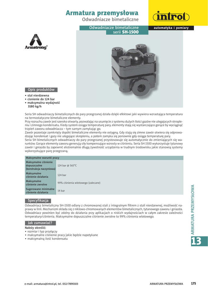 Armatura przemysłowa Odwadniacze bimetaliczne Odwadniacze bimetaliczne serii SH-1500 Opis produktów • stal nierdzewna • cisnienie do 124 bar • maksymalna wydajność 3180 kg/h Seria SH odwadniaczy bimetalicznych do pary przegrzanej działa dzięki efektowi jaki wywiera wzrastająca temperatura na termostatyczne bimetaliczne elementy. Przy rozruchu zawór jest szeroko otwarty, pozwalając na usunięcie z systemu dużych ilości gazów nie ulegajacych skropleniu i zimnego kondensatu. Kiedy system osiąga temperaturę pary, elementy stają się wystarczająco gorące by wyciągnąć trzpień zaworu odwadniacza – tym samym zamykając go. Zawór pozostaje zamknięty dopóki bimetaliczne elementy nie ostygną. Gdy stają się zimne zawór otwiera się odprowadzając kondensat i gazy nie ulegające skropleniu, a potem zamyka się ponownie gdy osiąga temperaturę pary. Seria SH bimetalicznych odwadniaczy do pary przegrzanej przystosowuje się automatycznie do zmieniających się warunków. Gorące elementy zaworu generują siły kompensujące wzrosty w ciśnieniu. Seria SH 1500 wykorzystuje tytanowy zawór i gniazdo by zapewnić ekstremalnie długą żywotność urządzenia w trudnym środowisku jakie stanowią systemy wykorzystujące parę przegrzaną. Maksymalne warunki pracy Maksymalne ciśnienie działania 124 bar Maksymalne ciśnienie zwrotne 99% ciśnienia wlotowego (zalecane) Sugerowane minimalne ciśnienie działania 14 bar Specyfikacja Odwadniacz bimetaliczny SH-1500 odlany z chromowanej stali z integralnym filtrem z stali nierdzewnej, możliwość naprawy w linii. Mechanizm składa się z niklowo-chromowanych elementów bimetalicznych, tytanowego zaworu i gniazda. Odwadniacz powinien być zdolny do działania przy aplikacjach o niskich wydajnościach w całym zakresie zależności temperatury/ciśnienia. Maksymalne dopuszczalne ciśnienie zwrotne to 99% ciśnienia wlotowego. Jak zamawiać? Należy określić: • rozmiar i typ przyłączy • maksymalne ciśnienie pracy jakie będzie napotykane • maksymalną ilość kondensatu e-mail: [email protected], tel. 032/7890103 ARMATURA PRZEMYSŁOWA Maksymalne ciśnienie dopuszczalne 124 bar @ 565°C (konstrukcja naczyniowa) 13 ARMATURA PRZEMYSŁOWA 175 Armatura przemysłowa Odwadniacze bimetaliczne ODWADNIACZ SERII SH-1500 8ZEBKOPw¿<LHI> ZALEŻNOŚĆ PRZEPŁYWU ZIMNEJ WODY OD CIŚNIENIA WYMIARY ' & 3ÌOJDBDJwOJFÊ<CBS> WSKAŹNIK CIŚNIENIE/TEMPERATURA 3ÌOJDBDJwOJFÊ<CBS> % % # ( $ 5FNQFSBUVSB <$> ARMATURA PRZEMYSŁOWA ODWADNIACZ SERII SH-1500* (wymiary w mm) 13 Wielkość przyłącza 20 25 „B” (wysokość spawanego lub spawanego doczolowo) 129 129 „C” (od czoła do czoła spawanego lub spawanego doczolowo) 157 157 „D” 98 98 „E” (szerokość) 123 123 „F” ( od czoła do czoła ANSI 1500#) 305 311 „G” (wysokość kołnierzowego ANSI 1500lbs) 163 173 Waga w kg (spawany lub spawaney doczolowo) 10,4 kg 10,4 kg Waga w kg (Kołnierzowy ANSI 1500#) 17,2 kg 18,1 kg *Standardowo kołnierze wykonane są ze stal węglowej, kołnierze ze stali nierdzewnej zostają wykonane jedynie na rządanie klienta. Inne rozmiary kołnierzy, charakterystyki i wymiary „od czoła do czoła” są dostępne na zapytanie. Wszystkie modele są zgodne z artykułem 3.3 PED (97/23/EC). ODWADNIACZ SERII SH-1500* – MATERIAŁY Przylącza 20 – 25: spawany, kołnierzowy, spawany doczołowo Materiał Korpus i pokrywa ASTM 217 Gr. C12A Zawór Titanium Gniazdo 176 Element bimetaliczny Nickel-chrome and stainless steel Filtr Stain Steel Screen ARMATURA PRZEMYSŁOWA tel. 032/7890103, e-mail: [email protected]