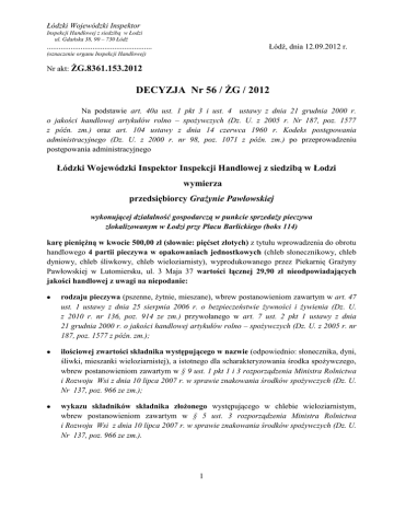 Łódzki Wojewódzki Inspektor Inspekcji Handlowej z siedzibą w Łodzi ul. Gdańska 38, 90 – 730 Łódź Łódź, dnia 12.09.2012 r. ..................................................... (oznaczenie organu Inspekcji Handlowej) Nr akt: ŻG.8361.153.2012 DECYZJA Nr 56 / ŻG / 2012 Na podstawie art. 40a ust. 1 pkt 3 i ust. 4 ustawy z dnia 21 grudnia 2000 r. o jakości handlowej artykułów rolno – spożywczych (Dz. U. z 2005 r. Nr 187, poz. 1577 z późn. zm.) oraz art. 104 ustawy z dnia 14 czerwca 1960 r. Kodeks postępowania administracyjnego (Dz. U. z 2000 r. nr 98, poz. 1071 z późn. zm.) po przeprowadzeniu postępowania administracyjnego Łódzki Wojewódzki Inspektor Inspekcji Handlowej z siedzibą w Łodzi wymierza przedsiębiorcy Grażynie Pawłowskiej wykonującej działalność gospodarczą w punkcie sprzedaży pieczywa zlokalizowanym w Łodzi przy Placu Barlickiego (boks 114) karę pieniężną w kwocie 500,00 zł (słownie: pięćset złotych) z tytułu wprowadzenia do obrotu handlowego 4 partii pieczywa w opakowaniach jednostkowych (chleb słonecznikowy, chleb dyniowy, chleb śliwkowy, chleb wieloziarnisty), wyprodukowanego przez Piekarnię Grażyny Pawłowskiej w Lutomiersku, ul. 3 Maja 37 wartości łącznej 29,90 zł nieodpowiadających jakości handlowej z uwagi na niepodanie: rodzaju pieczywa (pszenne, żytnie, mieszane), wbrew postanowieniom zawartym w art. 47 ust. 1 ustawy z dnia 25 sierpnia 2006 r. o bezpieczeństwie żywności i żywienia (Dz. U. z 2010 r. nr 136, poz. 914 ze zm.) przywołanego w art. 7 ust. 2 pkt 1 ustawy z dnia 21 grudnia 2000 r. o jakości handlowej artykułów rolno – spożywczych (Dz. U. z 2005 r. nr 187, poz. 1577 z późn. zm.); ilościowej zwartości składnika występującego w nazwie (odpowiednio: słonecznika, dyni, śliwki, mieszanki wieloziarnistej), a istotnego dla scharakteryzowania środka spożywczego, wbrew postanowieniom zawartym w § 9 ust. 1 pkt 1 i 3 rozporządzenia Ministra Rolnictwa i Rozwoju Wsi z dnia 10 lipca 2007 r. w sprawie znakowania środków spożywczych (Dz. U. Nr 137, poz. 966 ze zm.); wykazu składników składnika złożonego występującego w chlebie wieloziarnistym, wbrew postanowieniom zawartym w § 5 ust. 3 rozporządzenia Ministra Rolnictwa i Rozwoju Wsi z dnia 10 lipca 2007 r. w sprawie znakowania środków spożywczych (Dz. U. Nr 137, poz. 966 ze zm.). 1 Uzasadnienie W dniach od 22 do 23 maja 2012 r. na podstawie upoważnienia Łódzkiego Wojewódzkiego Inspektora Inspekcji Handlowej numer ŻG.8361.153.2012 z dnia 22.05.2012 r. inspektorzy Wojewódzkiego Inspektoratu Inspekcji Handlowej w Łodzi, przeprowadzili kontrolę w punkcie sprzedaży zlokalizowanym w Łodzi przy Pl. Barlickiego (boks 114), należącym do Grażyny Pawłowskiej. Kontrolę przeprowadzono na podstawie przepisów art. 3 ust. 1 - 3 rozporządzenia Parlamentu Europejskiego i Rady (WE) Nr 882/2004 z dnia 29 kwietnia 2004 r. w sprawie kontroli urzędowych przeprowadzanych w celu sprawdzenia zgodności z prawem paszowym i żywnościowym oraz regułami dotyczącymi zdrowia zwierząt i dobrostanu zwierząt (Dz. U. L 165 z 30.4.2004 ze zm.), art. 17 ust. 3 ustawy z dnia 21 grudnia 2000 r. o jakości handlowej artykułów rolno-spożywczych (Dz. U. z 2005 r. nr 187, poz. 1577, z późn. zm.), art. 3 ust. 1 pkt 1, 2 i 6 ustawy z dnia 15 grudnia 2000 r. o Inspekcji Handlowej (Dz. U. z 2009 r. Nr 151, poz. 1219 z późn. zm.) w obecności osoby upoważnionej (…). W toku kontroli stwierdzono, że do sprzedaży oferowano 4 partie pieczywa w opakowaniach jednostkowych, wyprodukowanego przez Piekarnię Grażyny Pawłowskiej w Lutomiersku, ul. 3 Maja 37: chleb słonecznikowy, o masie 450 g, oznaczony datą minimalnej trwałości „25 maj 2012” w ilości 6 sztuk w cenie 1,90 zł, chleb dyniowy, o masie 450 g, oznaczony datą minimalnej trwałości „26 maj 2012” w ilości 3 sztuk w cenie 2,10 zł, chleb śliwkowy, o masie 450 g, oznaczony datą minimalnej trwałości „26 maj 2012” w ilości 2 sztuk w cenie 2,10 zł, chleb wieloziarnisty, o masie 450 g, oznaczony datą minimalnej trwałości „26 maj 2012” w ilości 4 sztuk w cenie 2,00 zł, wartości łącznej 29,90 zł, dla których na opakowaniach nie podano: rodzaju pieczywa (pszenne, żytnie, mieszane), wbrew postanowieniom zawartym w art. 47 ust. 1 ustawy z dnia 25 sierpnia 2006 r. o bezpieczeństwie żywności i żywienia (Dz. U. z 2010 nr 136, poz. 914 ze zm.) zwanej dalej zwanej dalej „ustawą o bezpieczeństwie żywności i żywienia”, przywołanego w art. 7 ust. 2 pkt 1 ustawy z dnia 21 grudnia 2000 r. o jakości handlowej artykułów rolno – spożywczych (Dz. U. z 2005 r. nr 187, poz. 1577 z późn. zm.) zwanej dalej „ustawą o jakości”; ilościowej zwartości składnika występującego w nazwie (odpowiednio: słonecznika, dyni, śliwki, mieszanki wieloziarnistej), a istotnego dla scharakteryzowania środka spożywczego, wbrew postanowieniom zawartym w § 9 ust. 1 pkt 1 i 3 rozporządzenia Ministra Rolnictwa i Rozwoju Wsi z dnia 10 lipca 2007 r. w sprawie znakowania środków spożywczych (Dz. U. Nr 137, poz. 966 ze zm.) zwanego dalej „rozporządzeniem w sprawie znakowania środków spożywczych”; 2 wykazu składników składnika złożonego występującego w chlebie wieloziarnistym, wbrew postanowieniom zawartym w § 5 ust. 3 rozporządzenia w sprawie znakowania środków spożywczych. Nieprawidłowości te zostały udokumentowane w protokole kontroli numer ŻG.8361.153.2012 z dnia 22 maja 2012 r., w zestawieniu artykułów żywnościowych skontrolowanych pod względem oznakowania i na zdjęciach zrobionych w trakcie kontroli. W związku z powyższym w dniu 13 lipca 2012 r. zostało wszczęte z urzędu postępowanie administracyjne w przedmiocie wymierzenia, na podstawie art. 40 a ust. 1 pkt 3 ustawy o jakości, kary pieniężnej z tytułu wprowadzenia do obrotu środków spożywczych nieodpowiadających jakości handlowej. Strona została poinformowana o ws