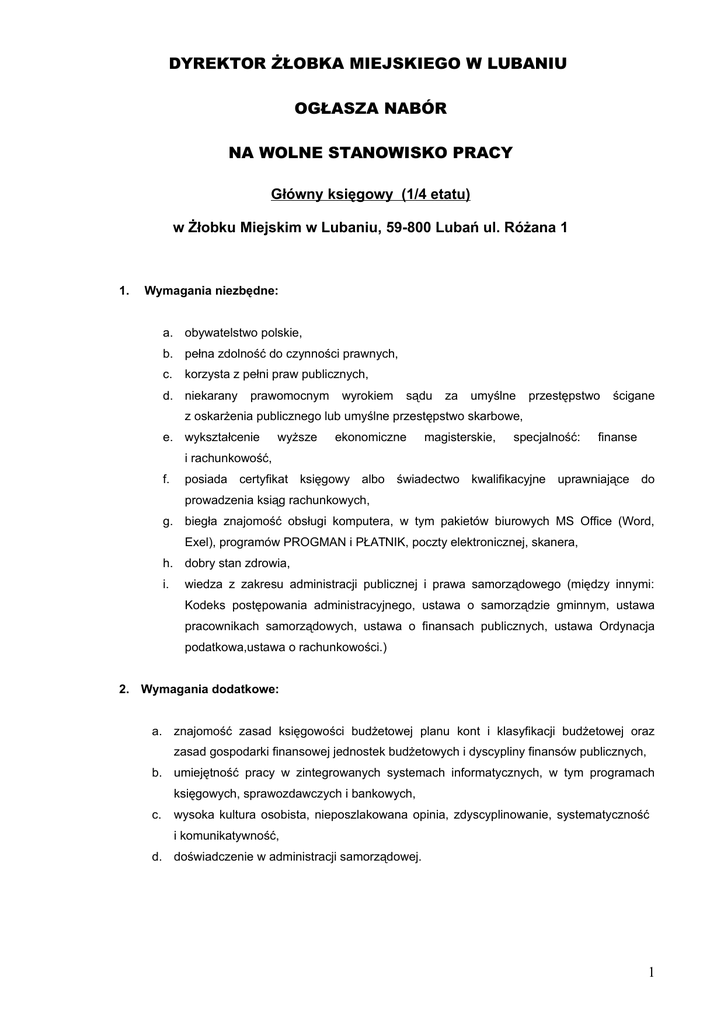 DYREKTOR ŻŁOBKA MIEJSKIEGO W LUBANIU OGŁASZA NABÓR NA WOLNE STANOWISKO PRACY Główny księgowy (1/4 etatu) w Żłobku Miejskim w Lubaniu, 59-800 Lubań ul. Różana 1 1. Wymagania niezbędne: a. obywatelstwo polskie, b. pełna zdolność do czynności prawnych, c. korzysta z pełni praw publicznych, d. niekarany prawomocnym wyrokiem sądu za umyślne przestępstwo ścigane z oskarżenia publicznego lub umyślne przestępstwo skarbowe, e. wykształcenie wyższe ekonomiczne magisterskie, specjalność: finanse i rachunkowość, f. posiada certyfikat księgowy albo świadectwo kwalifikacyjne uprawniające do prowadzenia ksiąg rachunkowych, g. biegła znajomość obsługi komputera, w tym pakietów biurowych MS Office (Word, Exel), programów PROGMAN i PŁATNIK, poczty elektronicznej, skanera, h. dobry stan zdrowia, i. wiedza z zakresu administracji publicznej i prawa samorządowego (między innymi: Kodeks postępowania administracyjnego, ustawa o samorządzie gminnym, ustawa pracownikach samorządowych, ustawa o finansach publicznych, ustawa Ordynacja podatkowa,ustawa o rachunkowości.) 2. Wymagania dodatkowe: a. znajomość zasad księgowości budżetowej planu kont i klasyfikacji budżetowej oraz zasad gospodarki finansowej jednostek budżetowych i dyscypliny finansów publicznych, b. umiejętność pracy w zintegrowanych systemach informatycznych, w tym programach księgowych, sprawozdawczych i bankowych, c. wysoka kultura osobista, nieposzlakowana opinia, zdyscyplinowanie, systematyczność i komunikatywność, d. doświadczenie w administracji samorządowej. 1 3. Zakres wykonywanych zadań i obowiązków na stanowisku: a. prowadzenie rachunkowości Żłobka Miejskiego w Lubaniu w Lubaniu zgodnie z obowiązującymi przepisami, b. prowadzenie, na podstawie dowodów księgowych, ksiąg rachunkowych, ujmujących zapisy zdarzeń w porządku chronologicznym i systematycznym, c. okresowe ustalanie lub sprawdzanie w drodze inwentaryzacji rzeczywistego stanu aktywów i pasywów, d. wycenę aktywów i pasywów oraz ustalanie wyniku finansowego, e. sporządzanie sprawozdań finansowych, g. gromadzenie i przechowywanie dowodów księgowych oraz pozostałej dokumentacji przewidzianej ustawą, h. wykonywanie dyspozycji środkami pieniężnymi z rachunków jednostki, i. dokonywanie kontroli operacji gospodarczych i finansowych z planem finansowym, j. dokonywanie wstępnej kontroli kompletności i rzetelności dokumentów dotyczących operacji gospodarczych i finansowych, k. sporządzanie bilansu, prowadzenie sprawozdawczości budżetowej i podatkowej, wykonywanie analiz, zestawień oraz prognoz kosztów i wydatków, l. roczne planowanie budżetu i analiza realizowania zadań, m. obsługa płacowa jednostki, n. współpraca z instytucjami zewnętrznymi (US, ZUS, GUS, NBP), o. przygotowywanie przelewów bankowych, p. naliczanie i wypłata wynagrodzeń, w tym naliczanie innych należności, zasiłków, prowadzenie stosownej ewidencji, dokonywanie potrąceń od wynagrodzeń, itp., q. terminowe naliczanie i odprowadzanie składek na ubezpieczenia społeczne i zdrowotne, Fundusz Pracy, a także prowadzenie ewidencji wymaganej przez ZUS, 4. Informacje o warunkach pracy na stanowisku głównego księgowego: a. zatrudnienie od dnia 15.09.2014 r. w wymiarze ¼ etatu, b. zatrudnienie po raz pierwszy następuje na czas określony nie dłuższy niż 6 miesięcy, c. w ramach którego pracownik odbywa służbę przygotowawczą, osoba ubiegająca się o przyjęcie na stanowisko głównego księgowego podlega obowiązkowym badaniom lekarskim, d. praca w podstawowym systemie czasu pracy, przeciętnie 10 godzin w przeciętnie 5-dniowym tygodniu pracy, w 1-miesięcznym okresie rozliczeniowym, e. praca jest wykonywana w Żłobku Miejskim w Lubaniu przy ul. Różanej 1. 5. W miesiącu sierpniu 2014 r. wskaźnik zatrudnienia osób niepełnosprawnych w Żłobku Miejskim w Lubaniu, w rozumieniu przepisów o rehabilitacji zawodowej i społecznej oraz zatrudnieniu osób niepełnosprawnych nie wynosił 6%. 2 6. Wymagane dokumenty: a. list motywacyjny, b. życiorys – curriculum vitae, c. kserokopie świadectw pracy, d. kserokopie dyplomów potwierdzających wykształcenie, e. kserokopie zaświadczeń o ukończonych kursach, szkoleniach, f. oryginał kwestionariusza osobowego dla osoby ubiegającej się o zatrudnienie – zgodnie z rozporządzeniem MPiPS z 28.05.1996 r. w sprawie zakresu prowadzenia przez pracodawców dokumentacji w sprawach związanych ze stosunkiem pracy oraz sposobu prowadzenia akt osobowych D.U. z 1996 r. Nr 62, poz.286 z późn. zm.), g. oświadczenie kandydata o braku przeciwwskazań zdrowotnych do pracy na stanowisku, na które prowadzony jest nabór, h. oświadczenie kandydata, że nie był prawomocnie skazany za przestępstwo umyślne ścigane z oskarżenia publicznego lub umyślne przestępstwo skarbowe i o tym, że nie toczy się w stosunku do niego żadne postępowanie karne, i. oświadczenie kandydata o tym, że posiada pełną zdolność do czynności prawnych oraz że korzysta z pełni praw publicznych, j. w przypadku osoby niepełnosprawnej kopie dokumentów potwierdzających niepełnosprawność, k. do dokumentów aplikacyjnych mogą być dołączone referencje w przypadku wcześniejszego zatrudnienia. Wymagane dokumenty aplikacyjne należy składać w zamkniętej kopercie w siedzibie Żłobka Miejskiego w Lubaniu; 59-800 Lubań ul. Różana 1 z dopiskiem: „Dotyczy naboru na stanowisko: główny księgowy w Żłobku Miejskim w Lubaniu” w terminie do dnia 11.09.2014 roku. Aplikacje, które wpłyną do Żłobka po wyżej określonym terminie nie będą rozpatrywane. Informacja o wyniku naboru będzie umieszczona na stronie internetowej Biuletynu Informacji Publicznej oraz na tablicy informacyjnej Żłobka Miejskiego w Lubaniu. Wymagane dokumenty aplikacyjne: list motywacyjny, szczegółowe CV (z uwzględnieniem dokładnego przebiegu kariery zawodowej), powinny być opatrzone klauzulą: 