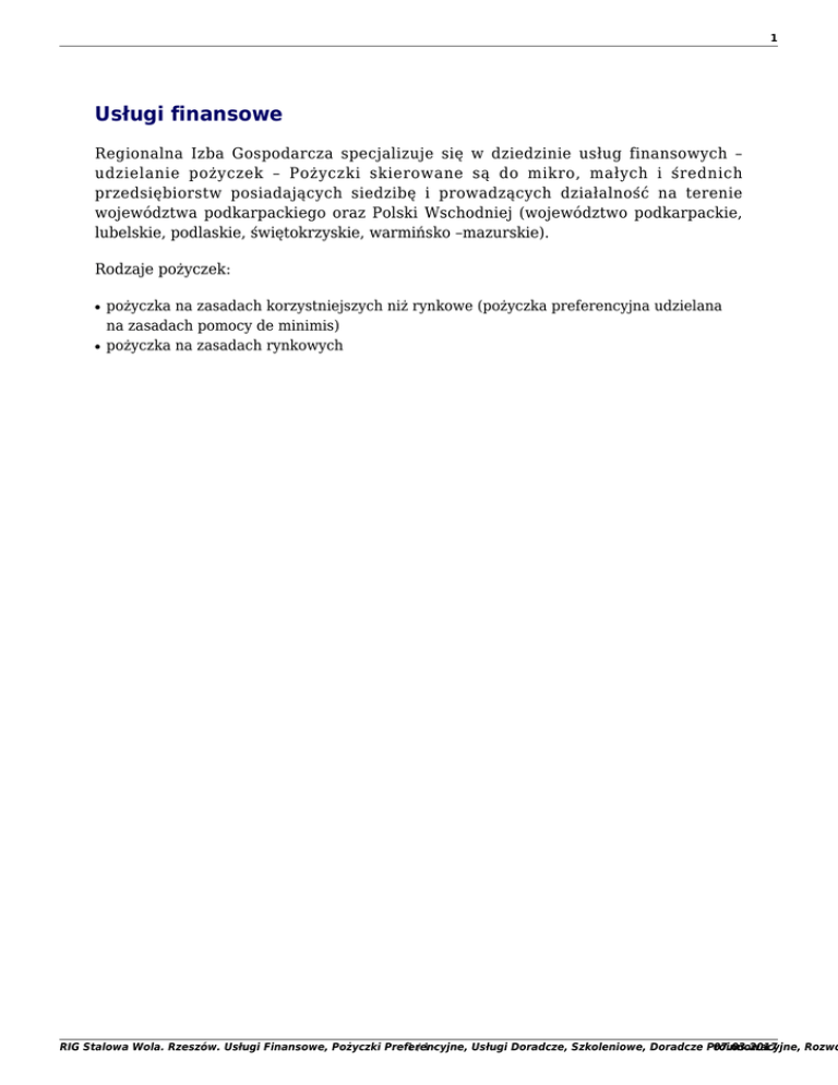 1 Usługi finansowe Regionalna Izba Gospodarcza specjalizuje się w dziedzinie usług finansowych – udzielanie pożyczek – Pożyczki skierowane są do mikro, małych i średnich przedsiębiorstw posiadających siedzibę i prowadzących działalność na terenie województwa podkarpackiego oraz Polski Wschodniej (województwo podkarpackie, lubelskie, podlaskie, świętokrzyskie, warmińsko –mazurskie). Rodzaje pożyczek: ● ● pożyczka na zasadach korzystniejszych niż rynkowe (pożyczka preferencyjna udzielana na zasadach pomocy de minimis) pożyczka na zasadach rynkowych RIG Stalowa Wola. Rzeszów. Usługi Finansowe, Pożyczki Preferencyjne, -1/1Usługi Doradcze, Szkoleniowe, Doradcze Proinnowacyjne, 07.03.2017 Rozwó