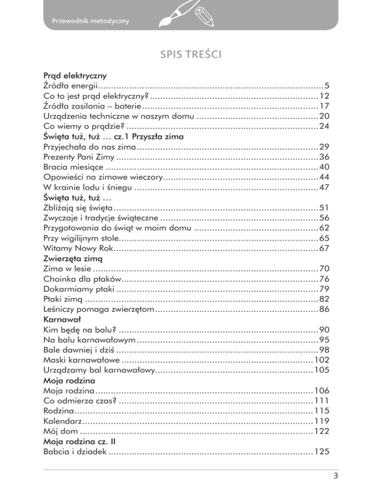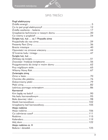 Przewodnik metodyczny ✎ Spis treści Prąd elektryczny Źródła energii........................................................................................5 Co to jest prąd elektryczny?..................................................................12 Źródła zasilania – baterie.....................................................................17 Urządzenia techniczne w naszym domu................................................20 Co wiemy o prądzie?...........................................................................24 Święta tuż, tuż … cz.1 Przyszła zima Przyjechała do nas zima.......................................................................29 Prezenty Pani Zimy...............................................................................36 Bracia miesiące...................................................................................40 Opowieści na zimowe wieczory.............................................................44 W krainie lodu i śniegu........................................................................47 Święta tuż, tuż … Zbliżają się święta................................................................................51 Zwyczaje i tradycje świąteczne..............................................................56 Przygotowania do świąt w moim domu.................................................62 Przy wigilijnym stole.............................................................................65 Witamy Nowy Rok................................................................................67 Zwierzęta zimą Zima w lesie........................................................................................70 Choinka dla ptaków.............................................................................76 Dokarmiamy ptaki...............................................................................79 Ptaki zimą...........................................................................................82 Leśniczy pomaga zwierzętom................................................................86 Karnawał Kim będę na balu?..............................................................................90 Na balu karnawałowym.......................................................................95 Bale dawniej i dziś...............................................................................98 Maski karnawałowe...........................................................................102 Urządzamy bal karnawałowy..............................................................105 Moja rodzina Moja rodzina.....................................................................................106 Co odmierza czas?............................................................................111 Rodzina.............................................................................................115 Kalendarz..........................................................................................119 Mój dom...........................................................................................122 Moja rodzina cz. II Babcia i dziadek................................................................................125 3 Przewodnik metodyczny ✎ Niespodzianka dla babci....................................................................129 Niespodzianka dla dziadka................................................................133 Pomagamy starszym..........................................................................135 Święto babci i dziadka.......................................................................138 Zabawy na śniegu Zima dookoła....................................................................................140 Zimowy świat.....................................................................................145 Zimowe wyliczanki.............................................................................148 Bezpieczne zabawy zimą....................................................................153 Zima w górach..................................................................................157 Zabawy na śniegu cz. II Zabawy zimowe.................................................................................161 Lepimy bałwana................................................................................166 Zabawy z bałwankiem.......................................................................171 Gdzie mieszkają Eskimosi?.................................................................175 Zwierzęta Grenlandii..........................................................................178 W kosmosie Poznajemy Układ Słoneczny...............................................................182 Mikołaj Kopernik...............................................................................187 Zwiedzamy planety............................................................................192 Spotkanie z Ufoludkiem.....................................................................196 Podróż na Księżyc..............................................................................198 Zwierzęta egzotyczne Sawanna...........................................................................................202 Dżungla............................................................................................206 Zwierzęta egzotyczne.........................................................................210 Zwierzęta mieszkające w ZOO...........................................................213 Zwierzęta egzotyczne i krajowe...........................................................216 W marcu jak w garncu Marcowa pogoda..............................................................................221 Żegnaj bałwanku!..............................................................................228 Marzec czarodziej...............................................................