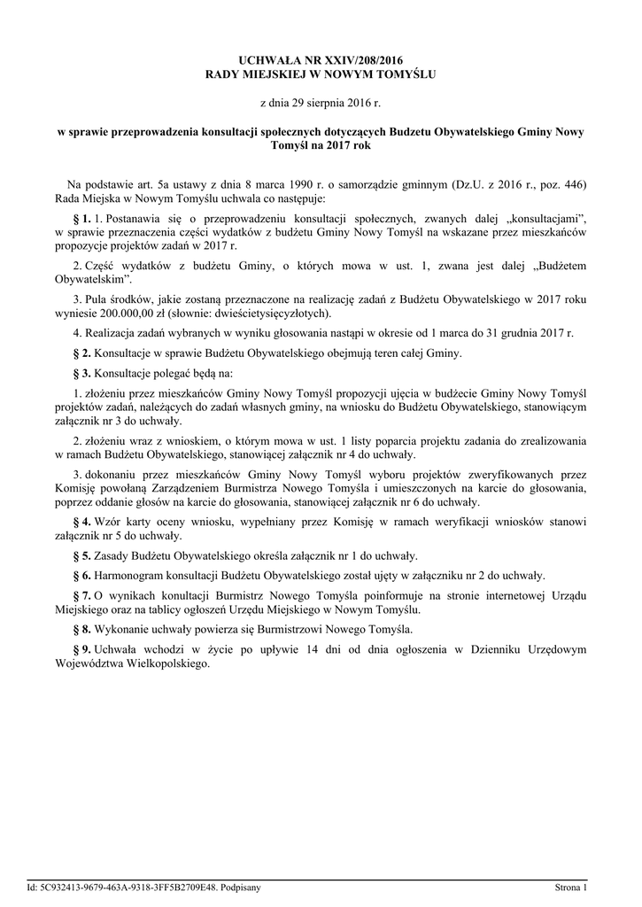 UCHWAŁA NR XXIV/208/2016 RADY MIEJSKIEJ W NOWYM TOMYŚLU z dnia 29 sierpnia 2016 r. w sprawie przeprowadzenia konsultacji społecznych dotyczących Budzetu Obywatelskiego Gminy Nowy Tomyśl na 2017 rok Na podstawie art. 5a ustawy z dnia 8 marca 1990 r. o samorządzie gminnym (Dz.U. z 2016 r., poz. 446) Rada Miejska w Nowym Tomyślu uchwala co następuje: § 1. 1. Postanawia się o przeprowadzeniu konsultacji społecznych, zwanych dalej „konsultacjami”, w sprawie przeznaczenia części wydatków z budżetu Gminy Nowy Tomyśl na wskazane przez mieszkańców propozycje projektów zadań w 2017 r. 2. Część wydatków z budżetu Gminy, o których mowa w ust. 1, zwana jest dalej „Budżetem Obywatelskim”. 3. Pula środków, jakie zostaną przeznaczone na realizację zadań z Budżetu Obywatelskiego w 2017 roku wyniesie 200.000,00 zł (słownie: dwieścietysięcyzłotych). 4. Realizacja zadań wybranych w wyniku głosowania nastąpi w okresie od 1 marca do 31 grudnia 2017 r. § 2. Konsultacje w sprawie Budżetu Obywatelskiego obejmują teren całej Gminy. § 3. Konsultacje polegać będą na: 1. złożeniu przez mieszkańców Gminy Nowy Tomyśl propozycji ujęcia w budżecie Gminy Nowy Tomyśl projektów zadań, należących do zadań własnych gminy, na wniosku do Budżetu Obywatelskiego, stanowiącym załącznik nr 3 do uchwały. 2. złożeniu wraz z wnioskiem, o którym mowa w ust. 1 listy poparcia projektu zadania do zrealizowania w ramach Budżetu Obywatelskiego, stanowiącej załącznik nr 4 do uchwały. 3. dokonaniu przez mieszkańców Gminy Nowy Tomyśl wyboru projektów zweryfikowanych przez Komisję powołaną Zarządzeniem Burmistrza Nowego Tomyśla i umieszczonych na karcie do głosowania, poprzez oddanie głosów na karcie do głosowania, stanowiącej załącznik nr 6 do uchwały. § 4. Wzór karty oceny wniosku, wypełniany przez Komisję w ramach weryfikacji wniosków stanowi załącznik nr 5 do uchwały. § 5. Zasady Budżetu Obywatelskiego określa załącznik nr 1 do uchwały. § 6. Harmonogram konsultacji Budżetu Obywatelskiego został ujęty w załączniku nr 2 do uchwały. § 7. O wynikach konultacji Burmistrz Nowego Tomyśla poinformuje na stronie internetowej Urządu Miejskiego oraz na tablicy ogłoszeń Urzędu Miejskiego w Nowym Tomyślu. § 8. Wykonanie uchwały powierza się Burmistrzowi Nowego Tomyśla. § 9. Uchwała wchodzi w życie po upływie 14 dni od dnia ogłoszenia w Dzienniku Urzędowym Województwa Wielkopolskiego. Id: 5C932413-9679-463A-9318-3FF5B2709E48. Podpisany Strona 1 Załącznik nr 1 do uchwały Nr XXIV/208/2016 Rady Miejskiej w Nowym Tomyślu z dnia 29.08.2016 r. Zasady Budżetu Obywatelskiego Gminy Nowy Tomyśl na 2017 rok Rozdział 1 Postanowienia ogólne 1. Konsultacje społeczne w sprawie części wydatków z budżetu gminy określane są jako Budżet Obywatelski. 2. Z Budżetu Obywatelskiego mogą być finansowane przedsięwzięcia wchodzące w zakres zadań własnych gminy, w rozumieniu ustawy o samorządzie gminnym, które są możliwe do sfinansowania i zrealizowania w trakcie jednego roku budżetowego. 3. Zgłoszona propozycja zadania do Budżetu Obywatelskiego może mieć charakter wyłącznie inwestycyjny (z wyłączeniem zadań o charakterze remontowym). 4. Zadanie, o którym mowa w rozdziale 1 punkt 3 może być realizowane wyłącznie na terenie będącym własnością Gminy Nowy Tomyśl. 5. Pula środków, jakie zostaną przeznaczone na realizację zadań z Budżetu Obywatelskiego w 2017 roku wyniesie 200 000,00 zł, z zastrzeżeniem, że szacunkowy koszt realizacji jednego zgłoszonego zadania nie może przekroczyć kwoty 50.000,00 zł. 6. Zadania wybrane w wyniku głosowania mogą być realizowane w okresie od 1 marca do 31 grudnia 2017 r. Rozdział 2 Zasady i tryb zgłaszania zadań 1. Propozycję projektu zadania do zrealizowania w ramach Budżetu Obywatelskiego może zgłosić każdy mieszkaniec Gminy Nowy Tomyśl, który ukończył 16 rok życia, pod warunkiem uzyskania już na etapie zgłaszania poparcia co najmniej 20 mieszkańców Gminy wpisanych do rejestru wyborców na terenie Gminy Nowy Tomyśl. Lista poparcia projektu zadania do zrealizowania w ramach Budżetu Obywatelskiego Gminy Nowy Tomyśl na 2017 rok stanowi załącznik nr 4 do uchwały. 2. Jedna osoba może zgłosić jedną propozycję zadania. 3. Wniosek do Budżetu Obywatelskiego stanowi załącznik nr 3 do uchwały i jest dostępny na stronie internetowej Urzędu Miejskiego w Nowym Tomyślu: www.nowytomysl.pl oraz w Biurze Obsługi Mieszkańca Urzędu Miejskiego w Nowym Tomyślu. 4. Wypełniony wniosek w wersji papierowej należy złożyć w Biurze Obsługi Mieszkańca Urzędu Miejskiego w Nowym Tomyślu lub przesłać pocztą na adres: Urząd Miejski w Nowym Tomyślu, ul. Poznańska 33, 64-300 Nowy Tomyśl z dopiskiem „Budżet Obywatelski 2017”. Id: 5C932413-9679-463A-9318-3FF5B2709E48. Podpisany Strona 1 5. Wniosek uznaje się za ważny jeżeli zostanie wypełniony w każdym punkcie, podpisany i dostarczony do Urzędu Miejskiego w Nowym Tomyślu w terminie od 1 do 31 października 2016 r. W przypadku wysyłki pocztą tradycyjną decyduje data wpływu do Urzędu Miejskiego w Nowym Tomyślu. 6. Wnioski dostarczone w innym terminie nie będą rozpatrywane. 7. Osoby składające wypełnione wnioski wyrażają zgodę na przetwarzanie własnych danych osobowych na potrzeby opracowania Budżetu Obywatelskiego Gminy Nowy Tomyśl na 2017 rok. Rozdział 3 Weryfikacja propozycji zadań 1 Propozycje zadań zostaną zweryfikowane przez Komisję do przeprowadzenia konsultacji dotyczących Budżetu Obywatelskiego Gminy Nowy Tomyśl na rok 2017 r., zwaną dalej Komisją, powołaną Zarządzeniem Burmistrza Nowego Tomyśla wg kryteriów zawartych w karcie oceny wniosku stanowiącej załącznik nr 5 do uchwały, przy współpracy z merytorycznymi wydziałami Urzędu Miejskiego w Nowym Tomyślu i jednostkami organizacyjnymi Gminy. 2. Komisja może kontaktować si