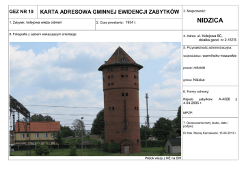 GEZ NR 19 KARTA ADRESOWA GMINNEJ EWIDENCJI ZABYTKÓW 1. Zabytek: kolejowa wieża ciśnień 3. Miejscowość: NIDZICA 2. Czas powstania: 1934 r. 8. Fotografia z opisem wskazującym orientację: 4. Adres: ul. Kolejowa 8C, działka geod. nr 2-157/5 5. Przynależność administracyjna: województwo: warmińsko-mazurskie powiat: nidzicki gmina: Nidzica 6. Formy ochrony: Rejestr zabytków: A-4326 z 4.04.2005 r. MPZP: 7. Opracowanie karty (autor, data i podpis): Dr hab. Maciej Karczewski, 15.06.2013 r. Widok wieży z NE na SW