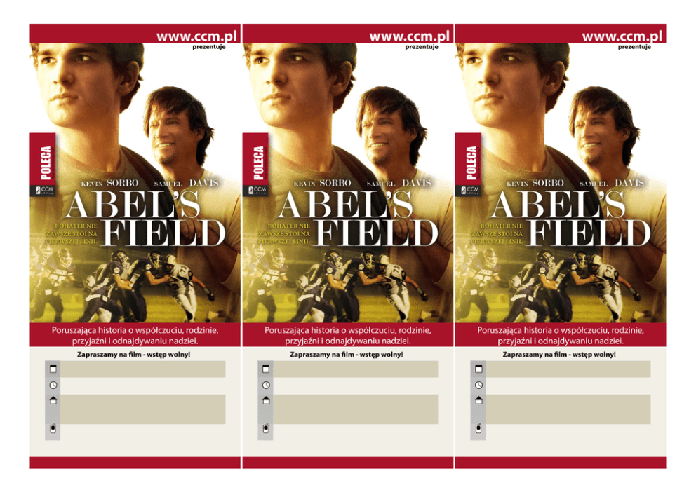 www.ccm.pl www.ccm.pl KEVIN SAMUEL ABEL S FIELD BOHATER NIE ZAWSZE STOI NA PIERWSZEJ LINII. KEVIN SAMUEL DAVIS ABEL S FIELD BOHATER NIE ZAWSZE STOI NA PIERWSZEJ LINII. Kup na www..ccm.pl SORBO prezentuje POLECA DAVIS Kup na www..ccm.pl SORBO www.ccm.pl prezentuje POLECA Kup na www..ccm.pl POLECA prezentuje KEVIN SORBO SAMUEL DAVIS ABEL S FIELD BOHATER NIE ZAWSZE STOI NA PIERWSZEJ LINII. Poruszająca historia o współczuciu, rodzinie, przyjaźni i odnajdywaniu nadziei. Poruszająca historia o współczuciu, rodzinie, przyjaźni i odnajdywaniu nadziei. Poruszająca historia o współczuciu, rodzinie, przyjaźni i odnajdywaniu nadziei. Zapraszamy na film - wstęp wolny! Zapraszamy na film - wstęp wolny! Zapraszamy na film - wstęp wolny!