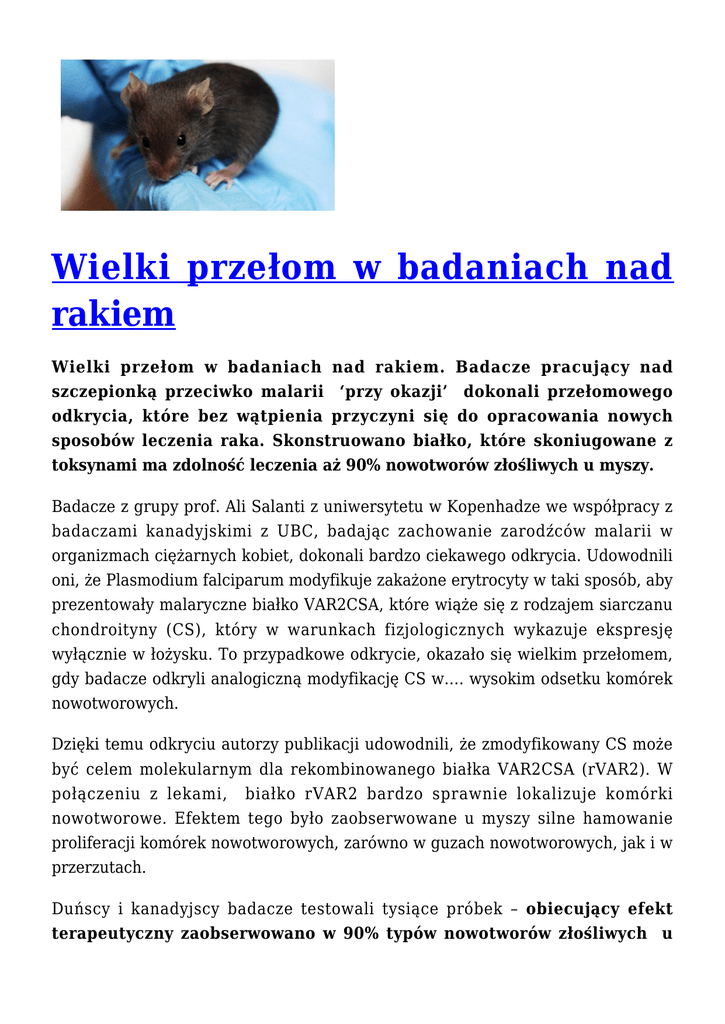 Wielki przełom w badaniach nad rakiem Wielki przełom w badaniach nad rakiem. Badacze pracujący nad szczepionką przeciwko malarii ‘przy okazji’ dokonali przełomowego odkrycia, które bez wątpienia przyczyni się do opracowania nowych sposobów leczenia raka. Skonstruowano białko, które skoniugowane z toksynami ma zdolność leczenia aż 90% nowotworów złośliwych u myszy. Badacze z grupy prof. Ali Salanti z uniwersytetu w Kopenhadze we współpracy z badaczami kanadyjskimi z UBC, badając zachowanie zarodźców malarii w organizmach ciężarnych kobiet, dokonali bardzo ciekawego odkrycia. Udowodnili oni, że Plasmodium falciparum modyfikuje zakażone erytrocyty w taki sposób, aby prezentowały malaryczne białko VAR2CSA, które wiąże się z rodzajem siarczanu chondroityny (CS), który w warunkach fizjologicznych wykazuje ekspresję wyłącznie w łożysku. To przypadkowe odkrycie, okazało się wielkim przełomem, gdy badacze odkryli analogiczną modyfikację CS w…. wysokim odsetku komórek nowotworowych. Dzięki temu odkryciu autorzy publikacji udowodnili, że zmodyfikowany CS może być celem molekularnym dla rekombinowanego białka VAR2CSA (rVAR2). W połączeniu z lekami, białko rVAR2 bardzo sprawnie lokalizuje komórki nowotworowe. Efektem tego było zaobserwowane u myszy silne hamowanie proliferacji komórek nowotworowych, zarówno w guzach nowotworowych, jak i w przerzutach. Duńscy i kanadyjscy badacze testowali tysiące próbek – obiecujący efekt terapeutyczny zaobserwowano w 90% typów nowotworów złośliwych u myszy – były wśród guzy mózgu, różne typy białaczki, chłoniaki, nowotwory kości. Wielki przełom w badaniach nad rakiem źródło wikimedia commons/własny fotomontaż Między innymi, leczenie przetestowano na myszach, którym wszczepiono trzy typy nowotworów człowieka. W przypadku chłoniaka nieziarniczego, guzy myszy leczonych były o 75% mniejsze niż w grupie kontrolnej. W przypadku raka prostaty – guzy nowotworowe całkowicie zniknęły u dwóch z sześciu leczonych myszy w miesiąc po otrzymaniu pierwszej dawki. W przypadku przerzutów do kości –pięć z sześciu leczonych myszy żyło aż po ośmiu tygodniach, gdy tymczasem, żadna z nieleczonych myszy z grupy kontrolnej w tym czasie już nie żyła. Testy z udziałem ludzi planowane są do dwóch lat. Z oczywistych powodów leczenie nie będzie dostępne w przypadku kobiet ciężarnych. Onformacja źródłowa: http://news.ku.dk/all_news/2015/10/malaria-vaccine-provides-hope-for-a-general-c ure-for-cancer/ Publikacja: Salanti et al. Targeting Human Cancer by a Glycosaminoglycan Binding Malaria Protein http://www.sciencedirect.com/science/article/pii/S1535610815003347 MikroRNA w terapii nowotworów (II) — o miRNA i nowotworzeniu MikroRNA spełniają kluczową rolę w regulacji ekspresji genów. Następstwa nieprawidłowej specyficznej ekspresji tych cząstek odgrywają niebagatelną rolę w patogenezie wielu chorób serca, chorób immunologicznych oraz, co jest szczególnie interesujące — nowotworów. Warto zatem przyjrzeć się im bliżej. Rola w procesie nowotworzenia Ponieważ mikroRNA bierze udział w wielu bardzo istotnych dla komórek organizmu procesach-ich namnażaniu, różnicowaniu oraz apoptozie, nieprawidłowości w jego działaniu nie pozostają obojętne dla całego organizmu. [2] Badacze sądzą obecnie, że mogą one odgrywać istotną rolę w inicjacji i rozwoju chorób nowotworowych. Co powoduje rozwój nowotworu? Z jednej strony może to być uaktywnienie genów onkogennych, z drugiej zaś wyciszenie genów supresorowych. W pierwszej sytuacji uczestniczyć mogą mikroRNA, których geny uległy delecji lub wyciszeniu. [2]. Jeśli odpowiadają one za regulację protoonkogenów, może podówczas wystąpić efekt onkogenny. W drugim przypadku przyczyną nowotworzenia jest stan rzeczy, w którym mamy do czynienia z amplifikacją lub wzrostem ekspresji mikroRNA odpowiadającego za regulację ekspresji genu supresorowego. Tutaj warto zapoznać się z pojęciem onkomirów, czyli mikroRNA funkcjonujących jako onkogeny lub geny supresorowe. Jak sytuacja wygląda w praktyce? Znanych jest obecnie szereg schorzeń nowotworowych, w których powstawaniu i rozwoju mikroRNA ma swój niebagatelny udział.[2] Pierwsze doniesienie tego typu dotyczyło badanie przewlekłej białaczki limfatycznej. Kolejne nowotwory, których występowanie ma związek ze zmianami w ekspresji mikroRNA to chłoniak Burkitta, chłoniak Hodgkina oraz rozlane chłoniaki z dużych limfocytów B. [1] Badania w tej dziedzinie nadal trwają. Obecnie sądzi się, że zmienione mikroRNA występuje w każdym rodzaju nowotworu. Dwa oblicza małej cząsteczki — istota tkwi w szczegółach Ze względu na unikatowy dla każdego guza profil ekspresji mikroRNA oraz brak skomplikowanych modyfikacji transkrypcyjnych i translacyjnych w stosunku do mRNA i białek, zastosowanie mikroRNA jako biomarkerów ma duży potencjał. Za przykład może tu posłużyć analiza regionu chromosomowego 13q14. U ponad połowy wszystkich pacjentów cierpiących na B-komórkową przewlekłą białaczkę limfatyczną region ten ulega delecji. Stwierdzono, że u ok. 68% pacjentów mikroR‐15a oraz mikroR‐16a były w związku z tym nieobecne albo ich ilość uległa zmniejszeniu. Jedne z pierwszych badań dotyczących mikroRNA w guzach litych wykazały różnice w ekspresji tych cząstek w przypadku gruczolaka okrężnicy oraz w prawidłowych komórkach błony śluzowej. Również poziom mikroR-143 i miroR-145 były znacznie niższe w przypadku guza niż normalnych komórek. Inne badania wykazały specyficzne sygnatury ekspresji mikroRNA w przypadku takich nowotworów jak: rak piersi, pierwotny glejak, rak wątrobowokomórkowy, rak brodawkowaty tarczycy oraz rak płuc. W badaniach przeprowadzonych na 540 próbkach sześciu nowotworów (płuc, żołądka, piersi, trzustki oraz jelita grubego) stwierdzono różnicę w regulacji