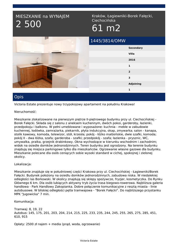 MIESZKANIE na WYNAJEM 2 500 Kraków, Łagiewniki-Borek Fałęcki, Ciechocińska 61 m2 1445/3814/OMW Secondary Villa 2016 1 2 3 Adjoining 1 Opis Victoria Estate prezentuje nowy trzypokojowy apartament na południu Krakowa! Nieruchomość: Mieszkanie zlokalizowane na pierwszym piętrze II-piętrowego budynku przy ul. Ciechocińskiej Borek Fałęcki. Składa się z salonu z aneksem kuchennym, dwóch pokoi, garderoby, łazienki, przedpokoju i balkonu. W pełni umeblowane i wyposażone: kuchnia - meble w zabudowie kuchennej, lodówka, zamrażarka, piekarnik, płyta indukcyjna, okap, zmywarka; salon - kanapa, stolik kawowy, komoda, telewizor, stół, krzesła; pokój - łóżko małżeńskie, dwie szafki, komoda; pokój II - dwa łóżka, szafa; garderoba - szafki; przedpokój - szafa; łazienka - prysznic, WC, umywalka, pralka, grzejnik drabinkowy. Okna wychodzące w kierunku wschodnim i zachodnim; widok na osiedle domków jednorodzinnych. Teren budynku jest ogrodzony. Na terenie budynku znajdują się miejsca parkingowe tylko dla mieszkańców. Ogrzewanie własne gazowe dla budynku. Mieszkanie polecane dla osób ceniących sobie wysoki standard w cichej, spokojnej i zielonej okolicy. Lokalizacja: Mieszkanie znajduje się w południowej części Krakowa przy ul. Ciechocińskiej - Łagiewniki/Borek Fałęcki. Budynek położony na osiedlu domków jednorodzinnych, zabudowa niska. W niedalekiej odległości las Borkowski. W okolicy znajdują się sklepy spożywcze, fryzjer, kosmetyczka. Do Rynku Głównego 6 km. Dla osób lubiących aktywny tryb życia trasa biegowo-rowerowa. Najbliższa galeria handlowa - Park Handlowy Zakopianka. Dobre połączenie komunikacyjne z resztą miasta - linie autobusowe. W bliskiej odległości pętla tramwajowa - "Borek Fałęcki". Do najbliższego przystanku MPK "Jugowicka" 7 min. Komunikacja: Tramwaj: 8, 19, 22 Autobus: 145, 175, 201, 203, 204, 214, 215, 225, 233, 235, 244, 245, 255, 265, 275, 285, 451, 610, 915 Opłaty: 2500 zł najem + media (prąd, woda, ogrzewanie) Victoria Estate Serdecznie polecam! Paulina Zajdel tel. +48 789 453 049 email: [email protected] Victoria Estate Powered by TCPDF (www.tcpdf.org)