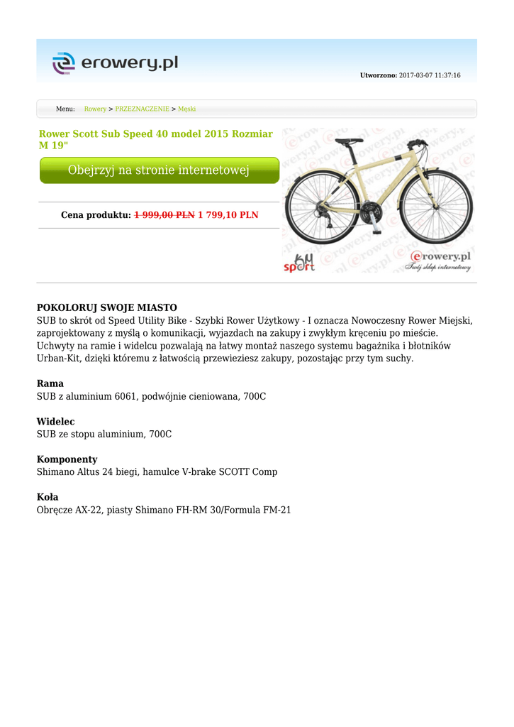 Utworzono: 2017-03-07 11:37:16 Menu: Rowery > PRZEZNACZENIE > Męski Rower Scott Sub Speed 40 model 2015 Rozmiar M 19" Obejrzyj na stronie internetowej Cena produktu: 1 999,00 PLN 1 799,10 PLN POKOLORUJ SWOJE MIASTO SUB to skrót od Speed Utility Bike - Szybki Rower Użytkowy - I oznacza Nowoczesny Rower Miejski, zaprojektowany z myślą o komunikacji, wyjazdach na zakupy i zwykłym kręceniu po mieście. Uchwyty na ramie i widelcu pozwalają na łatwy montaż naszego systemu bagażnika i błotników Urban-Kit, dzięki któremu z łatwością przewieziesz zakupy, pozostając przy tym suchy. Rama SUB z aluminium 6061, podwójnie cieniowana, 700C Widelec SUB ze stopu aluminium, 700C Komponenty Shimano Altus 24 biegi, hamulce V-brake SCOTT Comp Koła Obręcze AX-22, piasty Shimano FH-RM 30/Formula FM-21 Rozmiary ram Klamki hamulców Hamulce Mechanizm korbowy Oś korbowodu Prowadzenie łańcucha Kierownica Mostek/ Wspornik kierownicy Shimano ST-EF 51A SCOTT Comp V-brake Shimano FC-M171 48x38x28 T FP-B902 Syncros UC3.0 620mm, 15° bend Syncros UC3.0 31.8mm Pedały SP-822 Sztyca Syncros UC3.0, 31.6mm Siodło Syncros Urban X, VL-4234 Przeznaczenie Piasta przód Męski Formula FM-21 Piasta tył Shimano FH-RM 30 Łańcuch KMC Z-7 Kaseta/ wolnobieg Shimano CS-HG31, 11-32T Szprychy Stainless black, 14G/2mm Obręcze AX-22, 32H, CNC Opony Wyposażenie dodatkowe Schwalbe Citizen 700 × 37C - Typ roweru Szosowy Waga 12,40kg Tylny amortyzator /Damper Rozmiar kół Sezon Rodzina Rama Widelec/amortyzator Stery Przerzutka przód Przerzutka tył Manetki Kolor Producent 28" 2015 SUB double butted 6061 Alloy, 700c New SUB Alloy, 700C VP semi integrated Shimano FD-M191 34.9mm clamp Shimano RD-M 370 24 Speed Shimano ST-EF 51A L / 8R EZ-fire plus Kremowy_#f2ca6d Scott Mimo dołożenia wszelkich starań nie gwarantujemy, że publikowane opisy i specyfikacje techniczne niezawierają uchybień lub błędów, które nie mogą jednak być podstawą do roszczeń. W przypadku jakichkolwiek wątpliwości, przed podjęciem decyzji prosimy o kontakt. Adres: www.erowery.pl Telefon: 605 515 185, 34 361 16 71 Email: [email protected]