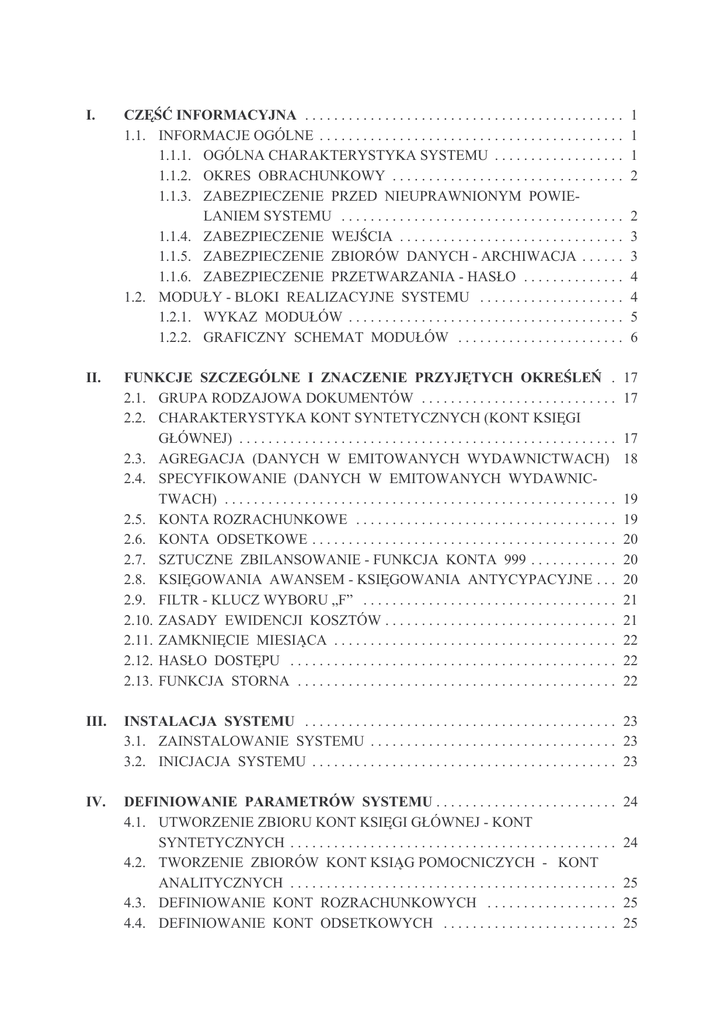 I. II. CZ INFORMACYJNA . . . . . . . . . . . . . . . . . . . . . . . . . . . . . . . . . . . . . . . . . . . . 1.1. INFORMACJE OGÓLNE . . . . . . . . . . . . . . . . . . . . . . . . . . . . . . . . . . . . . . . . . . 1.1.1. OGÓLNA CHARAKTERYSTYKA SYSTEMU . . . . . . . . . . . . . . . . . . 1.1.2. OKRES OBRACHUNKOWY . . . . . . . . . . . . . . . . . . . . . . . . . . . . . . . . 1.1.3. ZABEZPIECZENIE PRZED NIEUPRAWNIONYM POWIELANIEM SYSTEMU . . . . . . . . . . . . . . . . . . . . . . . . . . . . . . . . . . . . . . . 1.1.4. ZABEZPIECZENIE WEJ CIA . . . . . . . . . . . . . . . . . . . . . . . . . . . . . . . 1.1.5. ZABEZPIECZENIE ZBIORÓW DANYCH - ARCHIWACJA . . . . . . 1.1.6. ZABEZPIECZENIE PRZETWARZANIA - HASŁO . . . . . . . . . . . . . . 1.2. MODUŁY - BLOKI REALIZACYJNE SYSTEMU . . . . . . . . . . . . . . . . . . . . 1.2.1. WYKAZ MODUŁÓW . . . . . . . . . . . . . . . . . . . . . . . . . . . . . . . . . . . . . . 1.2.2. GRAFICZNY SCHEMAT MODUŁÓW . . . . . . . . . . . . . . . . . . . . . . . 1 1 1 2 FUNKCJE SZCZEGÓLNE I ZNACZENIE PRZYJ TYCH OKRE LE . 2.1. GRUPA RODZAJOWA DOKUMENTÓW . . . . . . . . . . . . . . . . . . . . . . . . . . . 2.2. CHARAKTERYSTYKA KONT SYNTETYCZNYCH (KONT KSI GI GŁÓWNEJ) . . . . . . . . . . . . . . . . . . . . . . . . . . . . . . . . . . . . . . . . . . . . . . . . . . . . 2.3. AGREGACJA (DANYCH W EMITOWANYCH WYDAWNICTWACH) 2.4. SPECYFIKOWANIE (DANYCH W EMITOWANYCH WYDAWNICTWACH) . . . . . . . . . . . . . . . . . . . . . . . . . . . . . . . . . . . . . . . . . . . . . . . . . . . . . . 2.5. KONTA ROZRACHUNKOWE . . . . . . . . . . . . . . . . . . . . . . . . . . . . . . . . . . . . 2.6. KONTA ODSETKOWE . . . . . . . . . . . . . . . . . . . . . . . . . . . . . . . . . . . . . . . . . . 2.7. SZTUCZNE ZBILANSOWANIE - FUNKCJA KONTA 999 . . . . . . . . . . . . 2.8. KSI GOWANIA AWANSEM - KSI GOWANIA ANTYCYPACYJNE . . . 2.9. FILTR - KLUCZ WYBORU „F” . . . . . . . . . . . . . . . . . . . . . . . . . . . . . . . . . . . 2.10. ZASADY EWIDENCJI KOSZTÓW . . . . . . . . . . . . . . . . . . . . . . . . . . . . . . . . 2.11. ZAMKNI CIE MIESI CA . . . . . . . . . . . . . . . . . . . . . . . . . . . . . . . . . . . . . . . 2.12. HASŁO DOST PU . . . . . . . . . . . . . . . . . . . . . . . . . . . . . . . . . . . . . . . . . . . . . 2.13. FUNKCJA STORNA . . . . . . . . . . . . . . . . . . . . . . . . . . . . . . . . . . . . . . . . . . . . 17 17 2 3 3 4 4 5 6 17 18 19 19 20 20 20 21 21 22 22 22 III. INSTALACJA SYSTEMU . . . . . . . . . . . . . . . . . . . . . . . . . . . . . . . . . . . . . . . . . . . 23 3.1. ZAINSTALOWANIE SYSTEMU . . . . . . . . . . . . . . . . . . . . . . . . . . . . . . . . . . 23 3.2. INICJACJA SYSTEMU . . . . . . . . . . . . . . . . . . . . . . . . . . . . . . . . . . . . . . . . . . 23 IV. DEFINIOWANIE PARAMETRÓW SYSTEMU . . . . . . . . . . . . . . . . . . . . . . . . . 4.1. UTWORZENIE ZBIORU KONT KSI GI GŁÓWNEJ - KONT SYNTETYCZNYCH . . . . . . . . . . . . . . . . . . . . . . . . . . . . . . . . . . . . . . . . . . . . . 4.2. TWORZENIE ZBIORÓW KONT KSI G POMOCNICZYCH - KONT ANALITYCZNYCH . . . . . . . . . . . . . . . . . . . . . . . . . . . . . . . . . . . . . . . . . . . . . 4.3. DEFINIOWANIE KONT ROZRACHUNKOWYCH . . . . . . . . . . . . . . . . . . 4.4. DEFINIOWANIE KONT ODSETKOWYCH . . . . . . . . . . . . . . . . . . . . . . . . 24 24 25 25 25 4.5. 4.6. 4.7. 4.8. 4.9. 4.10. 4.11. 4.12. NAZWA I KONTO BANKU . . . . . . . . . . . . . . . . . . . . . . . . . . . . . . . . . . . . . DEFINIOWANIE DNI DO ZAPŁATY . . . . . . . . . . . . . . . . . . . . . . . . . . . . . . DEFINIOWANIE WARTO CI NOTY ODSETKOWEJ . . . . . . . . . . . . . . . . DEFINIOWANIE WARTO CI WEZWA DO ZAPŁATY . . . . . . . . . . . . . . DEFINIOWANIE WARTO CI POTWIERDZE SALD . . . . . . . . . . . . . . . . DEFINIOWANIE REJESTRÓW VAT . . . . . . . . . . . . . . . . . . . . . . . . . . . . . . DEFINIOWANIE GRUP RODZAJOWYCH DOKUMENTÓW . . . . . . . . . INNE DEFINICJE . . . . . . . . . . . . . . . . . . . . . . . . . . . . . . . . . . . . . . . . . . . . . . 4.12.1. WYDRUK KONTA KONTRAHENTA NA PRZELEWIE . . . . . . . 4.12.2. WYSZUKIWANIE KONTRAHENTA PO NUMERZE NIP (W REJ. VAT) . . . . . . . . . . . . . . . . . . . . . . . . . . . . . . . . . . . . . . . . . . . . 4.12.3. KSZTAŁT PRZELEWU . . . . . . . . . . . . . . . . . . . . . . . . . . . . . . . . . . . 4.12.4. POCZ TEK OKRESU OBRACHUNKOWEGO . . . . . . . . . . . . . . . 25 25 26 26 26 26 27 28 28 28 28 28 V. BIE 5.1. 5.2. 5.3. 5.4. 5.5. 5.6. 5.7. 5.8. 5.9. CA EKSPLOATACJA SYSTEMU . . . . . . . . . . . . . . . . . . . . . . . . . . . . . . WŁ CZENIE (URUCHOMIENIE) SYSTEMU . . . . . . . . . . . . . . . . . . . . . . WPROWADZANIE DEKRETÓW (KSI GOWANIE DOKUMENTÓW) . . . WYJ CIE Z WPROWADZANIA (ZAKO CZENIE KSI GOWANIA) . . . . LAD KSI GOWY - ZBIÓR DEKRETÓW ZARACHOWANYCH . . . . . . . AKTUALIZACJA KARTOTEKI (DOPISANIE KSI GOWA ) . . . . . . . . . . TRANSFER DEKRETÓW Z INNYCH PODSYSTEMÓW . . . . . . . . . . . . . . ARCHIWOWANIE DANYCH . . . . . . . . . . . . . . . . . . . . . . . . . . . . . . . . . . . . . ODZYSKIWANIE DANYCH . . . . . . . . . . . . . . . . . . . . . . . . . . . . . . . . . . . . . . ZAMKNI CIE MIESI CA . . . . . . . . . . . . . . . . . . . . . . . . . . . . . . . . . . . . . . . 28 28 29 31 31 31 32 32 33 33 VI. BIE CA OBSŁUGA BAZY DANYCH (PRZEGL DANIE I WYDRUKI) 6.1. MODUŁ OBROTY . . . . . . . . . . . . . . . . . . . . . . . . . . . . . . . . . . . . . . . . . . . . . . 6.1.1. PRZEGL DANIE JEDNEGO DOKUMENTU . . . . . . . . . . . . . . . . . . 6.1.2. PRZEGL DANIE DOKUMENTÓW MIESI CA . . . . . . . . . . . . . . . 6.1.3. DZIENNIK OBROTÓW . . . . . . . . . . . . . . . . . . . . . . . . . . . . . . . . . . . 6.2. MODUŁ STANY KONT . . . . . . . . . . . . . . . . . . . . . . . . . . . . . . . . . . . . . . . . . . 6.2.1. PRZEGL DANIE STANÓW KONT . . . . . . . . . . . . . . . . . . . . . . . . . . 6.2.2. EDYCJA . . . . . . . . . . . . . . . . . . . . . . . . . . . . . . . . . . . . . . . . . . . . . .
