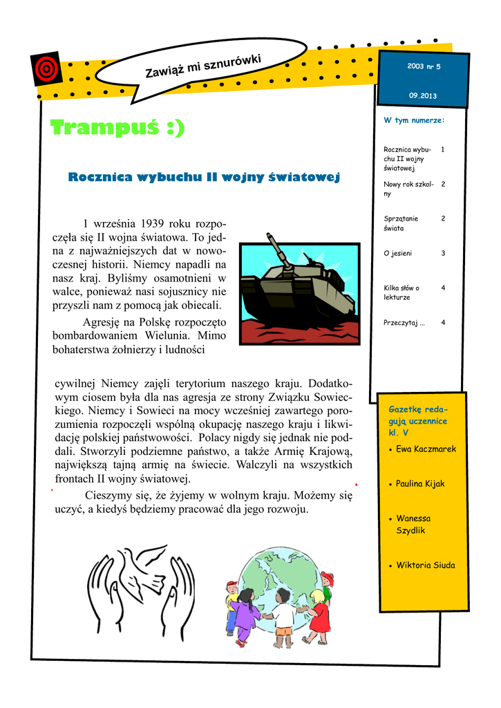 nurówki z s i m ż Zawią 2003 nr 5 09.2013 Trampuś :) Rocznica wybuchu II wojny światowej 1 września 1939 roku rozpoczęła się II wojna światowa. To jedna z najważniejszych dat w nowoczesnej historii. Niemcy napadli na nasz kraj. Byliśmy osamotnieni w walce, ponieważ nasi sojusznicy nie przyszli nam z pomocą jak obiecali. Agresję na Polskę rozpoczęto bombardowaniem Wielunia. Mimo bohaterstwa żołnierzy i ludności cywilnej Niemcy zajęli terytorium naszego kraju. Dodatkowym ciosem była dla nas agresja ze strony Związku Sowieckiego. Niemcy i Sowieci na mocy wcześniej zawartego porozumienia rozpoczęli wspólną okupację naszego kraju i likwidację polskiej państwowości. Polacy nigdy się jednak nie poddali. Stworzyli podziemne państwo, a także Armię Krajową, największą tajną armię na świecie. Walczyli na wszystkich frontach II wojny światowej. Cieszymy się, że żyjemy w wolnym kraju. Możemy się uczyć, a kiedyś będziemy pracować dla jego rozwoju. W tym numerze: Rocznica wybuchu II wojny światowej 1 Nowy rok szkolny 2 Sprzątanie świata 2 O jesieni 3 Kilka słów o lekturze 4 Przeczytaj ... 4 Gazetkę redagują uczennice kl. V Ewa Kaczmarek Paulina Kijak Wanessa Szydlik Wiktoria Siuda Nowy rok szkolny 2013/2014 1 września rozpoczęliśmy nowy rok szkolny. Żałujemy, że wakacje już się skończyły, ale cieszymy się , bo możemy znowu spotkać koleżanki, kolegów i nauczycieli. Tym, którzy po raz pierwszy przyszli do szkoły życzymy, aby czuli się w niej jak w domu. Uczniom klasy VI, którzy kończą edukację w szkole podstawowej życzymy jak najlepszych wyników ze sprawdzianu kończącego edukację w szkole podstawowej. Sprzątanie świata 2013 Każdy z nas „produkuje” śmieci. Wyrzucamy opakowania po produktach spożywczych, chemicznych, stare ubrania, zużyte sprzęty domowe. Uczymy się w szkole, że śmieci należy segregować czyli wrzucać do odpowiednich pojemników. Niestety nie wszyscy o tym pamiętają, dlatego od kilku lat uczestniczymy w akcji „Sprzątanie świata”. W tym roku uczniowie klas 0—III pozbierali wszystkie śmieci wokół szkoły. Mieli też czas na zabawę i wspólne grillowanie. Uczniowie klas IV-VI wyruszyli wraz z opiekunami na pieszy, 7 kilometrowy rajd do lasu w Woli Błędowej. Wcześniej przygotowali plakaty o tematyce ekologicznej. Od pana leśniczego dowiedzieli się, że są na terenie obszaru Natura 2000. Świetnie bawili się przy ognisku nad stawem, który jest w środku lasu. Jak przystało na młodych ekologów pozostawili miejsce w czystości. Ze sobą przynieśli wspaniałe humory, dobre samopoczucie oraz własnoręcznie zebrane grzyby. Oczywiście wszystkie nadawały się do jedzenia. Str. 2 Trampuś :) Jesienią, jesienią… Nawet jeżeli nie uważamy jesieni za najpiękniejszą porę roku, to na pewno jest ona najbogatsza. Obdarowuje nas warzywami, owocami, a przede wszystkim niezwykłą różnorodnością kolorów. W świecie roślin i zwierząt jest to okres gromadzenia zapasów przed zimą. Jesień astronomiczna rozpoczyna się w momencie równonocy jesiennej i trwa do momentu przesilenia zimowego, co w przybliżeniu oznacza na półkuli północnej okres pomiędzy 23 września a 22 grudnia Podczas jesieni astronomicznej dzienna pora dnia jest krótsza od pory nocnej, a ponadto z każdą kolejną dobą dnia ubywa, a nocy przybywa. Jesienią liście drzew zmieniają kolor, by w końcu opaść przed zimą, a najgrubsze części zielone roślin ulegają zdrewnieniu. Rośliny wieloletnie gromadzą substancje zapasowe w korzeniach, a jednoroczne usychają, starając się przedtem różnymi metodami doprowadzić do rozproszenia nasion. Jesienią, jesienią sady się rumienią: Czerwone jabłuszka pomiędzy zielenią. Czerwone jabłuszka, złociste gruszeczki. Świecą się jak gwiazdy pomiędzy listeczki. - Pójdę ja się, pójdę pokłonić jabłoni. Może mi jabłuszko w czapeczkę uroni! - Pójdę ja do gruszy, nastawię fartuszka. Może w niego spadnie Jaka śliczna gruszka! Jesienią, jesienią sady się rumienią; Czerwone jabłuszka Pomiędzy zielenią. Maria Konopnicka 2003 nr 5 Str. 3 KILKA SŁóW O LEKTURZE W pustyni i w puszczy to książka napisana przez Henryka Sienkiewicza. Opowiada ona o 14-letnim chłopcu i o 8-letniej dziewczynce. Dziewczynka ma na imię Nel, a chłopiec Staś. Obydwoje mieszkają w Egipcie. Staś Tarkowski jest z Polski, a Nel Rawlison z Anglii . Oboje mają tylko tatusiów, bo ich mamy umarły. Pewnego dnia pan Tarkowski i Rawlison powiedzieli że muszą jechać. A oni później dojadą po zakończeniu szkoły. Dzieci się bardzo ucieszyły. Gdy dzieci dojechały były już święta . Pewnego razu dzieci porwano… Data wydania książki : 1911 Adaptacje filmowe: 1973 i 2001. Przeczytaj… Dlaczego na świecie są pustynie Gdy mali Marokańczycy patrzą na ogromne obszary Sahary ich dziadkowie opowiadają im następującą historię. Kiedyś cała ziemia była zielona. Tysiące strumyków płynęło wśród traw, a figi, pomarańcze i daktyle rosły na tej samej gałęzi. Lew bawił się z barankiem, a plemiona ludzkie żyły w pokoju i nie wiedziały co to zło. Na początku świata Pan powiedział do ludzi: ten ukwiecony ogród i wszystko co w nim jest należy do was. Pamiętajcie jednak, że po każdym złym uczynku spuszczę na ziemię ziarnko piasku. Przez długi czas respektowano ostrzeżenie, ale pewnego dnia dwaj beduini pokłócili się o wielbłąda. I gdy tylko pierwsze złe słowo zostało wypowiedziane Pan zrzucił na ziemię ziarenko piasku tak lekkie i maleńkie, że nikt go nie zauważył. Szybko za słowami nastąpiły czyny i mały kopczyk piasku robił się coraz większy. Działo się zawsze tak ilekroć ktoś podnosił rękę na brata, skłamał, zrobił coś niewłaściwie. Ludzie śmiali się—nawet gdybyśmy byli najgorsi nie wystarczyłoby milionów lat, aby ten piasek mógł nam zaszkodzić. I znów zaczęli oszukiwać i wa