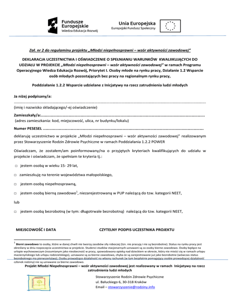 Zał. nr 2 do regulaminu projektu „Młodzi niepełnosprawni – wzór aktywności zawodowej” DEKLARACJA UCZESTNICTWA I OŚWIADCZENIE O SPEŁNIANIU WARUNKÓW KWALIIKUJĄCYCH DO UDZIAŁU W PROJEKCIE „Młodzi niepełnosprawni – wzór aktywności zawodowej” w ramach Programu Operacyjnego Wiedza Edukacja Rozwój, Priorytet I. Osoby młode na rynku pracy, Działanie 1.2 Wsparcie osób młodych pozostających bez pracy na regionalnym rynku pracy, Poddziałanie 1.2.2 Wsparcie udzielane z Inicjatywy na rzecz zatrudnienia ludzi młodych Ja niżej podpisany/a: …………………………………………………………………………………………………………………………………………………………………………. (imię i nazwisko składającego/-ej oświadczenie) Zamieszkały/a:……………………………………………………………………………………………………………………………………………. (adres zamieszkania: kod, miejscowość, ulica, nr budynku/lokalu) Numer PESESEL …………………………………………………………………………………………………………………………………………. deklaruję uczestnictwo w projekcie „Młodzi niepełnosprawni – wzór aktywności zawodowej” realizowanym przez Stowarzyszenie Rodzin Zdrowie Psychiczne w ramach Poddziałania 1.2.2 POWER Oświadczam, że zostałem/am poinformowany/na o przyjętych kryteriach kwalifikujących do udziału w projekcie i oświadczam, że spełniam te kryteria tj.: □ jestem osobą w wieku 15- 29 lat, □ zamieszkuję na terenie województwa małopolskiego, □ jestem osobą niepełnosprawną, □ jestem osobą bierną zawodowo1, niezarejestrowaną w PUP należącą do tzw. kategorii NEET, lub □ jestem osobą bezrobotną (w tym: długotrwale bezrobotną) należącą do tzw. kategorii NEET, MIEJSCOWOŚĆ I DATA CZYTELNY PODPIS UCZESTNIKA PROJEKTU 1 Bierni zawodowo to osoby, które w danej chwili nie tworzą zasobów siły roboczej (tzn. nie pracują i nie są bezrobotne). Status na rynku pracy jest określany w dniu rozpoczęcia uczestnictwa w projekcie. Studenci studiów stacjonarnych uznawani są za osoby bierne zawodowo. Osoby będące na urlopie wychowawczym (rozumianym jako nieobecność w pracy, spowodowana opieką nad dzieckiem w okresie, który nie mieści się w ramach urlopu macierzyńskiego lub urlopu rodzicielskiego), uznawane są za bierne zawodowo, chyba że są zarejestrowane już jako bezrobotne (wówczas status bezrobotnego ma pierwszeństwo). Osoby prowadzące działalność na własny rachunek (w tym bezpłatnie pomagający osobie prowadzącej działalność członek rodziny) nie są uznawane za bierne zawodowo. Projekt Młodzi Niepełnosprawni – wzór aktywności zawodowej jest realizowany w ramach Inicjatywy na rzecz zatrudnienia ludzi młodych Stowarzyszenie Rodzin Zdrowie Psychiczne ul. Bałuckiego 6, 30-318 Kraków Email – [email protected] OŚWIADCZENIA 1. Oświadczam, że zapoznałem/am się z zasadami uczestnictwa w Projekcie oraz akceptuję warunki uczestnictwa zapisane w REGULAMINIE PROJEKTU. ………………………….………………… Data i podpis uczestnika 2. Oświadczam, że zostałem/am uprzedzony/na o odpowiedzialności cywilnej (wynikającej z Kodeksu Cywilnego) za składanie oświadczeń niezgodnych z prawdą, niniejszym oświadczam, że dane zawarte w złożonych dokumentach rekrutacyjnych i zgłoszeniowych są zgodne ze stanem faktycznym i prawnym. ………………………….………………… Data i podpis uczestnika 3. Oświadczam, że zostałam/em poinformowana/y, iż projekt „ Młodzi niepełnosprawni – wzór aktywności zawodowej” współfinansowany jest ze środków Europejskiego Funduszu Społecznego w ramach Priorytetu I. Osoby młode na rynku pracy, Działanie 1.2 Wsparcie osób młodych pozostających bez pracy na regionalnym rynku pracy, Poddziałanie 1.2.2 Wsparcie udzielane z Inicjatywy na rzecz zatrudnienia ludzi młodych ………………………….………………… Data i podpis uczestnika 4. Wyrażam zgodę na badanie ewaluacyjne, którego celem jest udoskonalenie oferowanej dotychczas pomocy i lepsze dostosowanie jej do potrzeb przyszłych uczestników. ………………………….………………… Data i podpis uczestnika Projekt Młodzi Niepełnosprawni – wzór aktywności zawodowej jest realizowany w ramach Inicjatywy na rzecz zatrudnienia ludzi młodych Stowarzyszenie Rodzin Zdrowie Psychiczne ul. Bałuckiego 6, 30-318 Kraków Email – [email protected] 5. Oświadczam, że w rozumieniu przepisów Kodeksu Cywilnego zamieszkuję na terenie woj. małopolskiego ………………………….………………… Data i podpis uczestnika 6. Oświadczam, że jestem osobą bierną zawodowo, niezarejestrowaną w PUP należącą do tzw. kategorii NEET2 ………………………….………………… Data i podpis uczestnika 7. Oświadczam, że jestem osobą bezrobotną / długotrwale bezrobotną3 należącą do tzw. kategorii NEET ………………………….………………… Data i podpis uczestnika 8. Oświadczam, że jestem osobą niepełnosprawną o stopniu lekkim/umiarkowanym/znacznym 4 ………………………….………………… Data i podpis uczestnika 2 NEET (ang. not in employment, education or training) - za osobę z kategorii NEET uznaje się osobę młodą w wieku 15-29 lat, która spełnia łącznie trzy warunki, czyli nie pracuje (tj. jest bezrobotna lub bierna zawodowo), nie kształci się (tj. nie uczestniczy w kształceniu formalnym w trybie stacjonarnym) ani nie szkoli (tj. nie uczestniczy w pozaszkolnych zajęciach mających na celu uzyskanie, uzupełnienie lub doskonalenie umiejętności i kwalifikacji zawodowych lub ogólnych, potrzebnych do wykonywania pracy; w procesie oceny czy dana osoba się nie szkoli, a co za tym idzie kwalifikuje się do kategorii NEET,