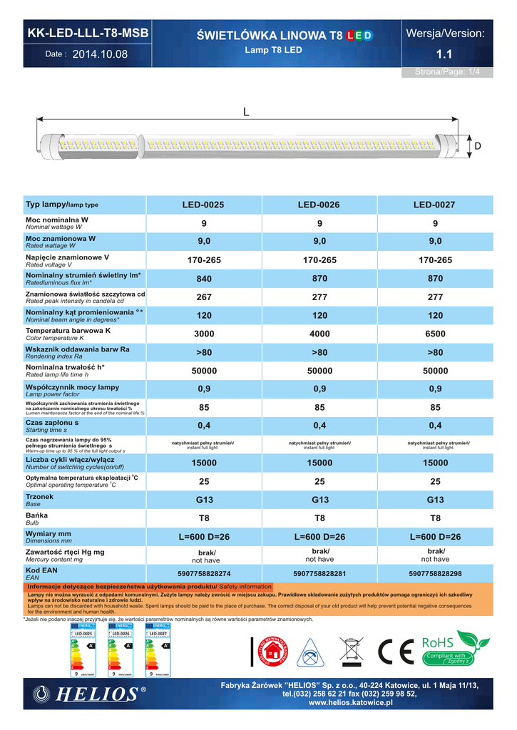 KK-LED-LLL-T8-MSB ŚWIETLÓWKA LINOWA T8 L E D Lamp T8 LED 2014.10.08 Date : Wersja/Version: 1.1 Strona/Page: 1/4 L D Typ lampy/lamp type Moc nominalna W Nominal wattage W Moc znamionowa W Rated wattage W Napięcie znamionowe V Rated voltage V Nominalny strumień świetlny lm* Ratedluminous flux lm* Znamionowa światłość szczytowa cd Rated peak intensity in candela cd o Nominalny kąt promieniowania * Nominal beam angle in degrees* Temperatura barwowa K Color temperature K Wskaznik oddawania barw Ra Rendering index Ra Nominalna trwałość h* Rated lamp life time h Współczynnik mocy lampy Lamp power factor Współczynnik zachowania strumienia świetlnego na zakończenie nominalnego okresu trwałości % Lumen maintenance factor at the end of the nominal life % Czas zapłonu s Starting time s Czas nagrzewania lampy do 95% pełnego strumienia świetlnego s Warm-up time up to 95 % of the full light output s Liczba cykli włącz/wyłącz Number of switching cycles(on/off) LED-0025 LED-0026 LED-0027 9 9 9 9,0 9,0 9,0 170-265 170-265 170-265 840 870 870 267 277 277 120 120 120 3000 4000 6500 >80 >80 >80 50000 50000 50000 0,9 0,9 0,9 85 85 85 0,4 0,4 0,4 natychmiast pełny strumień/ instant full light natychmiast pełny strumień/ instant full light 15000 15000 15000 25 25 25 G13 G13 G13 T8 T8 T8 L=600 D=26 L=600 D=26 L=600 D=26 brak/ not have brak/ not have brak/ not have 5907758828274 5907758828281 5907758828298 natychmiast pełny strumień/ instant full light 0 Optymalna temperatura eksploatacji C Optimal operating temperature 0C Trzonek Base Bańka Bulb Wymiary mm Dimensions mm Zawartość rtęci Hg mg Mercury content mg Kod EAN EAN Informacje dotyczące bezpieczeństwa użytkowania produktu/ Safety information Lampy nie można wyrzucić z odpadami komunalnymi. Zużyte lampy należy zwrócić w miejscu zakupu. Prawidłowe składowanie zużytych produktów pomaga ograniczyć ich szkodliwy wpływ na środowisko naturalne i zdrowie ludzi. Lamps can not be discarded with household waste. Spent lamps should be paid to the place of purchase. The correct disposal of your old product will help prevent potential negative consequences for the environment and human health. *Jeżeli nie podano inaczej przyjmuje się, że wartości parametrów nominalnych są równe wartości parametrów znamionowych. ENERGIEY IJA IA ENERGIEY IJA IA ENERGIEY IJA IA eнергия . ενεργεια eнергия . ενεργεια eнергия . ενεργεια LED-0025 LED-0026 LED-0027 A++ A+ A B C B D B E B 9 A+ kWh/1000h A++ A+ A B C B D B E B 9 A+ kWh/1000h A++ A+ A B C B D B E B 9 A+ RoHS Compliant with Zgodny z kWh/1000h Fabryka Żarówek ”HELIOS” Sp. z o.o., 40-224 Katowice, ul. 1 Maja 11/13, tel.(032) 258 62 21 fax (032) 259 98 52, www.helios.katowice.pl KK-LED-LLL-T8-MSB ŚWIETLÓWKA LINOWA T8 L E D Lamp T8 LED 2014.10.08 Date : Wersja/Version: 1.1 Strona/Page: 2/4 L D Typ lampy/lamp type Moc nominalna W Nominal wattage W Moc znamionowa W Rated wattage W Napięcie znamionowe V Rated voltage V Nominalny strumień świetlny lm* Ratedluminous flux lm* Znamionowa światłość szczytowa cd Rated peak intensity in candela cd o Nominalny kąt promieniowania * Nominal beam angle in degrees* Temperatura barwowa K Color temperature K Wskaznik oddawania barw Ra Rendering index Ra Nominalna trwałość h* Rated lamp life time h Współczynnik mocy lampy Lamp power factor Współczynnik zachowania strumienia świetlnego na zakończenie nominalnego okresu trwałości % Lumen maintenance factor at the end of the nominal life % Czas zapłonu s Starting time s Czas nagrzewania lampy do 95% pełnego strumienia świetlnego s Warm-up time up to 95 % of the full light output s Liczba cykli włącz/wyłącz Number of switching cycles(on/off) LED-0028 LED-0029 LED-0030 18 18 18 18,0 18,0 18,0 170-265 170-265 170-265 1650 1800 1800 525 573 573 120 120 120 3000 4000 6500 >80 >80 >80 50000 50000 50000 0,9 0,9 0,9 85 85 85 0,4 0,4 0,4 natychmiast pełny strumień/ instant full light natychmiast pełny strumień/ instant full light 15000 15000 15000 25 25 25 G13 G13 G13 T8 T8 T8 L=1200 D=26 L=1200 D=26 L=1200 D=26 brak/ not have brak/ not have brak/ not have 5907758828304 5907758828311 5907758828328 natychmiast pełny strumień/ instant full light 0 Optymalna temperatura eksploatacji C Optimal operating temperature 0C Trzonek Base Bańka Bulb Wymiary mm Dimensions mm Zawartość rtęci Hg mg Mercury content mg Kod EAN EAN Informacje dotyczące bezpieczeństwa użytkowania produktu/ Safety information Lampy nie można wyrzucić z odpadami komunalnymi. Zużyte lampy należy zwrócić w miejscu zakupu. Prawidłowe składowanie zużytych produktów pomaga ograniczyć ich szkodliwy wpływ na środowisko naturalne i zdrowie ludzi. Lamps can not be discarded with household waste. Spent lamps should be paid to the place of purchase. The correct disposal of your old product will help prevent potential negative consequences for the environment and human health. *Jeżeli nie podano inaczej przyjmuje się, że wartości parametrów nominalnych są równe wartości parametrów znamionowych. ENERGIEY IJA IA ENERGIEY IJA IA ENERGIEY IJA IA eнергия . ενεργεια eнергия . ενεργεια eнергия . ενεργεια LED-0028 LED-0029 LED-0030 A++ A+ A B C B D B E B A+ 18 kWh/1000h A++ A+ A B C B D B E B A+ 18 kWh/1000h A++ A+ A B C B D B E B A+ RoHS Compliant with Zgodny z 18 kWh/1000h Fabryka Żarówek ”HELIOS” Sp. z o.o., 40-224 Katowice, ul. 1 Maja 11/13, tel.(032) 258 62 21 fax (032) 259 98 52, www.helios.katowice.pl KK-LED-LLL-T8-MSB ŚWIETLÓWKA LINOWA T8 L E D Lamp T8 LED 2014.10.08 Date : Wersja/Version: 1.1 Strona/Page: 3/4 L D Typ lampy/lamp type Moc nominalna W Nominal wattage W Moc znamionowa W Rated wattage W Napięcie znamionowe V Rated voltage V Nominalny strumień świetlny lm* Ratedluminous flux lm* Znamionowa światłość szczytowa cd Rated peak intensity in candela cd o Nominalny kąt promieniowan