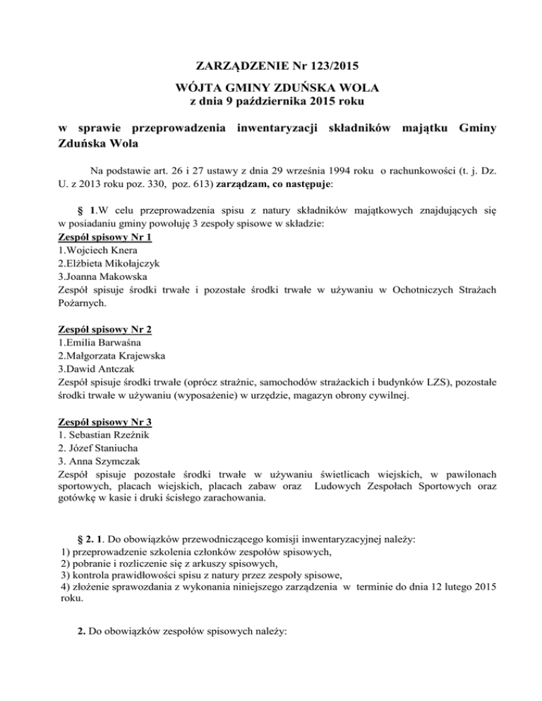 ZARZĄDZENIE Nr 123/2015 WÓJTA GMINY ZDUŃSKA WOLA z dnia 9 października 2015 roku w sprawie przeprowadzenia inwentaryzacji składników majątku Gminy Zduńska Wola Na podstawie art. 26 i 27 ustawy z dnia 29 września 1994 roku o rachunkowości (t. j. Dz. U. z 2013 roku poz. 330, poz. 613) zarządzam, co następuje: § 1.W celu przeprowadzenia spisu z natury składników majątkowych znajdujących się w posiadaniu gminy powołuję 3 zespoły spisowe w składzie: Zespół spisowy Nr 1 1.Wojciech Knera 2.Elżbieta Mikołajczyk 3.Joanna Makowska Zespół spisuje środki trwałe i pozostałe środki trwałe w używaniu w Ochotniczych Strażach Pożarnych. Zespół spisowy Nr 2 1.Emilia Barwaśna 2.Małgorzata Krajewska 3.Dawid Antczak Zespół spisuje środki trwałe (oprócz strażnic, samochodów strażackich i budynków LZS), pozostałe środki trwałe w używaniu (wyposażenie) w urzędzie, magazyn obrony cywilnej. Zespół spisowy Nr 3 1. Sebastian Rzeźnik 2. Józef Staniucha 3. Anna Szymczak Zespół spisuje pozostałe środki trwałe w używaniu świetlicach wiejskich, w pawilonach sportowych, placach wiejskich, placach zabaw oraz Ludowych Zespołach Sportowych oraz gotówkę w kasie i druki ścisłego zarachowania. § 2. 1. Do obowiązków przewodniczącego komisji inwentaryzacyjnej należy: 1) przeprowadzenie szkolenia członków zespołów spisowych, 2) pobranie i rozliczenie się z arkuszy spisowych, 3) kontrola prawidłowości spisu z natury przez zespoły spisowe, 4) złożenie sprawozdania z wykonania niniejszego zarządzenia w terminie do dnia 12 lutego 2015 roku. 2. Do obowiązków zespołów spisowych należy: 1) przeprowadzenie spisu z natury w określonym terminie przy udziale osób materialnie odpowiedzialnych, 2) ocena przydatności składników majątkowych objętych spisem, 3) postawienie wniosków dotyczących zagospodarowania, 4) usunięcie nieprawidłowości stwierdzonych w czasie spisu z natury składników majątkowych, 5) właściwe, dokładne i rzetelne przeprowadzenie inwentaryzacji, zgodnie ze stanem faktycznym, przekazanie kompletnej dokumentacji inwentaryzacyjnej po zakończeniu spisu. 3. Do obowiązków skarbnika gminy należy: 1) wycena spisanych z natury składników majątkowych, 2) ustalenie różnic inwentaryzacyjnych, 3) przeprowadzenie inwentaryzacji drogą porównania ksiąg rachunkowych z odpowiednimi dokumentami i weryfikacji wartości środków trwałych, do których dostęp jest znacznie utrudniony, gruntów oraz praw zakwalifikowanych do nieruchomości ; 4) przeprowadzenie inwentaryzacji aktywów finansowych zgromadzonych na rachunkach bankowych lub przechowywanych przez inne jednostki, w tym papierów wartościowych, należności oraz powierzonych kontrahentom własnych składników aktywów – drogą otrzymania od banków i uzyskania od kontrahentów potwierdzeń prawidłowości wykazanego w księgach rachunkowych jednostki stanu tych aktywów oraz wyjaśnienia i rozliczenia ewentualnych różnic; 5) ujęcie w księgach roku 2015 różnic inwentaryzacyjnych i ich rozliczenie. § 3. Ustala się termin przeprowadzenia spisu z natury wszystkich składników majątkowych gminy na dzień 31 października 2015 roku, natomiast stan gotówki w kasie, druków ścisłego zarachowania, środków trwałych, do których dostęp jest znacznie utrudniony, gruntów oraz aktywów finansowych na dzień 31 grudnia 2015 roku. Ostateczny termin zakończenia inwentaryzacji ustala się na dzień 15 stycznia 2016 roku. § 4. Sprawy nie unormowane niniejszym zarządzeniem regulują powołane przepisy. § 5. Zarządzenie obowiązuje z dniem podpisania. Wójt Gminy /-/ Henryk Staniucha na wstępie