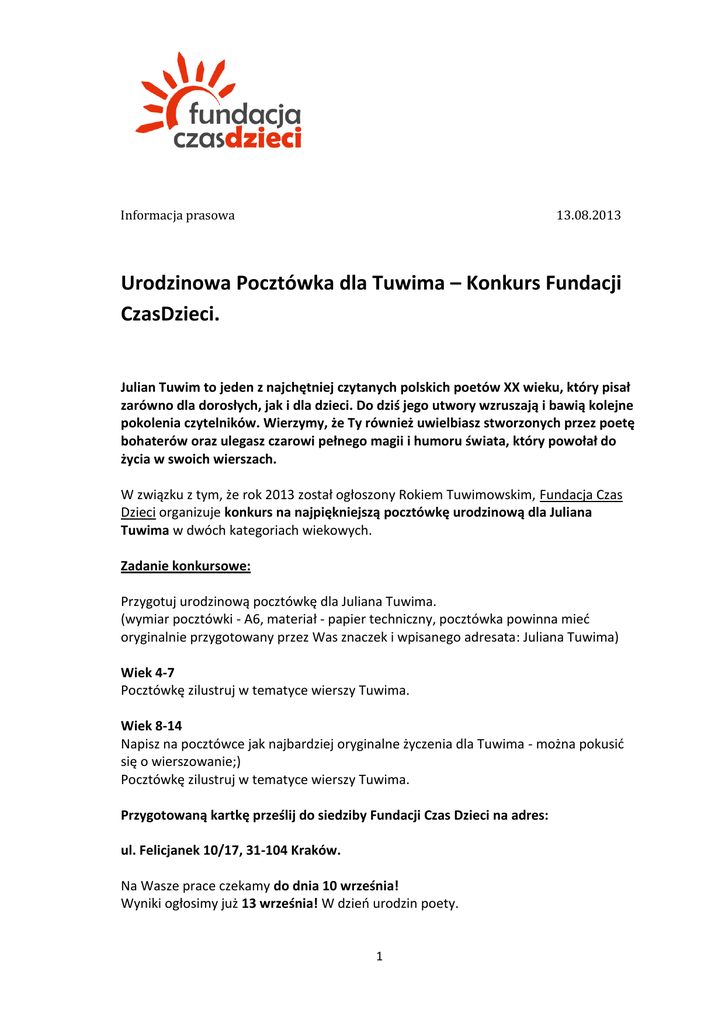 Informacja prasowa 13.08.2013 Urodzinowa Pocztówka dla Tuwima – Konkurs Fundacji CzasDzieci. Julian Tuwim to jeden z najchętniej czytanych polskich poetów XX wieku, który pisał zarówno dla dorosłych, jak i dla dzieci. Do dziś jego utwory wzruszają i bawią kolejne pokolenia czytelników. Wierzymy, że Ty również uwielbiasz stworzonych przez poetę bohaterów oraz ulegasz czarowi pełnego magii i humoru świata, który powołał do życia w swoich wierszach. W związku z tym, że rok 2013 został ogłoszony Rokiem Tuwimowskim, Fundacja Czas Dzieci organizuje konkurs na najpiękniejszą pocztówkę urodzinową dla Juliana Tuwima w dwóch kategoriach wiekowych. Zadanie konkursowe: Przygotuj urodzinową pocztówkę dla Juliana Tuwima. (wymiar pocztówki - A6, materiał - papier techniczny, pocztówka powinna mieć oryginalnie przygotowany przez Was znaczek i wpisanego adresata: Juliana Tuwima) Wiek 4-7 Pocztówkę zilustruj w tematyce wierszy Tuwima. Wiek 8-14 Napisz na pocztówce jak najbardziej oryginalne życzenia dla Tuwima - można pokusić się o wierszowanie;) Pocztówkę zilustruj w tematyce wierszy Tuwima. Przygotowaną kartkę prześlij do siedziby Fundacji Czas Dzieci na adres: ul. Felicjanek 10/17, 31-104 Kraków. Na Wasze prace czekamy do dnia 10 września! Wyniki ogłosimy już 13 września! W dzień urodzin poety. 1 Do Wygrania: 20 SUPER zestawów książek dla dzieci od Fundacji Czas Dzieci! Pamiętajcie o dołączeniu do kartki swoich danych korespondencyjnych, abyśmy mogli wysłać Wam nagrody! Więcej Informacji znajdziecie na Stronie Projektu http://tuwim.czasdzieci.pl/konkursy/id,14-urodzinowa_pocztowka_tuwima.html Dodatkowych informacji udziela: Dawid Wołowicz [email protected] 605 540 188 Fundacja Czas Dzieci powstała na początku 2012 roku z inicjatywy pracowników i kilku przyjaciół Portalu CzasDzieci.pl. Dzięki pracy w Portalu, już od przeszło sześciu lat mamy stały kontakt z rodzicami z całej Polski. Początkowo byli to rodzice z największych metropolii, jednak w miarę upływu czasu i w miarę rozrastania się treści na naszych stronach zaczęły nas odwiedzać osoby spoza miast, w których informujemy o aktualnych wydarzeniach dla dzieci. Obecnie Portal odwiedzają rodzice z obszaru całej Polski, także z małych miast i wsi. Od kilku już lat dostajemy listy od rodziców z propozycjami pomocy dzieciom poprzez Portal, z prośbą o pomoc materialną dla ubogich placówek kulturalnych i oświatowych z terenów wiejskich lub z małych miast, o pomoc organizacyjną przy imprezach czy po prostu z prośbą o radę. Zawsze odpowiadaliśmy na każde listy i staraliśmy się pomagać wedle naszych możliwości, jednak mamy świadomość, że pomagamy tylko doraźnie, a trzeba czegoś więcej. I jesteśmy przekonani, że można więcej! Dlatego właśnie powstała Fundacja Czas Dzieci – nie chcemy już tylko doraźnie pomagać, ale pragniemy na dłużej, mocniej wejść w środowiska, gdzie możemy pomóc i wywołać trwałe zmiany na lepsze. Mamy doświadczony zespół, ludzi pełnych pasji, pomysłów i chętnych do zmieniania świata na lepsze – przynajmniej kawałka. A teraz mamy nareszcie Fundację, dzięki której możemy realizować projekty i w znaczący sposób poszerzać nasze prospołeczne działania. Grupa, która w szczególny sposób jest nam bliska to dzieci i rodzice – do niech będziemy kierować nasze akcje i im będziemy służyć. Dodatkowo pragniemy rozszerzyć nasze dotychczasowe działania również na środowiska, w których dzieci mają dużo mniejsze możliwości rozwijania swoich talentów, pasji, rozbudzania nowych zainteresowań niż dzieci mieszkające w centrach dużych miast. Naszą misją jest pokazać dzieciom i rodzicom, że bez względu na okoliczności – zawsze MOŻNA WIĘCEJ ponad szarą przeciętność. 2