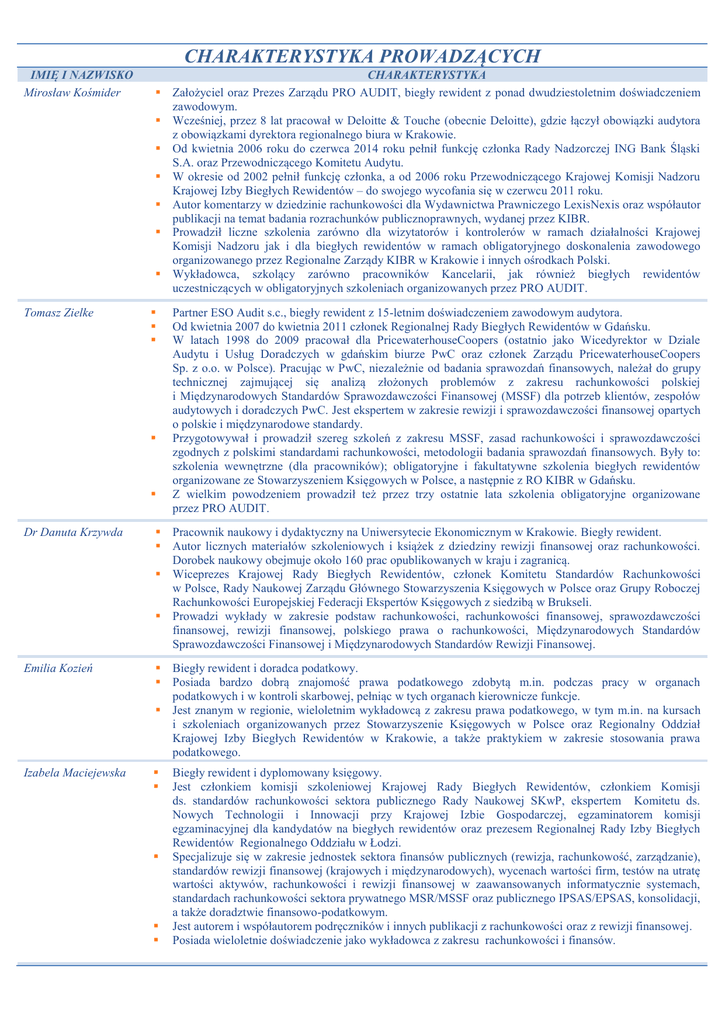 CHARAKTERYSTYKA PROWADZĄCYCH IMIĘ I NAZWISKO Mirosław Kośmider Tomasz Zielke CHARAKTERYSTYKA Założyciel oraz Prezes Zarządu PRO AUDIT, biegły rewident z ponad dwudziestoletnim doświadczeniem zawodowym. Wcześniej, przez 8 lat pracował w Deloitte & Touche (obecnie Deloitte), gdzie łączył obowiązki audytora z obowiązkami dyrektora regionalnego biura w Krakowie. Od kwietnia 2006 roku do czerwca 2014 roku pełnił funkcję członka Rady Nadzorczej ING Bank Śląski S.A. oraz Przewodniczącego Komitetu Audytu. W okresie od 2002 pełnił funkcję członka, a od 2006 roku Przewodniczącego Krajowej Komisji Nadzoru Krajowej Izby Biegłych Rewidentów – do swojego wycofania się w czerwcu 2011 roku. Autor komentarzy w dziedzinie rachunkowości dla Wydawnictwa Prawniczego LexisNexis oraz współautor publikacji na temat badania rozrachunków publicznoprawnych, wydanej przez KIBR. Prowadził liczne szkolenia zarówno dla wizytatorów i kontrolerów w ramach działalności Krajowej Komisji Nadzoru jak i dla biegłych rewidentów w ramach obligatoryjnego doskonalenia zawodowego organizowanego przez Regionalne Zarządy KIBR w Krakowie i innych ośrodkach Polski. Wykładowca, szkolący zarówno pracowników Kancelarii, jak również biegłych rewidentów uczestniczących w obligatoryjnych szkoleniach organizowanych przez PRO AUDIT. Partner ESO Audit s.c., biegły rewident z 15-letnim doświadczeniem zawodowym audytora. Od kwietnia 2007 do kwietnia 2011 członek Regionalnej Rady Biegłych Rewidentów w Gdańsku. W latach 1998 do 2009 pracował dla PricewaterhouseCoopers (ostatnio jako Wicedyrektor w Dziale Audytu i Usług Doradczych w gdańskim biurze PwC oraz członek Zarządu PricewaterhouseCoopers Sp. z o.o. w Polsce). Pracując w PwC, niezależnie od badania sprawozdań finansowych, należał do grupy technicznej zajmującej się analizą złożonych problemów z zakresu rachunkowości polskiej i Międzynarodowych Standardów Sprawozdawczości Finansowej (MSSF) dla potrzeb klientów, zespołów audytowych i doradczych PwC. Jest ekspertem w zakresie rewizji i sprawozdawczości finansowej opartych o polskie i międzynarodowe standardy. Przygotowywał i prowadził szereg szkoleń z zakresu MSSF, zasad rachunkowości i sprawozdawczości zgodnych z polskimi standardami rachunkowości, metodologii badania sprawozdań finansowych. Były to: szkolenia wewnętrzne (dla pracowników); obligatoryjne i fakultatywne szkolenia biegłych rewidentów organizowane ze Stowarzyszeniem Księgowych w Polsce, a następnie z RO KIBR w Gdańsku. Z wielkim powodzeniem prowadził też przez trzy ostatnie lata szkolenia obligatoryjne organizowane przez PRO AUDIT. Dr Danuta Krzywda Pracownik naukowy i dydaktyczny na Uniwersytecie Ekonomicznym w Krakowie. Biegły rewident. Autor licznych materiałów szkoleniowych i książek z dziedziny rewizji finansowej oraz rachunkowości. Dorobek naukowy obejmuje około 160 prac opublikowanych w kraju i zagranicą. Wiceprezes Krajowej Rady Biegłych Rewidentów, członek Komitetu Standardów Rachunkowości w Polsce, Rady Naukowej Zarządu Głównego Stowarzyszenia Księgowych w Polsce oraz Grupy Roboczej Rachunkowości Europejskiej Federacji Ekspertów Księgowych z siedzibą w Brukseli. Prowadzi wykłady w zakresie podstaw rachunkowości, rachunkowości finansowej, sprawozdawczości finansowej, rewizji finansowej, polskiego prawa o rachunkowości, Międzynarodowych Standardów Sprawozdawczości Finansowej i Międzynarodowych Standardów Rewizji Finansowej. Emilia Kozień Biegły rewident i doradca podatkowy. Posiada bardzo dobrą znajomość prawa podatkowego zdobytą m.in. podczas pracy w organach podatkowych i w kontroli skarbowej, pełniąc w tych organach kierownicze funkcje. Jest znanym w regionie, wieloletnim wykładowcą z zakresu prawa podatkowego, w tym m.in. na kursach i szkoleniach organizowanych przez Stowarzyszenie Księgowych w Polsce oraz Regionalny Oddział Krajowej Izby Biegłych Rewidentów w Krakowie, a także praktykiem w zakresie stosowania prawa podatkowego. Izabela Maciejewska Biegły rewident i dyplomowany księgowy. Jest członkiem komisji szkoleniowej Krajowej Rady Biegłych Rewidentów, członkiem Komisji ds. standardów rachunkowości sektora publicznego Rady Naukowej SKwP, ekspertem Komitetu ds. Nowych Technologii i Innowacji przy Krajowej Izbie Gospodarczej, egzaminatorem komisji egzaminacyjnej dla kandydatów na biegłych rewidentów oraz prezesem Regionalnej Rady Izby Biegłych Rewidentów Regionalnego Oddziału w Łodzi. Specjalizuje się w zakresie jednostek sektora finansów publicznych (rewizja, rachunkowość, zarządzanie), standardów rewizji finansowej (krajowych i międzynarodowych), wycenach wartości firm, testów na utratę wartości aktywów, rachunkowości i rewizji finansowej w zaawansowanych informatycznie systemach, standardach rachunkowości sektora prywatnego MSR/MSSF oraz publicznego IPSAS/EPSAS, konsolidacji, a także doradztwie finansowo-podatkowym. Jest autorem i współautorem podręczników i innych publikacji z rachunkowości oraz z rewizji finansowej. Posiada wieloletnie doświadczenie jako wykładowca z zakresu rachunkowości i finansów. Dr Bogusław Kaczmarczyk Doktor nauk ekonomicznych w dziedzinie finansów, jest pracownikiem naukowym i dydaktycznym na Uniwersytecie Ekonomicznym w Krakowie. Rzeczoznawca majątkowy specjalizujący się w wycenach. Autor licznych materiałów szkoleniowych i publikacji z dziedziny finansów, w tym na temat wycen wartości rynkowych przedsiębiorstw, metod ilościowych oraz nowych metod wycen. Współautor Techniki Alokacji Kapitałowej (TAK) w związku z ustaleniem wartości godziwej aktywów spółek przejmowanych w procesach połączenia. Autor modeli wartości rynkowych dla branż: energetycznej, ochrony i mienia, spożywczej, tekstylnej i innych. Aldona Gibalska Wiceprezes Zarządu ds. finansowych Fundacji dla Uniwersytetu Jagiellońskiego oraz Wiceprezes Fundacji badań na