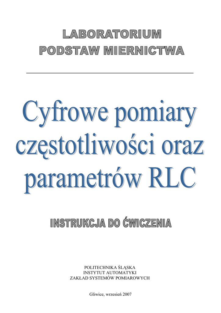 POLITECHNIKA ŚLĄSKA INSTYTUT AUTOMATYKI ZAKŁAD SYSTEMÓW POMIAROWYCH Gliwice, wrzesień 2007 Cyfrowe pomiary częstotliwości oraz parametrów RLC Cel ćwiczenia Celem ćwiczenia jest zapoznanie się z budową, zasadą działania, właściwościami układów cyfrowego pomiaru czasu i częstotliwości oraz cyfrowych mierników rezystancji, pojemności i indukcyjności. Zadania Część I: Cyfrowy pomiar czasu i częstotliwości W części pierwszej badana jest dokładność cyfrowego pomiaru czasu i częstotliwości w zależności od wartości częstotliwości i amplitudy mierzonego napięcia. Na stanowisku znajduje się badany częstotliwościomierz i generatory przebiegów. 1. Zapoznać się z dokumentacją przyrządu, schematem funkcjonalnym i sposobem realizacji poszczególnych funkcji. Przenieść do protokołu dane charakteryzujące dokładność przyrządu dla funkcji pomiaru czasu i częstotliwości. 2. Uruchomić funkcję autokontroli częstościomierza (autocheck). Wykonać autokontrolę przyrządu dla wszystkich zakresów pomiarowych. Sformułować wnioski dotyczące poprawności działania przyrządu. 3. Przeprowadzić pomiary częstotliwości (metoda bezpośrednia) w zakresie częstotliwości 10Hz – 100kHz (podawane częstotliwości zmieniać logarytmicznie, np.: 10Hz , 20 , 50 , 100 , 200 , 500 , 1k , 2k , 5k , 10k , 20k , 50k , 100kHz). Przełączyć częstościomierz w tryb pomiaru okresu (metoda pośrednia) i powtórzyć pomiary. Do pomiarów wykorzystać zakres zapewniający największą dokładność pomiaru. Wyniki pomiaru okresu przeliczyć na częstotliwość. Dokonać oceny dokładności pomiaru częstotliwości metodą pośrednią i bezpośrednią w zależności od częstotliwości mierzonego sygnału. Na wykresie (oś X - mierzona częstotliwość w skali logarytmicznej, oś Y –względna niepewność wyniku pomiaru na podstawie dokumentacji przyrządu także w skali logarytmicznej) wykreślić względną niepewność wyniku pomiaru metodą bezpośrednią i pośrednią. Sformułować wnioski dotyczące zakresu częstotliwości dla których metoda bezpośrednia zapewnia większą dokładność od pośredniej. 4. Zbadać wpływ zmiany poziomu sygnału na dokładność pomiaru. Wykonać po pięć pomiarów częstotliwości 1000 Hz dla amplitud napięcia 3V; 0,3V i 0,03V metodą bezpośrednią i pośrednią. Wyznaczyć względne niepewności wyników pomiarów dla poszczególnych serii pomiarów i przedstawić je na wykresie(oś X-amplituda napięcia w skali logarytmicznej, oś Y–względna niepewność wyniku pomiaru także w skali logarytmicznej). Sformułować wnioski dotyczące wpływu amplitudy badanego napięcia na dokładność pomiaru metodą bezpośrednią i pośrednią. Część II: Cyfrowy pomiar parametrów RLC W części drugiej wykonuje się pomiary rezystancji, pojemności i indukcyjności za pomocą cyfrowego miernika RLC. Na stanowisku znajduje się miernik RLC oraz badane rezystory, kondensatory i cewki. 1. Do protokołu przenieść dane charakteryzujące dokładność przyrządu. 2. Wykonać pomiary rezystancji, pojemności i indukcyjności oraz dobroci i stratności wskazanych przez prowadzącego elementów dla dwóch wartości częstotliwości napięcia probierczego (120Hz i 1000Hz). Wyznaczyć względne niepewności wyników pomiarów. Narysować schematy zastępcze mierzonych elementów i nanieść na nie wartości RLC. Pytania kontrolne Część I: Cyfrowy pomiar czasu i częstotliwości 1. Narysować schemat funkcjonalny i wyjaśnić zasadę pomiaru częstotliwości. 2. Narysować schemat funkcjonalny i wyjaśnić zasadę pomiaru czasu. 3. Co to jest błąd kwantowania, jaka jest wartość tego błędu? 4. Co to jest błąd synchronizacji, jaka jest wartość tego błędu? 5. Które elementy przyrządu decydują o dokładności pomiaru? Część II: Cyfrowy pomiar parametrów RLC 1. Omówić budowę i zasadę działania cyfrowego miernika RLC. 2. Narysować i nazwać typowe schematy zastępcze kondensatorów i cewek. 3. Podać definicje dobroci i stratności i sposób ich obliczania dla typowych schematów zastępczych kondensatorów i cewek. Literatura 1. Piotrowski J.: Podstawy miernictwa, WNT, Warszawa, 2002. 2. Marcyniuk A.: Podstawy miernictwa elektrycznego, Wyd. Pol. Śl., Gliwice, 2002. MIERNIK RLC ESCORT ELC-131D Dokładność pomiarów Marcyniuk A.: Podstawy miernictwa elektrycznego