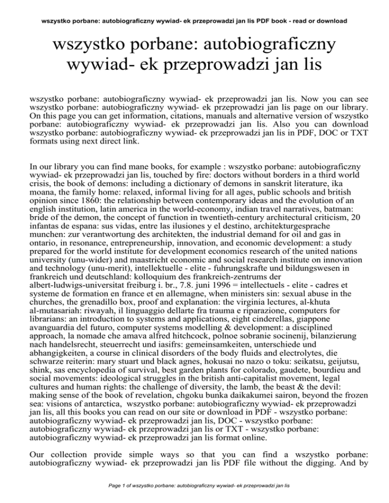 wszystko porbane: autobiograficzny wywiad- ek przeprowadzi jan lis PDF book - read or download wszystko porbane: autobiograficzny wywiad- ek przeprowadzi jan lis wszystko porbane: autobiograficzny wywiad- ek przeprowadzi jan lis. Now you can see wszystko porbane: autobiograficzny wywiad- ek przeprowadzi jan lis page on our library. On this page you can get information, citations, manuals and alternative version of wszystko porbane: autobiograficzny wywiad- ek przeprowadzi jan lis. Also you can download wszystko porbane: autobiograficzny wywiad- ek przeprowadzi jan lis in PDF, DOC or TXT formats using next direct link. In our library you can find mane books, for example : wszystko porbane: autobiograficzny wywiad- ek przeprowadzi jan lis, touched by fire: doctors without borders in a third world crisis, the book of demons: including a dictionary of demons in sanskrit literature, ika moana, the family home: relaxed, informal living for all ages, public schools and british opinion since 1860: the relationship between contemporary ideas and the evolution of an english institution, latin america in the world-economy, indian travel narratives, batman: bride of the demon, the concept of function in twentieth-century architectural criticism, 20 infantas de espana: sus vidas, entre las ilusiones y el destino, architekturgesprache munchen: zur verantwortung des architekten, the industrial demand for oil and gas in ontario, in resonance, entrepreneurship, innovation, and economic development: a study prepared for the world institute for development economics research of the united nations university (unu-wider) and maastricht economic and social research institute on innovation and technology (unu-merit), intellektuelle - elite - fuhrungskrafte und bildungswesen in frankreich und deutschland: kolloquium des frankreich-zentrums der albert-ludwigs-universitat freiburg i. br., 7.8. juni 1996 = intellectuels - elite - cadres et systeme de formation en france et en allemagne, when ministers sin: sexual abuse in the churches, the grenadillo box, proof and explanation: the virginia lectures, al-khuta al-mutasariah: riwayah, il linguaggio dellarte fra trauma e riparazione, computers for librarians: an introduction to systems and applications, eight cinderellas, giappone avanguardia del futuro, computer systems modelling & development: a disciplined approach, la nomade che amava alfred hitchcock, polnoe sobranie socinenij, bilanzierung nach handelsrecht, steuerrecht und iasifrs: gemeinsamkeiten, unterschiede und abhangigkeiten, a course in clinical disorders of the body fluids and electrolytes, die schwarze reiterin: mary stuart und black agnes, hokusai no nazo o toku: seikatsu, geijutsu, shink, sas encyclopedia of survival, best garden plants for colorado, gaudete, bourdieu and social movements: ideological struggles in the british anti-capitalist movement, legal cultures and human rights: the challenge of diversity, the lamb, the beast & the devil: making sense of the book of revelation, chgoku bunka daikakumei sairon, beyond the frozen sea: visions of antarctica, wszystko porbane: autobiograficzny wywiad- ek przeprowadzi jan lis, all this books you can read on our site or download in PDF - wszystko porbane: autobiograficzny wywiad- ek przeprowadzi jan lis, DOC - wszystko porbane: autobiograficzny wywiad- ek przeprowadzi jan lis or TXT - wszystko porbane: autobiograficzny wywiad- ek przeprowadzi jan lis format online. Our collection provide simple ways so that you can find a wszystko porbane: autobiograficzny wywiad- ek przeprowadzi jan lis PDF file without the digging. And by Page 1 of wszystko porbane: autobiograficzny wywiad- ek przeprowadzi jan lis wszystko porbane: autobiograficzny wywiad- ek przeprowadzi jan lis PDF book - read or download having usage of our ebooks online or by keeping it on your pc, you have convenient answers with wszystko porbane: autobiograficzny wywiad- ek przeprowadzi jan lis. To begin with finding wszystko porbane: autobiograficzny wywiad- ek przeprowadzi jan lis, you are find our website comprehensive assortment of wszystko porbane: autobiograficzny wywiad- ek przeprowadzi jan lis manuals listed. These review site is the biggest of these which have wszystko porbane: autobiograficzny wywiad- ek przeprowadzi jan lis, literally hundreds of thousands of different products represented. You'll also see that we now have specific sites catered to different product types or categories, niche categories or brands related to wszystko porbane: autobiograficzny wywiad- ek przeprowadzi jan lis. So depending on what exactly you are searching, you will be able to choose ebooks wszystko porbane: autobiograficzny wywiadek przeprowadzi jan lis to fit your own needs, wszystko porbane: autobiograficzny wywiadek przeprowadzi jan lis. Page 2 of wszystko porbane: autobiograficzny wywiad- ek przeprowadzi jan lis