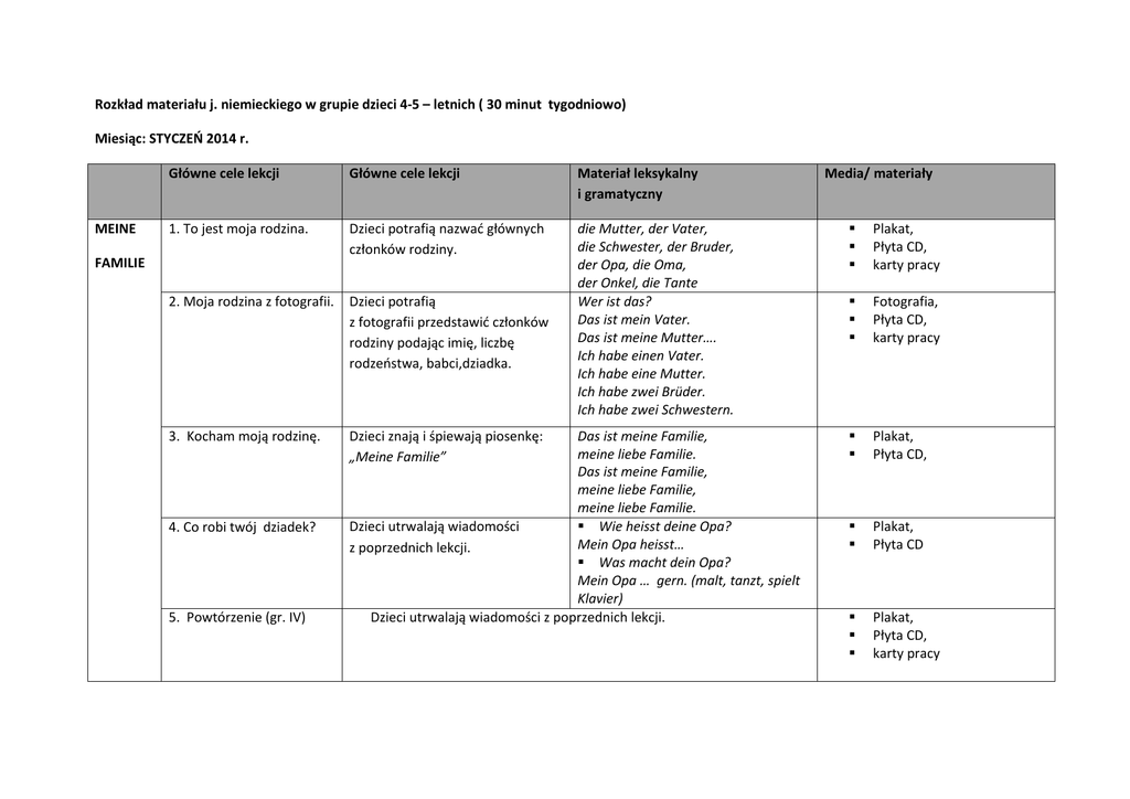 Rozkład materiału j. niemieckiego w grupie dzieci 4-5 – letnich ( 30 minut tygodniowo) Miesiąc: STYCZEŃ 2014 r. MEINE Główne cele lekcji Główne cele lekcji Materiał leksykalny i gramatyczny 1. To jest moja rodzina. Dzieci potrafią nazwać głównych członków rodziny. 2. Moja rodzina z fotografii. Dzieci potrafią z fotografii przedstawić członków rodziny podając imię, liczbę rodzeństwa, babci,dziadka. die Mutter, der Vater, die Schwester, der Bruder, der Opa, die Oma, der Onkel, die Tante Wer ist das? Das ist mein Vater. Das ist meine Mutter…. Ich habe einen Vater. Ich habe eine Mutter. Ich habe zwei Brüder. Ich habe zwei Schwestern. 3. Kocham moją rodzinę. Dzieci znają i śpiewają piosenkę: „Meine Familie” FAMILIE 4. Co robi twój dziadek? 5. Powtórzenie (gr. IV) Das ist meine Familie, meine liebe Familie. Das ist meine Familie, meine liebe Familie, meine liebe Familie. Dzieci utrwalają wiadomości Wie heisst deine Opa? Mein Opa heisst… z poprzednich lekcji. Was macht dein Opa? Mein Opa … gern. (malt, tanzt, spielt Klavier) Dzieci utrwalają wiadomości z poprzednich lekcji. Media/ materiały Plakat, Płyta CD, karty pracy Fotografia, Płyta CD, karty pracy Plakat, Płyta CD, Plakat, Płyta CD Plakat, Płyta CD, karty pracy