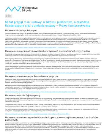 02.10.2015 Senat przyjął m.in. ustawy: o zdrowiu publicznym, o zawodzie fizjoterapeuty oraz o zmianie ustawy – Prawo farmaceutyczne Ustawa o zdrowiu publicznym Ustawa o zdrowiu publicznym przyczyni się do poprawy stanu zdrowia polskiego społeczeństwa – przede wszystkim poprzez ustanowienie Narodowego Programu Zdrowia, który będzie dokumentem strategicznym dla zdrowia publicznego. Pierwszy NPZ obejmie lata 2016 – 2020. Ustawa wprowadza mechanizmy koordynacji działań administracji rządowej i samorządowej w obszarze zdrowia, określa źródła finansowania zadań z zakresu zdrowia publicznego i wskazuje sposób wyłaniania realizatorów tych zadań. Przewiduje ona możliwość powołania Pełnomocnika Rządu do Spraw Zdrowia Publicznego, który będzie koordynował, inicjował i monitorował realizację przepisów przewidzianych ustawie. Utworzone zostaną również Komitet Sterujący Narodowego Programu Zdrowia (w jego skład wejdą przedstawiciele ministerstw odpowiedzialnych za wdrażanie zadań określonych w NPZ) oraz Rada do Spraw Zdrowia Publicznego, odpowiedzialna za planowanie i monitorowanie zadań prowadzonych w zdrowiu publicznym. Informowaliśmy o uchwaleniu ustawy o zdrowiu publicznym przez sejm w komunikacie z 11 września 2015 r. Ustawa o zmianie ustawy o wyrobach medycznych oraz niektórych innych ustaw Nowelizacja ustawy o wyrobach medycznych reguluje obrót i używanie wyrobów medycznych (również sprzedaż przez internet), nadzór nad rynkiem wyrobów medycznych, zadania organów odpowiedzialnych oraz wymagania dotyczące podmiotów działających w tym obszarze. Nowe regulacje dostosowują prawodawstwo krajowe do regulacji wspólnotowych. Stanowią, że odpowiedzialność za bezpieczeństwo wyrobów ponosi ich wytwórca, a w niektórych przypadkach bezpośredni nadzór na etapie projektowania i wytwarzania sprawują niezależne jednostki notyfikowane, które w Polsce są autoryzowane i nadzorowane przez ministra zdrowia. Rejestrację i nadzór nad rynkiem wyrobów medycznych sprawuje prezes Urzędu Rejestracji Produktów Leczniczych, Wyrobów Medycznych i Produktów Biobójczych. Zmiany wprowadzone ustawą dotyczą wyznaczania i nadzorowania jednostek notyfikowanych, zgłaszania danych o wyrobach, oceny incydentów medycznych oraz prowadzenia badań klinicznych z wyrobami medycznymi – zwiększają bezpieczeństwo ich uczestników i ułatwiają procedury wydawania pozwoleń na te badania. Informowaliśmy o uchwaleniu nowelizacji ustawy o wyrobach medycznych oraz niektórych innych ustaw przez sejm w komunikacie z 11 września 2015 r. Ustawa o zmianie ustawy – Prawo farmaceutyczne Nowelizacja prawa farmaceutycznego zmienia zasady finansowania niekomercyjnych badań klinicznych na korzyść sponsorów. Na mocy nowych przepisów procedury medyczne, które znajdują się w koszyku świadczeń gwarantowanych, będą finansowane przez NFZ (dotąd finansowały je jednostki prowadzące badania, co było dla nich dużym obciążeniem). Taka forma wsparcia finansowego przyczyni się do wzrostu liczby prowadzonych badań klinicznych przez jednostki naukowe, a co za tym idzie – wpłynie na rozwój badań naukowych w Polsce. Dzięki temu pacjenci, którzy cierpią na choroby rzadkie, lub u których nie uzyskano pozytywnego efektu poprzez zastosowanie terapii standardowych, będą mieli dostęp do innowacyjnego leczenia. Informowaliśmy o tym, że sejm przyjął nowelizację ustawy – Prawo farmaceutyczne w komunikacie z 25 września 2015 r. Ustawa o zawodzie fizjoterapeuty Ustawa reguluje zasady wykonywania zawodu fizjoterapeuty (m.in. kształcenia, uzyskiwania prawa do wykonywania zawodu, kompetencji zawodowych oraz zasad odpowiedzialności zawodowej i organizacji samorządu zawodowego). Powstała w trosce o bezpieczeństwo pacjentów oraz zapewnienie im wysokiej jakości udzielanych świadczeń. Uchwalone przepisy mają na celu podniesienie prestiżu zawodu fizjoterapeuty. Dopuszczają do jego wykonywania tylko te osoby, które posiadają odpowiednie kwalifikacje potwierdzone dyplomem i działające w oparciu o Evidence Based Medicine. Aby w jak największym stopniu zadbać o bezpieczeństwo zdrowotne pacjentów, ustawa umożliwia także skuteczne pociąganie do odpowiedzialności karnej osoby, które podają się za fizjoterapeutów, choć nie posiadają odpowiednich kwalifikacji. Informowaliśmy o tym, że sejm przyjął ustawę o zawodzie fizjoterapeuty w komunikacie z 25 września 2015 r. Ustawa o zmianie ustawy o świadczeniach opieki zdrowotnej finansowanych ze środków publicznych Ustawa rozszerza zakres podmiotów uprawnionych do bezpłatnego zaopatrzenia w niektóre leki dostępne w aptekach z przepisu lekarza oraz objęte refundacją środki spożywcze specjalnego przeznaczenia żywieniowego. Uprawnieniami tymi mają zostać dodatkowo objęci żołnierze zastępczej służby wojskowej, którzy w okresie wczesnego PRL-u (1949 – 1959) byli przymusowo zatrudniani w zakładach wydobycia i wzbogacania rud uranowych i otrzymali jednorazowe odszkodowanie w związku z przymusowym zatrudnieniem w tych zakładach, wypłacone tym osobom w przeszłości na podstawie odrębnych przepisów, albo w odniesieniu do których zostało orzeczone inwalidztwo będące następstwem przymusowego zatrudnienia w kopalniach, kamieniołomach lub batalionach budowlanych. Ustawa o finansowaniu niektórych świadczeń zdrowotnych w latach 2015 – 2018 Ustawa o finansowaniu niektórych świadczeń zdrowotnych w latach 2015 – 2018 Ustawa wprowadza zmiany w sposobie przekazywania dotacji z budżetu państwa do Narodowego Fundusz Zdrowia na finansowanie świadczeń dla osób nieubezpieczonych (w tym dzieci). Zmiana ta będzie polegała na przejściu na system ryczałtowy, z określoną ustawowo kwotą dotacji: 320 232 000 zł rocznie, przy czym przekazywanie miałoby następować co miesiąc w wysokości 1/12 tej kwoty. Ustawa o zmianie ustawy o Państwowym Ratownictwie Medy
