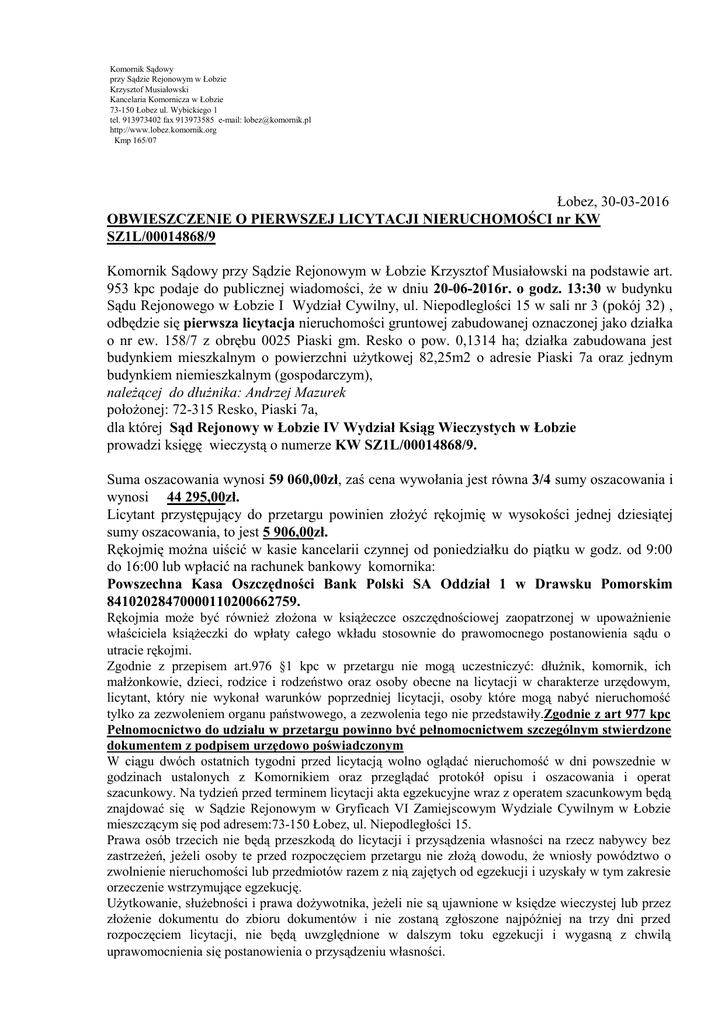 Łobez, 30-03-2016 OBWIESZCZENIE O PIERWSZEJ LICYTACJI