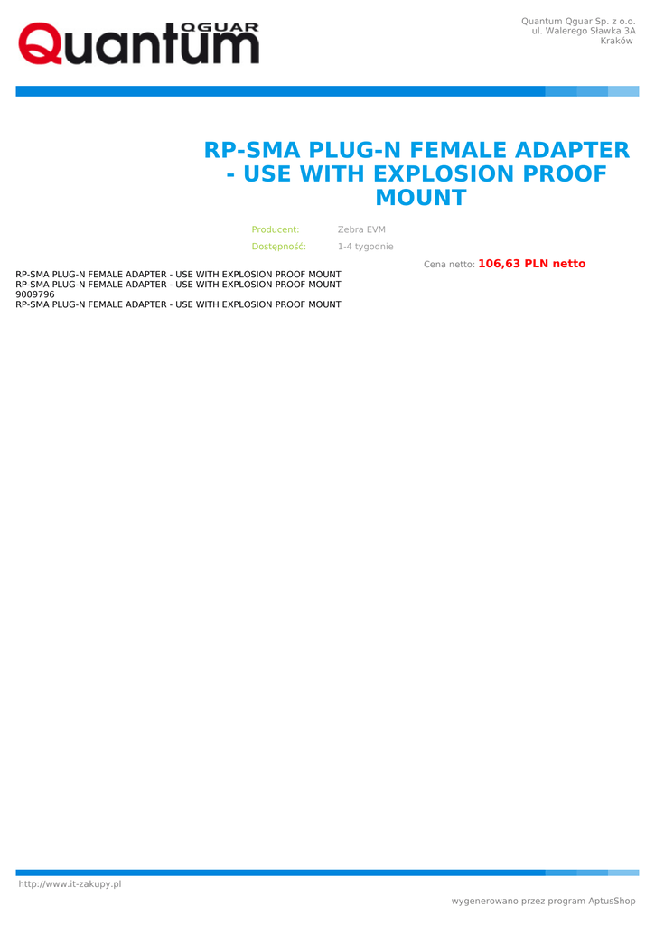 Quantum Qguar Sp. z o.o. ul. Walerego Sławka 3A Kraków RP-SMA PLUG-N FEMALE ADAPTER - USE WITH EXPLOSION PROOF MOUNT Producent: Zebra EVM Dostępność: 1-4 tygodnie Cena netto: 106,63 PLN netto RP-SMA PLUG-N FEMALE ADAPTER - USE WITH EXPLOSION PROOF MOUNT RP-SMA PLUG-N FEMALE ADAPTER - USE WITH EXPLOSION PROOF MOUNT 9009796 RP-SMA PLUG-N FEMALE ADAPTER - USE WITH EXPLOSION PROOF MOUNT http://www.it-zakupy.pl wygenerowano przez program AptusShop