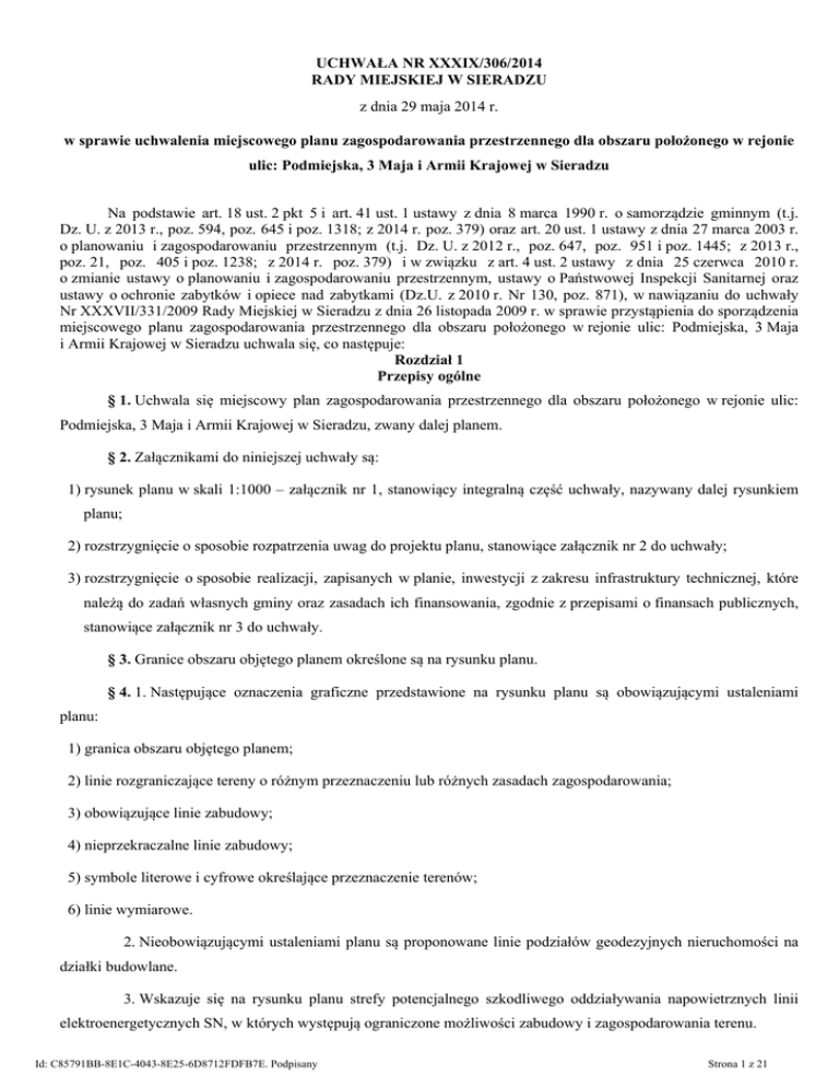 UCHWAŁA NR XXXIX/306/2014 RADY MIEJSKIEJ W SIERADZU z dnia 29 maja 2014 r. w sprawie uchwalenia miejscowego planu zagospodarowania przestrzennego dla obszaru położonego w rejonie ulic: Podmiejska, 3 Maja i Armii Krajowej w Sieradzu Na podstawie art. 18 ust. 2 pkt 5 i art. 41 ust. 1 ustawy z dnia 8 marca 1990 r. o samorządzie gminnym (t.j. Dz. U. z 2013 r., poz. 594, poz. 645 i poz. 1318; z 2014 r. poz. 379) oraz art. 20 ust. 1 ustawy z dnia 27 marca 2003 r. o planowaniu i zagospodarowaniu przestrzennym (t.j. Dz. U. z 2012 r., poz. 647, poz. 951 i poz. 1445; z 2013 r., poz. 21, poz. 405 i poz. 1238; z 2014 r. poz. 379) i w związku z art. 4 ust. 2 ustawy z dnia 25 czerwca 2010 r. o zmianie ustawy o planowaniu i zagospodarowaniu przestrzennym, ustawy o Państwowej Inspekcji Sanitarnej oraz ustawy o ochronie zabytków i opiece nad zabytkami (Dz.U. z 2010 r. Nr 130, poz. 871), w nawiązaniu do uchwały Nr XXXVII/331/2009 Rady Miejskiej w Sieradzu z dnia 26 listopada 2009 r. w sprawie przystąpienia do sporządzenia miejscowego planu zagospodarowania przestrzennego dla obszaru położonego w rejonie ulic: Podmiejska, 3 Maja i Armii Krajowej w Sieradzu uchwala się, co następuje: Rozdział 1 Przepisy ogólne § 1. Uchwala się miejscowy plan zagospodarowania przestrzennego dla obszaru położonego w rejonie ulic: Podmiejska, 3 Maja i Armii Krajowej w Sieradzu, zwany dalej planem. § 2. Załącznikami do niniejszej uchwały są: 1) rysunek planu w skali 1:1000 – załącznik nr 1, stanowiący integralną część uchwały, nazywany dalej rysunkiem planu; 2) rozstrzygnięcie o sposobie rozpatrzenia uwag do projektu planu, stanowiące załącznik nr 2 do uchwały; 3) rozstrzygnięcie o sposobie realizacji, zapisanych w planie, inwestycji z zakresu infrastruktury technicznej, które należą do zadań własnych gminy oraz zasadach ich finansowania, zgodnie z przepisami o finansach publicznych, stanowiące załącznik nr 3 do uchwały. § 3. Granice obszaru objętego planem określone są na rysunku planu. § 4. 1. Następujące oznaczenia graficzne przedstawione na rysunku planu są obowiązującymi ustaleniami planu: 1) granica obszaru objętego planem; 2) linie rozgraniczające tereny o różnym przeznaczeniu lub różnych zasadach zagospodarowania; 3) obowiązujące linie zabudowy; 4) nieprzekraczalne linie zabudowy; 5) symbole literowe i cyfrowe określające przeznaczenie terenów; 6) linie wymiarowe. 2. Nieobowiązującymi ustaleniami planu są proponowane linie podziałów geodezyjnych nieruchomości na działki budowlane. 3. Wskazuje się na rysunku planu strefy potencjalnego szkodliwego oddziaływania napowietrznych linii elektroenergetycznych SN, w których występują ograniczone możliwości zabudowy i zagospodarowania terenu. Id: C85791BB-8E1C-4043-8E25-6D8712FDFB7E. Podpisany Strona 1 z 21 § 5. 1. Ilekroć w uchwale jest mowa o: 1) uchwale – należy przez to rozumieć niniejszą uchwałę Rady Miejskiej w Sieradzu; 2) przepisach odrębnych – należy przez to rozumieć przepisy ustaw wraz z aktami wykonawczymi; 3) planie – należy przez to rozumieć miejscowy plan zagospodarowania przestrzennego, o którym mowa w § 1 uchwały, o ile z treści nie wynika inaczej; 4) usługach publicznych – należy przez to rozumieć usługi służące zaspokojeniu potrzeb publicznych w zakresie oświaty, kultury, zdrowia, bezpieczeństwa i administracji publicznej, opieki społecznej, łączności, gastronomii, itp.; 5) usługach podstawowych – należy przez to rozumieć usługi, których zasadniczym zadaniem jest zaspokajanie codziennych potrzeb mieszkańców i użytkowników okolicznych terenów – takie jak handel, kosmetyka, naprawa obuwia i odzieży, pralnie, magiel, biura, kancelarie adwokackie, indywidualne gabinety lekarskie, zakłady fotograficzne i punkty kserograficzne, itp.; 6) liniach rozgraniczających – należy przez to rozumieć linie rozgraniczające tereny o różnym przeznaczeniu lub różnych zasadach zagospodarowania; 7) obowiązujących liniach zabudowy – należy przez to rozumieć linie wyznaczone na rysunku planu, w których musi zostać usytuowane zewnętrzne lico ściany budynku i które nie dotyczą takich elementów architektonicznych jak: balkony, schody, okapy, wykusze, zadaszenia oraz innych detali wystroju architektonicznego; 8) nieprzekraczalnych liniach zabudowy – należy przez to rozumieć linie wyznaczone na rysunku planu, które określają najmniejszą dopuszczalną odległość usytuowania zewnętrznego lica ściany budynku i które nie dotyczą takich elementów architektonicznych jak: balkony, schody, okapy, wykusze, zadaszenia oraz innych detali wystroju architektonicznego; 9) działce budowlanej – należy przez to rozumieć działkę budowlaną stosownie do definicji zawartej w ustawie o planowaniu i zagospodarowaniu przestrzennym; 10) froncie działki budowlanej – należy przez to rozumieć granicę działki budowlanej lub nieruchomości, która przylega do drogi, z której odbywa się główny wjazd lub wejście na działkę; 11) powierzchni użytkowej – należy przez to rozumieć powierzchnię wszystkich pomieszczeń służących do zaspokojenia potrzeb związanych bezpośrednio z przeznaczeniem budynku lub jego wydzielonej części, na wszystkich kondygnacjach; 12) powierzchni zabudowy – należy przez to rozumieć powierzchnię działki zajętą przez rzuty poziome wszystkich budynków w ich obrysie zewnętrznym; 13) wysokości – należy przez to rozumieć wysokość budynku mierzoną od poziomu terenu przy głównym wejściu do budynku do najwyższego punktu dachu, gdzie najwyższym punktem dachu przy dachach spadowych jest najwyższa kalenica, a przy dachach płaskich gzyms, attyka lub inny najwyższy punkt pokrycia kubatury budynku z wyłączeniem kominów; Id: C85791BB-8E1C-4043-8E25-6D8712FDFB7E. Podpisany Strona 2 z 21 14) urządzeniach terenowych – należy przez to rozumieć obiekty służące rekreacji, np.: wyp