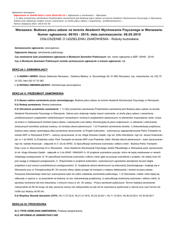 Ogłoszenie powiązane: Ogłoszenie nr 35449-2015 z dnia 2015-03-13 r. Ogłoszenie o zamówieniu - Warszawa 1.1) Opis przedmiotu zamówienia Przedmiotem zamówienia jest Budowa placu zabaw na terenie Akademii Wychowania Fizycznego w Warszawie. Zakres prac obejmuje między innymi wykonanie: a) strefy placu zabaw z serpentyną - prefabrykowanym... Termin składania ofert: 2015-03-30 Warszawa: Budowa placu zabaw na terenie Akademii Wychowania Fizycznego w Warszawie. Numer ogłoszenia: 66163 - 2015; data zamieszczenia: 08.05.2015 OGŁOSZENIE O UDZIELENIU ZAMÓWIENIA - Roboty budowlane Zamieszczanie ogłoszenia: obowiązkowe. Ogłoszenie dotyczy: zamówienia publicznego. Czy zamówienie było przedmiotem ogłoszenia w Biuletynie Zamówień Publicznych: tak, numer ogłoszenia w BZP: 35449 - 2015r. Czy w Biuletynie Zamówień Publicznych zostało zamieszczone ogłoszenie o zmianie ogłoszenia: tak. SEKCJA I: ZAMAWIAJĄCY I. 1) NAZWA I ADRES: Miasto Stołeczne Warszawa - Dzielnica Bielany, ul. śeromskiego 29, 01-882 Warszawa, woj. mazowieckie, tel. 022 37 33 333, faks 022 37 33 382. I. 2) RODZAJ ZAMAWIAJĄCEGO: Administracja samorządowa. SEKCJA II: PRZEDMIOT ZAMÓWIENIA II.1) Nazwa nadana zamówieniu przez zamawiającego: Budowa placu zabaw na terenie Akademii Wychowania Fizycznego w Warszawie.. II.2) Rodzaj zamówienia: Roboty budowlane. II.3) Określenie przedmiotu zamówienia: 1.1) Opis przedmiotu zamówienia Przedmiotem zamówienia jest Budowa placu zabaw na terenie Akademii Wychowania Fizycznego w Warszawie. Zakres prac obejmuje między innymi wykonanie: a) strefy placu zabaw z serpentyną prefabrykowanym urządzeniem wielofunkcyjnym trampolinami i drobnymi urządzeniami zabawowymi; b) elementów wyposaŜenia: ławki, kosze na śmieci w realizowanych strefach (placu zabaw i wspinaczki) oraz tablicy informacyjnej na placu wejściowym; c) załoŜenia i odtworzenia zniszczonych trawników podczas budowy; d) montaŜu siłowni plenerowych. 1.2) Przedmiot zamówienia określa: 1) Dokumentacja projektowa budowy placu zabaw zawierającą niŜej wymienione opracowania: a) Projekt budowlano - wykonawczy zagospodarowania Parku Trampolin na terenie AWF w Warszawie ETAP I - autorzy opracowania: dr inŜ. Kinga Zinowiec-Cieplik, mgr inŜ. Zofia Wierzbicka, mgr inŜ. Janusz Krakowski zał. nr 1 do SIWZ, b) Przedmiar robót: Park Trampolin na terenie AWF oraz Przedmiar robót: MontaŜ siłowni plenerowych - autor opracowania mgr inŜ. Izabela Krawczyk - załącznik nr 2 i 2a do SIWZ. 2) Specyfikacja techniczna wykonania i odbioru robót - Budowa Parku Trampolin Etap I przy ul. Marymonckiej 34 w Warszawie - teren Akademia Wychowania Fizycznego Józefa Piłsudskiego w Warszawie,autor opracowania: dr inŜ. Kinga Zinowiec-Cieplik - załącznik nr 3 do SIWZ. UWAGA!!! A. W projekcie wykreślono pozycje, które nie będą realizowane w ramach niniejszego postępowania. B. W specyfikacji technicznej wykonania i odbioru robót ujęte są pozycje wykreślone z projektu, nie naleŜy brać ich pod uwagę w niniejszym postępowaniu. C. Wspomniane w projekcie budowlano -wykonawczym ogrodzenie zewnętrzne nie jest objęte projektem a tym samym przedmiotowym postępowaniem. D. Urządzenia siłowni plenerowych są własnością Zamawiającego i znajdują się w Warszawie przy ul. Powązkowskiej 93. Do wyceny oferty naleŜy przyjąć ich transport z miejsca składowania i montaŜ na placu zabaw. PowyŜsza dokumentacja moŜe być wykorzystana tylko do celów udzielenia zamówienia publicznego. 1.3) Wykonanie i odbiór robót będą się odbywały w oparciu o: a) pozwolenie na budowę; b) ww. dokumentację projektową; c) specyfikację techniczną wykonania i odbioru robót; d) aprobaty techniczne lub inne dokumenty, o których mowa w art. 30 ustawy - Prawo zamówień publicznych; Termin realizacji zamówienia: maksymalnie do 90 dni licząc od daty zawarcia umowy lub maksymalnie na tyle dni ile wykonawca zaoferował w ofercie przy czym termin nie moŜe być dłuŜszy niŜ 90 dni.. II.4) Wspólny Słownik Zamówień (CPV): 45.11.27.23-9, 45.21.21.40-9, 45.23.32.00-1, 45.11.12.00-0, 45.26.23.00-4, 43.32.50.00-7. SEKCJA III: PROCEDURA III.1) TRYB UDZIELENIA ZAMÓWIENIA: Przetarg nieograniczony III.2) INFORMACJE ADMINISTRACYJNE Zamówienie dotyczy projektu/programu finansowanego ze środków Unii Europejskiej: nie SEKCJA IV: UDZIELENIE ZAMÓWIENIA IV.1) DATA UDZIELENIA ZAMÓWIENIA: 07.05.2015. IV.2) LICZBA OTRZYMANYCH OFERT: 10. IV.3) LICZBA ODRZUCONYCH OFERT: 1. IV.4) NAZWA I ADRES WYKONAWCY, KTÓREMU UDZIELONO ZAMÓWIENIA: C.G.A. FRU-MAL Development sp. z o.o., ul. Ostrzycka 2/4, 04-035 Warszawa, kraj/woj. mazowieckie. IV.5) Szacunkowa wartość zamówienia (bez VAT): 762007,84 PLN. IV.6) INFORMACJA O CENIE WYBRANEJ OFERTY ORAZ O OFERTACH Z NAJNIśSZĄ I NAJWYśSZĄ CENĄ Cena wybranej oferty: 745591,75 Oferta z najniŜszą ceną: 745591,75 / Oferta z najwyŜszą ceną: 1000000,00 Waluta: PLN.