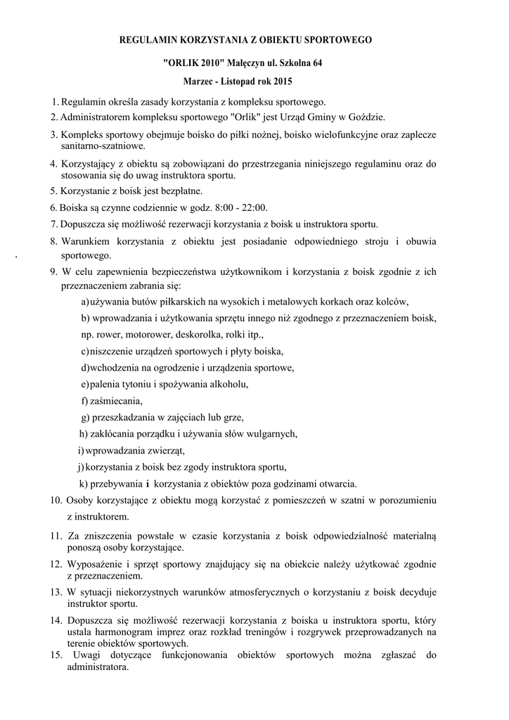 REGULAMIN KORZYSTANIA Z OBIEKTU SPORTOWEGO "ORLIK 2010" Małęczyn ul. Szkolna 64 Marzec - Listopad rok 2015 1. Regulamin określa zasady korzystania z kompleksu sportowego. 2. Administratorem kompleksu sportowego "Orlik" jest Urząd Gminy w Goździe. 3. Kompleks sportowy obejmuje boisko do piłki nożnej, boisko wielofunkcyjne oraz zaplecze sanitarno-szatniowe. 4. Korzystający z obiektu są zobowiązani do przestrzegania niniejszego regulaminu oraz do stosowania się do uwag instruktora sportu. 5. Korzystanie z boisk jest bezpłatne. 6. Boiska są czynne codziennie w godz. 8:00 - 22:00. 7. Dopuszcza się możliwość rezerwacji korzystania z boisk u instruktora sportu. . 8. Warunkiem korzystania z obiektu jest posiadanie odpowiedniego stroju i obuwia sportowego. 9. W celu zapewnienia bezpieczeństwa użytkownikom i korzystania z boisk zgodnie z ich przeznaczeniem zabrania się: a) używania butów piłkarskich na wysokich i metalowych korkach oraz kolców, b) wprowadzania i użytkowania sprzętu innego niż zgodnego z przeznaczeniem boisk, np. rower, motorower, deskorolka, rolki itp., c) niszczenie urządzeń sportowych i płyty boiska, d)wchodzenia na ogrodzenie i urządzenia sportowe, e) palenia tytoniu i spożywania alkoholu, f) zaśmiecania, g) przeszkadzania w zajęciach lub grze, h) zakłócania porządku i używania słów wulgarnych, i) wprowadzania zwierząt, j) korzystania z boisk bez zgody instruktora sportu, k) przebywania i korzystania z obiektów poza godzinami otwarcia. 10. Osoby korzystające z obiektu mogą korzystać z pomieszczeń w szatni w porozumieniu z instruktorem. 11. Za zniszczenia powstałe w czasie korzystania z boisk odpowiedzialność materialną ponoszą osoby korzystające. 12. Wyposażenie i sprzęt sportowy znajdujący się na obiekcie należy użytkować zgodnie z przeznaczeniem. 13. W sytuacji niekorzystnych warunków atmosferycznych o korzystaniu z boisk decyduje instruktor sportu. 14. Dopuszcza się możliwość rezerwacji korzystania z boiska u instruktora sportu, który ustala harmonogram imprez oraz rozkład treningów i rozgrywek przeprowadzanych na terenie obiektów sportowych. 15. Uwagi dotyczące funkcjonowania obiektów sportowych można zgłaszać do administratora.