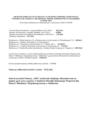 REJESTR ZEBRANYCH FUNDUSZY NA BUDOWĘ OŚRODKA DZIENNEGO WSPARCIA DLA DZIECI I MŁODZIEŻY NIEPEŁNOSPRAWNEJ W MALBORKU ZA ROK 2015 /Pozwolenie Ministerstwa Administracji i Cyfryzacji nr 20015/158/OR/ Festiwal Boże Narodzenie w sztuce Malbork 16.01.2015r. - 832,52zł. Koncert Ani Rusowicz /cegiełki/ Malbork 16.01.2015r. - 1650zł. Zbiórka do puszek kwestarskich Dni Malborka 14.06.2015r. - 210,20zł. Skarbony stacjonarne : 657,35zł. Skarbona nr 1-Sklep Sportowy 2a A.Piętaszewska, A.Gorczyński ul. Piłsudskiego11/12- /28,06zł./ Skarbona nr 2- Apteka „Euro-Pharm” ul. Kościuszki 4 Skarbona nr 3- Fryzjerstwo Justyna Mazur ul. 17 Marca 42a/1- /124,84zł./ Skarbona nr 4 - Centrum Informacji Turystycznej ul. Kościuszki 54- /15,15zł./ Skarbona nr 5-Parafia Rzymsko-katolicka pw. Zesłania Ducha Świętego ul. Nogatowa 7-/489,30zł./ Łączna kwota zebrana w czasie zbiórki publicznej na budowę Ośrodka Dziennego Wsparcia dla Dzieci i Młodzieży Niepełnosprawnej w Malborku /wg pozwolenia Ministerstwa Administracji i Cyfryzacji nr 20015/158/OR/wyniosła – 3350,07zł. Koszty przeprowadzonej zbiórki publicznej wyniosły – 17,97zł. Suma po odliczeniu kosztów wynosi – 3332,10zł. Stowarzyszenie Pomocy „Miś” serdecznie dziękuje ofiarodawcom za piękny gest serca i pomoc w budowie Ośrodka Dziennego Wsparcia dla Dzieci i Młodzieży Niepełnosprawnej w Malborku.