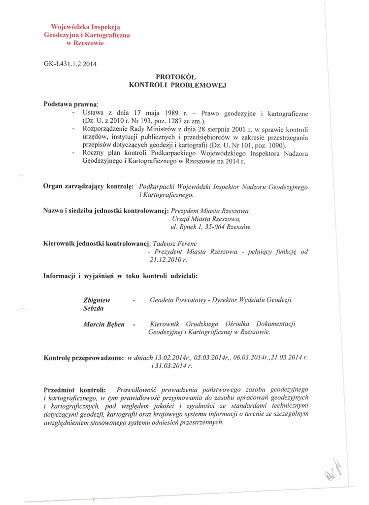 Wojewódzka Inspekcja Geodezyjna i Kartograficzna w Rzeszowie GK-I.431.1.2.2014 PROTOKÓŁ KONTROLI PROBLEMOWEJ Podstawa prawna: Ustawa z dnia 17 maja 1989 r. — Prawo geodezyjne i kartograficzne (Dz. U. z 2010 r. Nr 193, poz. 1287 ze zm.). Rozporządzenie Rady Ministrów z dnia 28 sierpnia 2001 r. w sprawie kontroli urzędów, instytucji publicznych i przedsiębiorców w zakresie przestrzegania przepisów dotyczących geodezji i kartografii (Dz. U. N r 101, poz. 1090). Roczny plan kontroli Podkarpackiego Wojewódzkiego Inspektora Nadzoru Geodezyjnego i Kartograficznego w Rzeszowie na 2014 r. Organ zarządzający kontrolę: Podkarpacki Wojewódzki Inspektor Nadzoru Geodezyjnego i Kartograficznego. Nazwa i siedziba jednostki kontrolowanej: Prezydent Miasta Rzeszowa, Urząd Miasta Rzeszowa, ul. Rynek 1, 35-064 Rzeszów. Kierownik jednostki kontrolowanej: Tadeusz Ferenc - Prezydent Miasta Rzeszowa - pełniący funkcję od 21.12.2010 r. Informacji i wyjaśnień w toku kontroli udzielali: Zbigniew Sebzda - Geodeta Powiatowy - Dyrektor Wydziału Geodezji. Marcin Bęben - Kierownik Grodzkiego Ośrodka Dokumentacji Geodezyjnej i Kartograficznej w Rzeszowie. Kontrolę przeprowadzono: w dniach 13.02.2014r., 05.03.2014r., 06.03.2014r.,21.03.2014 r. i 31.03.2014 r. Przedmiot kontroli: Prawidłowość prowadzenia państwowego zasobu geodezyjnego i kartograficznego, w tym prawidłowość przyjmowania do zasobu opracowań geodezyjnych i kartograficznych, p o d względem jakości i zgodności ze standardami technicznymi dotyczącymi geodezji, kartografii oraz krajowego systemu informacji o terenie ze szczególnym uwzględnieniem stosowanego systemu odniesień przestrzennych. Zakres kontroli: Wytyczne metodologiczne przeprowadzenia kontroli problemowej zalecone do stosowania przez Głównego Geodetę Kraju pismem z dnia 20.02.2014r. nr NG.NIK.0935.2.2014. Podkarpacki Wojewódzki Inspektor Nadzoru Geodezyjnego i Kartograficznego pismem z dnia 14.01.2014 r. nr GK-I.431.1.2.2014 zawiadomił Prezydenta Miasta Rzeszowa 0 rozpoczynającej się kontroli problemowej fstr. 1-2 akt kontroli] - elektroniczna platforma usług administracji publicznej e-PUAP. Urzędowe Poświadczenie Przedłożenia (UPP) z dnia 14.01.2014 r. fstr. 3 akt kontroli]. Kontrolę przeprowadziły: Urszula Nabel - Kierownik zespołu kontrolującego - straszy inspektor wojewódzki w Oddziale Kontroli i Nadzoru Geodezyjnego i Kartograficznego w Wojewódzkiej Inspekcji Geodezyjnej i Kartograficznej w Rzeszowie - koordynator kontroli na podstawie upoważnienia nr GK-I.431.1.2.2014 z dnia 14.01.2014 r. udzielonego przez Podkarpackiego Wojewódzkiego Inspektora Nadzoru Geodezyjnego i Kartograficznego [strona nr 4 akt kontroli]. Marta Krzyżanowska - straszy specjalista w Oddziale Kontroli i Nadzoru Geodezyjnego 1 Kartograficznego w Wojewódzkiej Inspekcji Geodezyjnej i Kartograficznej w Rzeszowie na podstawie upoważnienia nr GK-I.431.1.2.2014 z dnia 14.01.2014 r. udzielonego przez Podkarpackiego Wojewódzkiego Inspektora Nadzoru Geodezyjnego i Kartograficznego [strona nr 5 akt kontroli]. Kontrolą został objęty rok 2013 i rok bieżący. Obowiązujące przepisy: 1. Ustawa z dnia 17 maja 1989 r. Prawo geodezyjne i kartograficzne (t.j. Dz. U. Nr 193 z 2010 r. poz. 1287 z późn. zm.) (zadana dalej ustawą). 2. Ustawa z dnia 4 marca 2010 r. o infrastrukturze informacji przestrzennej (Dz. U. Nr 76, poz. 489 ze zm). 3. Rozporządzenie Rady Ministrów z dnia 15 października 2012 r. w sprawie państwowego systemu odniesień przestrzennych (Dz. U. z 2012 r., poz. 1247). 4. Rozporządzenie Ministra Spraw Wewnętrznych i Administracji z dnia 9 listopada 2011 r. w sprawie standardów technicznych wykonywania pomiarów sytuacyjnych i wysokościowych oraz opracowywania i przekazywania wyników tych pomiarów do państwowego zasobu geodezyjnego i kartograficznego (Dz. U. Nr 263, poz. 1572) (zwana dalej rozporządzeniem o standardach). 5. Rozporządzenie Ministra Rozwoju Regionalnego i Budownictwa z dnia 16 lipca 2001 r. w sprawie zgłaszania prac geodezyjnych i kartograficznych, ewidencjonowania systemów i przechowywania kopii zabezpieczających bazy danych, a także ogólnych warunków umów o udostępnianie tych baz (Dz. U. Nr 78, poz. 837) (zwane dalej rozporządzeniem w sprawie zgłaszania prac). Protokół kontroli problemowej w Urzędzie Miasta w Rzeszowie GK-1.431.1.2.2014 S trona 2 z 15 6. Rozporządzenie Ministra Rozwoju Regionalnego i Budownictwa z dnia 29 marca 2001 r. w sprawie ewidencji gruntów i budynków (Dz. U. Nr 38, poz. 455) (zwana dalej rozporządzeniem EGiB). 7. Rozporządzenia Ministra Administracji i Cyfryzacji z dnia 29 listopada 2013 r. zmieniające rozporządzenia w sprawie ewidencji gruntów i budynków (Dz. U. z dnia 16 grudnia 2013 r., poz. 1551). 8. Rozporządzenie Ministra Spraw Wewnętrznych i Administracji z dnia 17 maja 1999 r. w sprawie określenia rodzajów materiałów stanowiących państwowy zasób geodezyjny i kartograficzny, sposobu i trybu ich gromadzenia i wyłączania z zasobu oraz udostępniania zasobu (zwane dalej rozporządzeniem o zasobie) Uwaga: rozporządzenie uchylone z dniem 8 czerwca 2012 r. (art. 23 pkt 13 lit „c”, art. 35 ustawy z dnia 4 marca 2010 r. o infrastrukturze informacji przestrzennej). 9. Rozporządzenie Ministra Administracji i Cyfryzacji z dnia 5 września 2013 r. w sprawie organizacji i trybu prowadzenia państwowego zasobu geodezyjnego i kartograficznego (Dz. U. z dnia 7 października 2013 r., poz. 1183). 10. Rozporządzenie Ministra Infrastruktury z dnia 19 lutego 2004 r. w sprawie wysokości opłat za czynności geodezyjne i kartograficzne oraz udzielanie informacji, a także za wykonywanie wyrysów i wypisów z operatu ewidencyjnego (Dz. U. Nr 37, poz. 333) (zwana dalej rozporządzeniem o opłatach). OPIS STANU FAKTYCZNEGO I USTALONE NIEPRAWIDŁOWOŚCI Siedziba Urzędu Miasta Rzeszowa znajduje się w Rzeszowie przy ul. Rynek 1. 1. Ustalenia formalno-organizacyjne. 1.1 Kierownik je