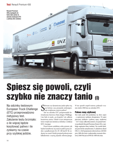 Test Renault Premium 430 Renault Premium 430 przystąpiło do testu stylu jazdy na odcinku testowym ETC z połową dmc zestawu Spiesz się powoli, czyli szybko nie znaczy tanio (I) Na odcinku testowym European Truck Challenge (ETC) przeprowadzono nietypowy test. Założenie testu brzmiało: o ile więcej będzie kosztować paliwo i ile zyskamy na czasie przy szybkiej jeździe. 14 S łowem czy dynamiczna jazda opłaci się, czy krótszy czas przejazdu zrekompensuje zwiększone zużycie paliwa? Test na odcinku ETC przeprowadził doświadczony kierowca Hans-Jürgen Wildhage. I nie było to jazda „na kropelce”, ale całkiem kosztowna szarża. Udział w tym nietypowym teście wzięli nasi niemieccy koledzy z redakcji KFZ-Anzeiger. Przed testem zadaliśmy sobie pytanie: jak będzie kształtować się zużycie paliwa przy jeździe z prędkościami 82, 85 i 88 km/h? Ile zyskamy na czasie? Każdy przejazd pokonywano kilkukrotnie z asystą pojazdu referencyjnego. W ten sposób zespół testowy pokonał w sumie około 2900 km na odcinku ETC. Połowa masy użytkowej Test stylu jazdy był podzielony na dwie części – z częściowym i pełnym obciążeniem. W części pierwszej jeżdżono z połową masy użytkowej – 25,7 t masy całkowitej zestawu. Za pojazd testowy posłużyło Renault Premium Route 430, z ciężkiego segmentu klasy średniej. Ten model idealnie pasował do zamysłu testu. 6-cylindrowy diesel DXi 11 z 10,8 l pojemności oferował moc 420 KM przy 1800 obr./min i maksymalny moment obrotowy 2040 Nm już od 950 do 1400 obr./min. Duet Optidriver+ i Optifuel to doskonały miks oszczędzania. Trzeba także zwrócić uwagę, że na optymalizację zużycia paliwa miało także wpływ ogumienie o zmniejszonych oporach toczenia, tylna oś z długimi przełożeniami oraz całkiem sprytny system tempomat/bremsomat Optiroll z Soft Cruise Control. Słowem Premium 430 to właściwie cały pakiet rozwiązań, który ma na celu zminimalizowanie kosztów paliwa. Optiroll z Soft Cruise Control jest na rynku od 2011 roku, od tamtej pory Renault Trucks może oferować także takie funkcje, jak wolny bieg, czyli jazda „na luzie”, ale bez rozłączonej skrzyni biegów, która cały czas jest w gotowości. Po prostu „premiumka” maksymalnie wykorzystuje pęd. Warto też zwrócić uwagę na szczególnie czułą regulację prędkości Soft Cruise Control. Jednak system Renault nie potrafi jeszcze jeździć z przewidywaniem topografii terenu, czyli tak jak najnowsze rozwiązania aktywnego tempomatu oferowane już przez Scanię i Daimlera. Reguły gry Premium uzyskiwało na autostradzie prędkość 80 km/h już przy 1137 obr./min. Dzięki temu Renault Premium Route 430 przy 25,7 t masy całkowitej zestawu ze stosunkiem mocy 16,3 KM/t i maksymalnym poziomem momentu obrotowego 79,4 Nm jeździło bardzo zwinnie i płynnie. Ten sam pojazd podczas testu w ubiegłym roku, ale maksymalnie obciążony do 40 ton dmc zestawu, pokazał że także przy przeliczniku 10,5 KM/t i 51 Nm/t wciąż prowadzi się płynnie i zachowuje optymalne właściwości jezdne. 12-biegowa automatyczna skrzynia z Optidriver + ma w tym także spory udział. Dodatkowo Premium 430 reaguje inteligentnie i z wyczuciem zarówno na topograficzne nierówności, jak i na położenie pedału gazu. Kolejnym atutem jest wyśmienicie działające sprzęgło, co wydatnie czuć podczas płynnej zmiany przełożeń. Optidriver+ dokonywał wyboru biegów w punkt, jak dobry kierowca rajdowy. System Optidriver+ sprawdził się także w funkcji zarządzającego hamulcami. Kierowcy testowi zgodnie z instrukcją organizatorów testu musieli na odcinku ETC włączyć Optidriver+ i system tempomat/bremsomat. Słowem mieli ingerować możliwie jak najmniej w styl jazdy wyznaczany przez systemy. Tylko w ten sposób można uzyskać, przy asyście pojazdu referencyjnego, przekonujące i wiarygodne wyniki przy różnych zalecanych prędkościach. 25,7-tonowy zestaw na odcinku ETC 2012 Runda testowa o długości 188,5 km była podzielona na 154-kilometrowy odcinek autostrady (stopień trudności: 33 procent warunki łatwe, 32 procent średnie, 45 procent trudne) i 34,5 km wymagający odcinek dróg krajowych. W teście stylu jazdy interesujące były właściwie tylko przeciętne wartości zużycia oleju napędowego. Na autostradzie uzyskano, zgodnie z założonymi zalecanymi prędkościami maksymalnymi 82, 85 i 88 km/h, przeciętne wartości zużycia od 26,1 do 28,4 l/100 km przy przeciętnych prędkościach od 80,8 do 84,4 km/h. Pojedyncze wartości zużycia i prędkości na poszczególnych odcinkach są mniej interesujące niż wzrost zużycia i zysk na czasie. Dlatego tabela pokazuje wyłącznie procenty. Przy tym przy porównaniu stylu jazdy 82/88 Wygodnie do góry: Premium Route charakteryzuje się komfortowym wejściem po schodkach Optiroll Funkcja Optiroll umożliwia automatyczne włączenie funkcji „wybieg kontrolowany” skrzyni biegów Optidriver+, co pozwala na optymalne wykorzystanie bezwładności pojazdu, co obniża zużycie paliwa. Ta funkcja jest dostępna tylko w trybie regulacji prędkości. Jeśli na desce rozdzielczej jest włączona funkcja Optiroll, system włącza się automatycznie, gdy tempomat nie wysyła sygnału o potrzebie przyspieszenia czy hamowania. Układ przeniesienia napędu zostaje wówczas otwarty przez włączenie funkcji „wybieg kontrolowany” sterującej przystawką nadbiegów skrzyni biegów Optidriver+. Silnik pracuje wtedy na biegu jałowym. Dzięki temu jazda na długich odcinkach trasy, o niewielkim nachyleniu, przebiega w sposób optymalny. Optiroll wyłącza się automatycznie, gdy wszystkie warunki łącznie nie sprzyjają oszczędzaniu paliwa lub w przypadku jakiejkolwiek interwencji kierowcy (np. naciśnięcie pedału hamulca lub wyjście z trybu regulacji prędkości); wówczas automatycznie włącza się odpowiedni bieg. Kierowca może włączać lub wyłączać funkcję Optiroll przełącznikiem na 