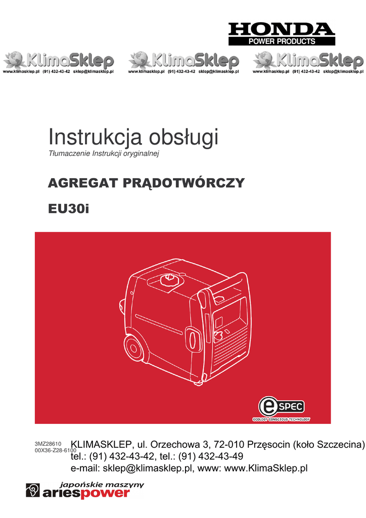 Instrukcja obsługi Tłumaczenie Instrukcji oryginalnej KLIMASKLEP, ul. Orzechowa 3, 72-010 Przęsocin (koło Szczecina) tel.: (91) 432-43-42, tel.: (91) 432-43-49 e-mail: [email protected], www: www.KlimaSklep.pl 3MZ28610 00X36-Z28-6100 Znak „e-SPEC” symbolizuje technologie odpowiedzialne rodowiskowo zastosowane przez firm Honda w urz dzeniach, które wyra aj nasze pragnienie ”zachowania rodowiska naturalnego dla przyszłych pokole ”. 2 WPROWADZENIE Dzi kujemy za zakup agregatu HONDA. Niniejsza instrukcja obsługi opisuje informacje dotycz ce obsługi i serwisowania agregatu typu EU30i. Wszystkie informacje zawarte w niniejszej instrukcji bazuj na naj wie szych danych dost pnych w momencie jej drukowania. Honda Motor Co., Ltd. zastrzega sobie prawo do wprowadzenia jakichkolwiek zmian bez wcze niejszego powiadomienia i bez zaci gania jakichkolwiek zobowi za . adna z cz ci niniejszej instrukcji nie mo e by powielana w jakiejkolwiek formie bez pisemnej zgody Aries Power Equipment Sp. z o.o. Instrukcja obsługi jest nieodł czn cz doł czona. ci agregatu i w przypadku odsprzeda y musi by do niego Sprawd lokalne przepisy przed uruchomieniem agregatu. Je li masz jakiekolwiek pytania w tej kwestii skontaktuj si z wykwalifikowanym elektrykiem. Bardzo dokładnie przeczytaj niniejsz poprzedzone nast puj cymi słowami: instrukcj . Zwró szczególn uwag na informacje Niezastosowanie si do zalece oznaczonych tym znakiem spowoduje powa ne obra enia ciała lub mier operatora lub osób postronnych. Niezastosowanie si do zalece spowodowa obra enia ciała operatora lub innych osób. oznaczonych tym znakiem mo e Tak oznaczono informacje przydatne w czasie u ytkowania agregatu. Je li masz problem lub pytania dotycz ce AGREGATU PR DOTWÓRCZEGO - skontaktuj si z autoryzowanym dealerem, lub najbli szym autoryzowanym serwisem. Generatory te zaprojektowane s w celu zapewnienia pełnej satysfakcji z ich u ywania, je eli ich obsługa jest zgodna z informacjami zamieszczonymi w niniejszej instrukcji. U ytkowanie generatora wymaga od u ytkownika pewnego wysiłku w celu zapewnienia bezpiecze stwa własnego i innych. • Ilustracje mog ró ni si w zale no ci od typu agregatu. 3 SPIS TRE CI WPROWADZENIE...............................................................................................................................3 INFORMACJE DOTYCZ CE BEZPIECZE STWA ...........................................................................5 NAKLEJKI OSTRZEGAWCZE ...........................................................................................................7 UMIEJSCOWIENIE ZNAKU CE ............................................................................................................11 OPIS ELEMENTÓW GENERATORA ...............................................................................................12 PANEL STEROWANIA ........................................................................................................................13 PRZEŁ CZNIK TRYBU PRACY ECO ....................................................................................................15 SPRAWDZENIE PRZED URUCHOMIENIEM ...................................................................................16 URUCHAMIANIE SILNIKA ...............................................................................................................21 U YTKOWANIE GENERATORA......................................................................................................24 ODBIORNIKI PR DU ZMIENNEGO .......................................................................................................26 BEZPIECZNIKI GNIAZD PR DU ZMIENNEGO (TYPY G/G8, GW, IT)........................................................27 LAMPKI KONTROLNE I OSTRZEGAWCZE..............................................................................................28 RÓWNOLEGŁE Ł CZENIE GENERATORÓW ..........................................................................................29 U YTKOWANIE WYJ CIA PR DU STAŁEGO .........................................................................................32 CZUJNIK NISKIEGO POZIOMU OLEJU ..................................................................................................33 ZATRZYMYWANIE AGREGATU ......................................................................................................34 OBSŁUGA SERWISOWA .................................................................................................................35 TABELA PRZEGL DÓW ......................................................................................................................36 NARZ DZIA ......................................................................................................................................36 WYMIANA OLEJU SILNIKOWEGO ........................................................................................................37 OBSŁUGA FILTRA POWIETRZA ...........................................................................................................38 OBSŁUGA WIECY ZAPŁONOWEJ .......................................................................................................41 TRANSPORT I MAGAZYNOWANIE.................................................................................................43 TRANSPORT.....................................................................................................................................43 MAGAZYNOWANIE ............................................................................................................................44 USUWANIE USTEREK .....................................................................................................................46 DANE TECHNICZNE.........................................................................................................................48 SCHEMATY ELEKTRYCZNE .........................................................................