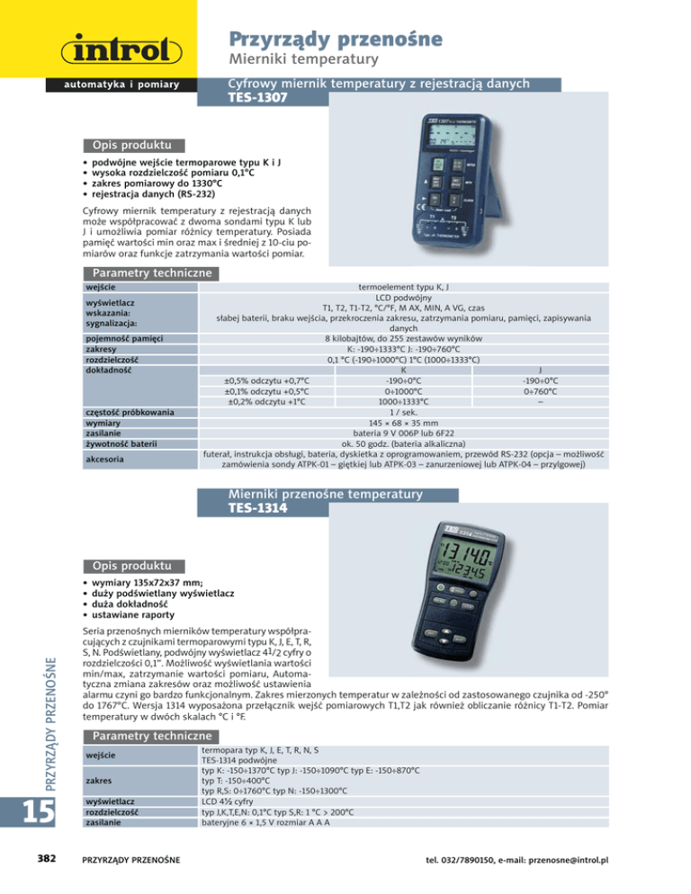 Przyrządy przenośne Mierniki temperatury Cyfrowy miernik temperatury z rejestracją danych TES-1307 Opis produktu • • • • podwójne wejście termoparowe typu K i J wysoka rozdzielczość pomiaru 0,1°C zakres pomiarowy do 1330°C rejestracja danych (RS-232) Cyfrowy miernik temperatury z rejestracją danych może współpracować z dwoma sondami typu K lub J i umożliwia pomiar różnicy temperatury. Posiada pamięć wartości min oraz max i średniej z 10-ciu pomiarów oraz funkcje zatrzymania wartości pomiar. Parametry techniczne wejście wyświetlacz wskazania: sygnalizacja: pojemność pamięci zakresy rozdzielczość dokładność częstość próbkowania wymiary zasilanie żywotność baterii akcesoria termoelement typu K, J LCD podwójny T1, T2, T1-T2, °C/°F, M AX, MIN, A VG, czas słabej baterii, braku wejścia, przekroczenia zakresu, zatrzymania pomiaru, pamięci, zapisywania danych 8 kilobajtów, do 255 zestawów wyników K: -190÷1333°C J: -190÷760°C 0,1 °C (-190÷1000°C) 1°C (1000÷1333°C) K J ±0,5% odczytu +0,7°C -190÷0°C -190÷0°C ±0,1% odczytu +0,5°C 0÷1000°C 0÷760°C ±0,2% odczytu +1°C 1000÷1333°C – 1 / sek. 145 × 68 × 35 mm bateria 9 V 006P lub 6F22 ok. 50 godz. (bateria alkaliczna) futerał, instrukcja obsługi, bateria, dyskietka z oprogramowaniem, przewód RS-232 (opcja – możliwość zamówienia sondy ATPK-01 – giętkiej lub ATPK-03 – zanurzeniowej lub ATPK-04 – przylgowej) Mierniki przenośne temperatury TES-1314 Opis produktu PRZYRZĄDY PRZENOŚNE • • • • 15 382 wymiary 135x72x37 mm; duży podświetlany wyświetlacz duża dokładność ustawiane raporty Seria przenośnych mierników temperatury współpracujących z czujnikami termoparowymi typu K, J, E, T, R, S, N. Podświetlany, podwójny wyświetlacz 41/2 cyfry o rozdzielczości 0,1”. Możliwość wyświetlania wartości min/max, zatrzymanie wartości pomiaru, Automatyczna zmiana zakresów oraz możliwość ustawienia alarmu czyni go bardzo funkcjonalnym. Zakres mierzonych temperatur w zależności od zastosowanego czujnika od -250° do 1767°C. Wersja 1314 wyposażona przełącznik wejść pomiarowych T1,T2 jak również obliczanie różnicy T1-T2. Pomiar temperatury w dwóch skalach °C i °F. Parametry techniczne wejście zakres wyświetlacz rozdzielczość zasilanie PRZYRZĄDY PRZENOŚNE termopara typ K, J, E, T, R, N, S TES-1314 podwójne typ K: -150÷1370°C typ J: -150÷1090°C typ E: -150÷870°C typ T: -150÷400°C typ R,S: 0÷1760°C typ N: -150÷1300°C LCD 4½ cyfry typ J,K,T,E,N: 0,1°C typ S,R: 1 °C > 200°C bateryjne 6 × 1,5 V rozmiar A A A tel. 032/7890150, e-mail: [email protected]