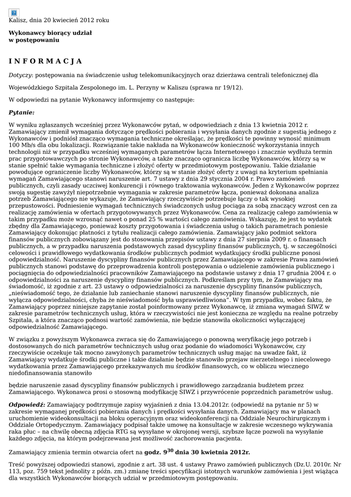 Kalisz,dnia20kwiecień2012roku Wykonawcybiorącyudział wpostępowaniu INFORMACJA Dotyczy:postępowanianaświadczenieusługtelekomunikacyjnychorazdzierżawacentralitelefonicznejdla WojewódzkiegoSzpitalaZespolonegoim.L.PerzynywKaliszu(sprawanr19/12). WodpowiedzinapytanieWykonawcyinformujemyconastępuje: Pytanie: WwynikuzgłaszanychwcześniejprzezWykonawcówpytań,wodpowiedziachzdnia13kwietnia2012r. Zamawiającyzmieniłwymaganiadotycząceprędkościpobieraniaiwysyłaniadanychzgodniezsugestiąjednegoz Wykonawcówipodniósłznaczącowymaganiatechniczneokreślając,żeprędkościtepowinnywynosićminimum 100Mb/sdlaobulokalizacji.RozwiązanietakienakładanaWykonawcówkoniecznośćwykorzystaniainnych technologiiniżwprzypadkuwcześniejwymaganychparametrówłączaInternetowegoiznaczniewydłużatermin pracprzygotowawczychpostronieWykonawców,atakżeznaczącoograniczaliczbęWykonawców,którzysąw staniespełnićtakiewymaganiatechniczneizłożyćofertywprzedmiotowympostępowaniu.Takiedziałanie powodująceograniczenieliczbyWykonawców,którzysąwstaniezłożyćofertyzuwaginakryteriumspełniania wymagańZamawiającegostanowinaruszenieart.7ustawyzdnia29stycznia2004r.Prawozamówień publicznych,czylizasadyuczciwejkonkurencjiirównegotraktowaniawykonawców.JedenzWykonawcówpoprzez swojąsugestięzawyżyłniepotrzebniewymaganiawzakresieparametrówłącza,ponieważdokonanaanaliza potrzebZamawiającegoniewykazuje,żeZamawiającyrzeczywiściepotrzebujełączyotakwysokiej przepustowości.Podniesieniewymagańtechnicznychświadczonychusługpociągazasobąznaczącywzrostcenza realizacjęzamówieniawofertachprzygotowywanychprzezWykonawców.Cenazarealizacjęcałegozamówieniaw takimprzypadkumożewzrosnąćnawetoponad25%wartościcałegozamówienia.Wskazuję,żejesttowydatek zbędnydlaZamawiającego,ponieważkosztyprzygotowaniaiświadczeniausługotakichparametrachponiesie Zamawiającydokonującpłatnościztytułurealizacjicałegozamówienia.Zamawiającyjakopodmiotsektora finansówpublicznychzobowiązanyjestdostosowaniaprzepisówustawyzdnia27sierpnia2009r.ofinansach publicznych,awprzypadkunaruszeniapodstawowychzasaddyscyplinyfinansówpublicznych,tj.wszczególności celowościiprawidłowegowydatkowaniaśrodkówpublicznychpodmiotwydatkującyśrodkipubliczneponosi odpowiedzialność.NaruszeniedyscyplinyfinansówpublicznychprzezZamawiającegowzakresiePrawazamówień publicznychstanowipodstawędoprzeprowadzeniakontrolipostępowaniaoudzieleniezamówieniapublicznegoi pociągnięciadoodpowiedzialnościpracownikówZamawiającegonapodstawieustawyzdnia17grudnia2004r.o odpowiedzialnościzanaruszeniedyscyplinyfinansówpublicznych.Podkreślamprzytym,żeZamawiającyma świadomość,iżzgodniezart.23ustawyoodpowiedzialnościzanaruszeniedyscyplinyfinansówpublicznych, „nieświadomośćtego,żedziałanielubzaniechaniestanowinaruszeniedyscyplinyfinansówpublicznych,nie wyłączaodpowiedzialności,chybażenieświadomośćbyłausprawiedliwiona”.Wtymprzypadku,wobecfaktu,że ZamawiającypoprzezniniejszezapytaniezostałpoinformowanyprzezWykonawcę,iżzmianawymagańSIWZw zakresieparametrówtechnicznychusług,którawrzeczywistościniejestkoniecznazewzględunarealnepotrzeby Szpitala,aktóraznaczącopodnosiwartośćzamówienia,niebędziestanowiłaokolicznościwyłączającej odpowiedzialnośćZamawiającego. WzwiązkuzpowyższymWykonawcazwracasiędoZamawiającegooponownąweryfikacjęjegopotrzebi dostosowanychdonichparametrówtechnicznychusługorazpodaniedowiadomościWykonawców,czy rzeczywiścieoczekujetakmocnozawyżonychparametrówtechnicznychusługmającnauwadzefakt,iż Zamawiającywydatkujeśrodkipubliczneitakiedziałaniebędziestanowiłoprzejawnierzetelnegoiniecelowego wydatkowaniaprzezZamawiającegoprzekazywanychmuśrodkówfinansowych,cowobliczuwiecznego niedofinansowaniastanowiło będzienaruszeniezasaddyscyplinyfinansówpublicznychiprawidłowegozarządzaniabudżetemprzez Zamawiającego.WykonawcaprosiostosownąmodyfikacjęSIWZiprzywróceniepoprzednichparametrówusług. Odpowiedź:Zamawiającypodtrzymujezapisywyjaśnieńzdnia13.04.2012r.(odpowiedźnapytanienr5)w zakresiewymaganejprędkościpobieraniadanychiprędkościwysyłaniadanych.Zamawiającymawplanach uruchomieniewideokonsultacjinablokuoperacyjnymorazwideokonferencjinaOddzialeNeurochirurgicznymi OddzialeOrtopedycznym.Zamawiającypodpisałtakżeumowęnakonsultacjewzakresiewczesnegowykrywania rakapłuc–nachwilęobecnązdjęciaRTGsąwysyłanewokrojonejwersji,szybszełączepozwolinawysyłanie każdegozdjęcia,naktórympodejrzewanajestmożliwośćzachorowaniapacjenta. Zamawiającyzmieniaterminotwarciaofertnagodz.930dnia30kwietnia2012r. Treśćpowyższejodpowiedzistanowi,zgodniezart.38ust.4ustawyPrawozamówieńpublicznych(Dz.U.2010r.Nr 113,poz.759tekstjednolityzpóźn.zm.)zmianętreścispecyfikacjiistotnychwarunkówzamówieniaijestwiążąca dlawszystkichWykonawcówbiorącychudziałwprzedmiotowympostępowaniu.