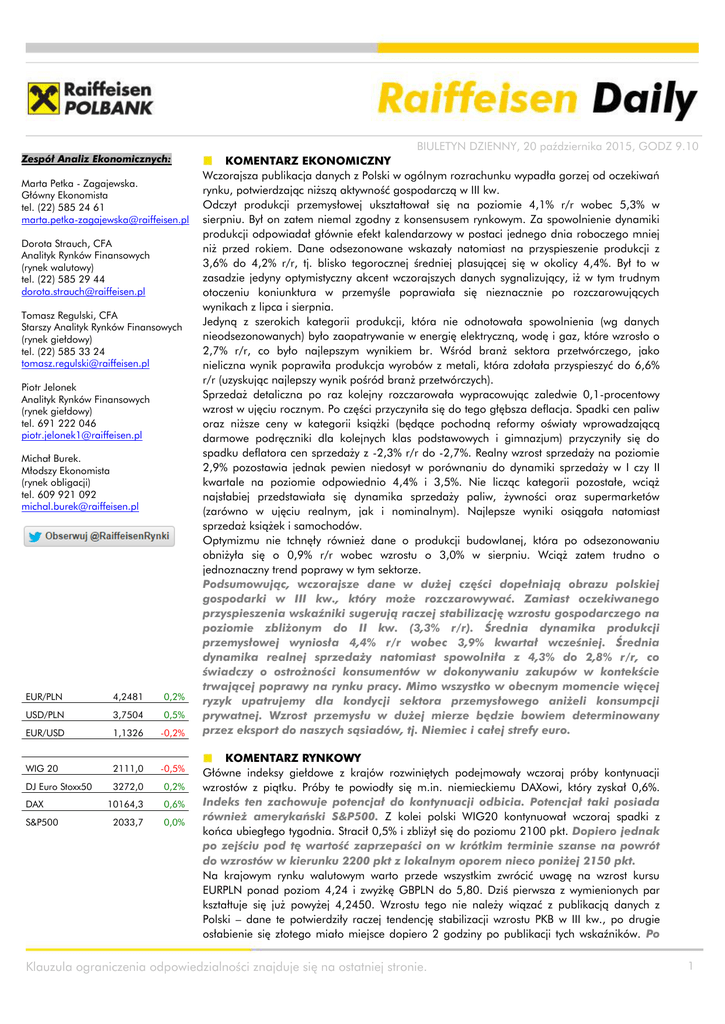 Zespół Analiz Ekonomicznych: Marta Petka - Zagajewska. Główny Ekonomista tel. (22) 585 24 61 [email protected] Dorota Strauch, CFA Analityk Rynków Finansowych (rynek walutowy) tel. (22) 585 29 44 [email protected] Tomasz Regulski, CFA Starszy Analityk Rynków Finansowych (rynek giełdowy) tel. (22) 585 33 24 [email protected] Piotr Jelonek Analityk Rynków Finansowych (rynek giełdowy) tel. 691 222 046 [email protected] Michał Burek. Młodszy Ekonomista (rynek obligacji) tel. 609 921 092 [email protected] EUR/PLN 4,2481 0,2% USD/PLN 3,7504 0,5% EUR/USD 1,1326 -0,2% WIG 20 2111,0 -0,5% DJ Euro Stoxx50 3272,0 0,2% 10164,3 0,6% 2033,7 0,0% DAX S&P500 BIULETYN DZIENNY, 20 października 2015, GODZ 9.10 KOMENTARZ EKONOMICZNY Wczorajsza publikacja danych z Polski w ogólnym rozrachunku wypadła gorzej od oczekiwań rynku, potwierdzając niższą aktywność gospodarczą w III kw. Odczyt produkcji przemysłowej ukształtował się na poziomie 4,1% r/r wobec 5,3% w sierpniu. Był on zatem niemal zgodny z konsensusem rynkowym. Za spowolnienie dynamiki produkcji odpowiadał głównie efekt kalendarzowy w postaci jednego dnia roboczego mniej niż przed rokiem. Dane odsezonowane wskazały natomiast na przyspieszenie produkcji z 3,6% do 4,2% r/r, tj. blisko tegorocznej średniej plasującej się w okolicy 4,4%. Był to w zasadzie jedyny optymistyczny akcent wczorajszych danych sygnalizujący, iż w tym trudnym otoczeniu koniunktura w przemyśle poprawiała się nieznacznie po rozczarowujących wynikach z lipca i sierpnia. Jedyną z szerokich kategorii produkcji, która nie odnotowała spowolnienia (wg danych nieodsezonowanych) było zaopatrywanie w energię elektryczną, wodę i gaz, które wzrosło o 2,7% r/r, co było najlepszym wynikiem br. Wśród branż sektora przetwórczego, jako nieliczna wynik poprawiła produkcja wyrobów z metali, która zdołała przyspieszyć do 6,6% r/r (uzyskując najlepszy wynik pośród branż przetwórczych). Sprzedaż detaliczna po raz kolejny rozczarowała wypracowując zaledwie 0,1-procentowy wzrost w ujęciu rocznym. Po części przyczyniła się do tego głębsza deflacja. Spadki cen paliw oraz niższe ceny w kategorii książki (będące pochodną reformy oświaty wprowadzającą darmowe podręczniki dla kolejnych klas podstawowych i gimnazjum) przyczyniły się do spadku deflatora cen sprzedaży z -2,3% r/r do -2,7%. Realny wzrost sprzedaży na poziomie 2,9% pozostawia jednak pewien niedosyt w porównaniu do dynamiki sprzedaży w I czy II kwartale na poziomie odpowiednio 4,4% i 3,5%. Nie licząc kategorii pozostałe, wciąż najsłabiej przedstawiała się dynamika sprzedaży paliw, żywności oraz supermarketów (zarówno w ujęciu realnym, jak i nominalnym). Najlepsze wyniki osiągała natomiast sprzedaż książek i samochodów. Optymizmu nie tchnęły również dane o produkcji budowlanej, która po odsezonowaniu obniżyła się o 0,9% r/r wobec wzrostu o 3,0% w sierpniu. Wciąż zatem trudno o jednoznaczny trend poprawy w tym sektorze. Podsumowując, wczorajsze dane w dużej części dopełniają obrazu polskiej gospodarki w III kw., który może rozczarowywać. Zamiast oczekiwanego przyspieszenia wskaźniki sugerują raczej stabilizację wzrostu gospodarczego na poziomie zbliżonym do II kw. (3,3% r/r). Średnia dynamika produkcji przemysłowej wyniosła 4,4% r/r wobec 3,9% kwartał wcześniej. Średnia dynamika realnej sprzedaży natomiast spowolniła z 4,3% do 2,8% r/r, co świadczy o ostrożności konsumentów w dokonywaniu zakupów w kontekście trwającej poprawy na rynku pracy. Mimo wszystko w obecnym momencie więcej ryzyk upatrujemy dla kondycji sektora przemysłowego aniżeli konsumpcji prywatnej. Wzrost przemysłu w dużej mierze będzie bowiem determinowany przez eksport do naszych sąsiadów, tj. Niemiec i całej strefy euro. KOMENTARZ RYNKOWY Główne indeksy giełdowe z krajów rozwiniętych podejmowały wczoraj próby kontynuacji wzrostów z piątku. Próby te powiodły się m.in. niemieckiemu DAXowi, który zyskał 0,6%. Indeks ten zachowuje potencjał do kontynuacji odbicia. Potencjał taki posiada również amerykański S&P500. Z kolei polski WIG20 kontynuował wczoraj spadki z końca ubiegłego tygodnia. Stracił 0,5% i zbliżył się do poziomu 2100 pkt. Dopiero jednak po zejściu pod tę wartość zaprzepaści on w krótkim terminie szanse na powrót do wzrostów w kierunku 2200 pkt z lokalnym oporem nieco poniżej 2150 pkt. Na krajowym rynku walutowym warto przede wszystkim zwrócić uwagę na wzrost kursu EURPLN ponad poziom 4,24 i zwyżkę GBPLN do 5,80. Dziś pierwsza z wymienionych par kształtuje się już powyżej 4,2450. Wzrostu tego nie należy wiązać z publikacją danych z Polski – dane te potwierdziły raczej tendencję stabilizacji wzrostu PKB w III kw., po drugie osłabienie się złotego miało miejsce dopiero 2 godziny po publikacji tych wskaźników. Po Klauzula ograniczenia odpowiedzialności znajduje się na ostatniej stronie. 1 BIULETYN DZIENNY, 20 października 2015, GODZ 9.10 zwyżce kurs EURPLN zyskał potencjał do ruchu w kierunku 4,26, gdzie powinien się zatrzymać, bowiem wciąż nie ma silnych argumentów za znaczną deprecjacją polskiej waluty. Co prawda inwestorzy mogą się w tym tygodniu pozycjonować przed niedzielnymi wyborami parlamentarnymi w naszym kraju, ale sondaże przedwyborcze są na tyle jednoznaczne, że raczej wynik tych wyborów został już w dużej mierze uwzględnionych w notowaniach złotego i spekulacje na jego temat nie powinny prowadzić do silnych wahań pary EURPLN. Jeżeli chodzi o kurs GBPLN to dzisiaj wzrosty będzie ograniczać 100-sesyjna średnia ruchoma na poziomie 5,8050, która wczoraj zatrzymała zwyżkę. Eurodolar odnotował wczoraj trzecią spadkową sesję. Zbliżył się on do 1,13, gdzie chwilowo jego spadek powinien wyhamować. Większa zmienność w notowaniach tej pary walutowej powinna pojawić się w czwartek przy okazji konferencji prasowej po pos