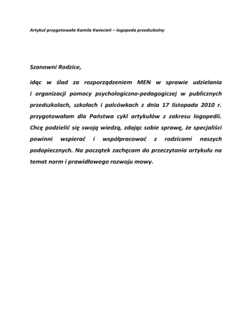 Artykuł przygotowała Kamila Kwiecień – logopeda przedszkolny Szanowni Rodzice, idąc w ślad za rozporządzeniem MEN w sprawie udzielania i organizacji pomocy psychologiczno-pedagogiczej w publicznych przedszkolach, szkołach i palcówkach z dnia 17 listopada 2010 r. przygotowałam dla Państwa cykl artykułów z zakresu logopedii. Chcę podzielić się swoją wiedzą, zdając sobie sprawę, że specjaliści powinni wspierać i współpracować z rodzicami naszych podopiecznych. Na początek zachęcam do przeczytania artykułu na temat norm i prawidłowego rozwoju mowy. ROZWÓJ MOWY W OKRESIE PRENATALNYM Nie wszyscy wiedzą, że nauka mówienia nie rozpoczyna się w momencie, gdy dziecko wypowie pierwsze słowa, lecz w chwili jego urodzenia, a nawet wcześniej, w życiu płodowym. Niemowlęta z wrodzonym zainteresowaniem przysłuchują się rozbrzmiewającym wokół nich dźwiękom i potrafią zrozumieć, co mówimy na długo przedtem, zanim same zaczną wypowiadać słowa. Jest to najważniejsza sprawa, którą musimy sobie uświadomić, jeśli chcemy pomóc dziecku w nauce mówienia zrozumienie zawsze o krok wyprzedza mówienie. Dlatego należy rozmawiać ze swoim jeszcze nienarodzonym dzieckiem, ponieważ w życiu płodowym, przyswaja sobie ono elementy suprasegmentalne naszego języka (tzn. akcent, rytm, melodię oraz ton). Badania wykazały, że w 7 tygodniu życia mózg dziecka wysyła pierwsze impulsy, które koordynują funkcje niektórych organów. Wówczas tworzą się w mózgu pierwsze synapsy. W 23 dniu od poczęcia można zauważyć pierwsze nerwowe odruchy, zaś w 150 dniu tworzy się osłonka mielinowa w mózgu dziecka. W 6 miesiącu życia płodowego mózg jest już całkowicie ukształtowany i jego struktura się nie zmienia. W 6 - 7 tygodniu zaczynają ze sobą współpracować mięśnie i nerwy. Swoją koordynację zaczynają od górnej wargi, wg D. Hookera, właśnie ona jest najbardziej czuła i podrażnienie jej powoduje zwrot szyi i tułowia. 12 tydzień to początek podciągania wargi i jest to wstępne stadium do rozwoju odruchu ssania. W 14 tygodniu swą pracę rozpoczynają mięśnie fonacyjne i oddechowe. W 17 tygodniu dziecko wyraźnie uwypukla i wysuwa wargi, w ten właśnie sposób ćwiczy odruch ssania. W miesiącu 3 ukształtowane są już struny głosowe i w tym momencie dziecko zdolne jest do płaczu. Od tego czasu dziecko połyka również wody płodowe, staje się wrażliwe na smak i odczuwa uczucie głodu. 13 tydzień przynosi ze sobą spontaniczne ruchy klatki piersiowej, które są próbą oddychania. ROZWÓJ MOWY W OKRESIE POSTNATALNYM Małe dziecko słucha otoczenia i w ten sposób uczy się mówić. Człowiek rodzi się z predyspozycja do mówienia, ale nie posiada umiejętności wypowiadania się. Według L. Kaczmarka rozwój mowy w okresie postnatalny można podzielić na cztery etapy: okres melodii (od urodzenia do 1 roku życia), okres wyrazu (od 1 do 2 roku życia), okres zdania (od 2 do 3 roku życia), okres swoistej mowy dziecięcej (od 3 do 7 roku życia). Okres melodii na początku charakteryzuje się krzykiem. Za jego pomocą dziecko sygnalizuje matce swoją potrzebę (głód, dyskomfort z powodu zimna, czy mokrej pieluszki). Dziecko kojarzy, że za każdym razem, gdy zaczyna krzyczeć pojawia się matka. To właśnie jest pierwsze porozumienie, a zarazem ćwiczenie narządu oddechowego. W 2 - 3 miesiącu życia pojawia się odruch bezwarunkowy tzw. głużenie (gruchanie), które jest jednakowe na wszystkich kontynentach oraz występuje u dzieci głuchych. Głużenie charakteryzuje się wydawaniem przez niemowlę różnych dźwięków, a w tym samogłosek, spółgłosek, grup spółgłoskowych i samogłoskowych oraz towarzyszącymi im nieskoordynowanymi ruchami ciała i kończyn. Gruchanie występuje wówczas, gdy dziecko jest zadowolone i odprężone. Powstają wówczas dźwięki typu: g, k, gli, kli, tli. Okres ten jest przygotowaniem narządów artykulacyjnych do wydawania podstawowych dźwięków. W mózgu powstają wówczas pierwsze skojarzenia między dźwiękami a ruchami aparatu artykulacyjnego. Około 6 miesiąca dziecko przechodzi w kolejną fazę rozwojową, a mianowicie w okres gaworzenia. Gaworzenie jest odruchem warunkowym i charakteryzuje się zamierzonym wydawaniem i powtarzaniem dźwięków. Na początku tego okresu pojawiają się pierwsze sylaby (ma, ta, ba, później: ma - ma, ta - ta, ba - ba), które dziecko powtarza wielokrotnie, ale nie przypisuje im konkretnego znaczenia. Z końcem pierwszego roku życia wypowiada już 2 - 3 wyrazy (mama, baba, tata). Okres wyrazu - dziecko potrafi wypowiedzieć wszystkie samogłoski z wyjątkiem nosowych „ą”, „ę” oraz spółgłoski: wargowe p, b, m; przedniojęzykowo zębowe: t, d, n; tylnojęzykowe k, g i środkowojęzykowe ś, a czasami też ć. Pozostałe spółgłoski zastępuje innymi, podobnymi. W tym okresie cechą charakterystyczną jest to, iż dziecko wypowiada tylko pierwszą lub ostatnią sylabę wyrazu. Wyraz pełni w tym momencie funkcję zdania. Okres zdania - dziecko używa następujących głosek: wargowe p, pi, b, bi ,m mi; wargowo - zębowe: f, f, w, wi; środkowojęzykowe: ś, ź, ć, dź, ń, ki, gi; tylnojęzykowe: k, g, ch; przedniojęzykowo - zębowe: t, d, n; przedniojęzykowo – dziąsłowe: l. Z końcem tego okresu mogą pojawić się również głoski: s, z, c, a także: sz, ż, cz, dż. Okres ten charakteryzuje się tym, iż dziecko nie potrafi wyartykułować niektórych głosek, ale wie jak dana głoska powinna brzmieć i jest w stanie wyróżnić ją w wyrazie. Dziecko tworzy dwuwyrazowe zlepki zdań np. „baba koko” – które w konkretnej sytuacji są komunikatywne dla odbiorcy. Wraz z biegiem rozwoju, zlepki wyrazowe przekształcane są w równoważniki zdań. Znaczenie ich jest już bardziej przejrzyste, ale nadal są ściśle powiązane z kontekstem sytuacyjnym. Okres swoistej mowy dziecięcej - mowa dziecka nie jest jesz