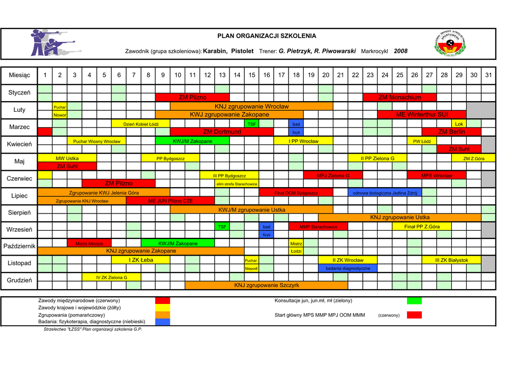 Miesiąc 1 2 3 4 5 6 7 8 9 10 Styczeń Luty Maj Nowor 15 16 17 18 20 21 22 23 24 25 26 27 28 29 30 ME Winterthur SUI Lok bad ZM Dortmund ZM Berlin fizyk KWJ/M Zakopane Puchar Wiosny Wrocław SP ŁÓD ZK I 19 ZM Monachium TSF I PP Wrocław PW Łódź ZM Suhl MW Ustka II PP Zielona G PP Bydgoszcz ZM Z.Góra ZM Suhl ZM Pilzno MPS Wrocław MPJ Zielona G III PP Bydgoszcz elim strefa Starachowice Zgrupowanie KWJ Jelenia Góra Finał OOM Bydgoszcz odnowa biologiczna Jedlina Zdrój ME JUN Pilzno CZE Zgrupowanie KNJ Wrocław KWJ/M zgrupowanie Ustka KNJ zgrupowanie Ustka TSF Wrzesień bad Finał PP Z.Góra MMP Starachowice fizyk KWJ/M Zakopane Mistrz Młodzik Mistrz KNJ zgrupowanie Zakopane I ZK Łeba Listopad Grudzień 14 Dzień Kobiet Łódź Sierpień Październik 13 2008 KNJ zgrupowanie Wrocław KWJ zgrupowanie Zakopane Czerwiec Lipiec 12 ZM Pilzno Puchar Marzec Kwiecień 11 Trener: G. Pietrzyk, R. Piwowarski Markrocykl EG OR O Zawodnik (grupa szkoleniowa): Karabin, Pistolet EK STR IĄZ ZE ZW TOW A TW EC L PLAN ORGANIZACJI SZKOLENIA Łodzi Puchar II ZK Wrocław Niepodl badania diagnostyczne III ZK Białystok IV ZK Zielona G KNJ zgrupowanie Szczyrk Zawody międzynarodowe (czerwony) Zawody krajowe i wojewódzkie (żółty) Zgrupowania (pomarańczowy) Badania: fizykoterapia, diagnostyczne (niebieski) Strzelectwo "ŁZSS" Plan organizacji szkolenia G.P. Konsultacje jun, jun.mł, mł (zielony) Start główny MPS MMP MPJ OOM MMM (czerwony) 31