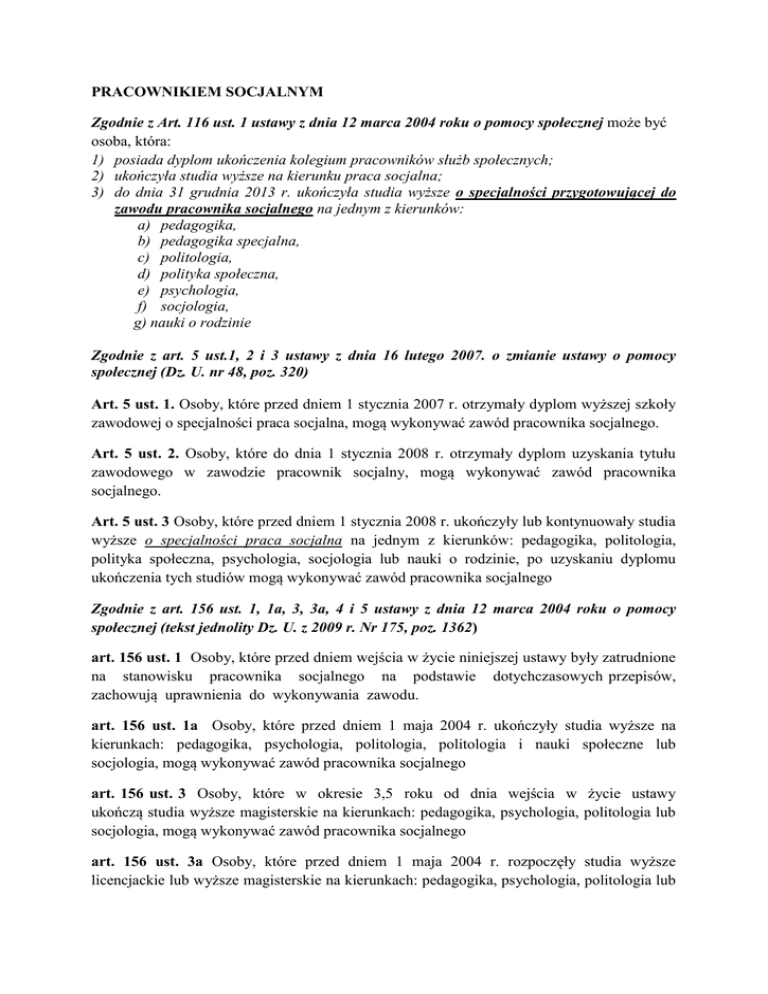 PRACOWNIKIEM SOCJALNYM Zgodnie z Art. 116 ust. 1 ustawy z dnia 12 marca 2004 roku o pomocy społecznej może być osoba, która: 1) posiada dyplom ukończenia kolegium pracowników służb społecznych; 2) ukończyła studia wyższe na kierunku praca socjalna; 3) do dnia 31 grudnia 2013 r. ukończyła studia wyższe o specjalności przygotowującej do zawodu pracownika socjalnego na jednym z kierunków: a) pedagogika, b) pedagogika specjalna, c) politologia, d) polityka społeczna, e) psychologia, f) socjologia, g) nauki o rodzinie Zgodnie z art. 5 ust.1, 2 i 3 ustawy z dnia 16 lutego 2007. o zmianie ustawy o pomocy społecznej (Dz. U. nr 48, poz. 320) Art. 5 ust. 1. Osoby, które przed dniem 1 stycznia 2007 r. otrzymały dyplom wyższej szkoły zawodowej o specjalności praca socjalna, mogą wykonywać zawód pracownika socjalnego. Art. 5 ust. 2. Osoby, które do dnia 1 stycznia 2008 r. otrzymały dyplom uzyskania tytułu zawodowego w zawodzie pracownik socjalny, mogą wykonywać zawód pracownika socjalnego. Art. 5 ust. 3 Osoby, które przed dniem 1 stycznia 2008 r. ukończyły lub kontynuowały studia wyższe o specjalności praca socjalna na jednym z kierunków: pedagogika, politologia, polityka społeczna, psychologia, socjologia lub nauki o rodzinie, po uzyskaniu dyplomu ukończenia tych studiów mogą wykonywać zawód pracownika socjalnego Zgodnie z art. 156 ust. 1, 1a, 3, 3a, 4 i 5 ustawy z dnia 12 marca 2004 roku o pomocy społecznej (tekst jednolity Dz. U. z 2009 r. Nr 175, poz. 1362) art. 156 ust. 1 Osoby, które przed dniem wejścia w życie niniejszej ustawy były zatrudnione na stanowisku pracownika socjalnego na podstawie dotychczasowych przepisów, zachowują uprawnienia do wykonywania zawodu. art. 156 ust. 1a Osoby, które przed dniem 1 maja 2004 r. ukończyły studia wyższe na kierunkach: pedagogika, psychologia, politologia, politologia i nauki społeczne lub socjologia, mogą wykonywać zawód pracownika socjalnego art. 156 ust. 3 Osoby, które w okresie 3,5 roku od dnia wejścia w życie ustawy ukończą studia wyższe magisterskie na kierunkach: pedagogika, psychologia, politologia lub socjologia, mogą wykonywać zawód pracownika socjalnego art. 156 ust. 3a Osoby, które przed dniem 1 maja 2004 r. rozpoczęły studia wyższe licencjackie lub wyższe magisterskie na kierunkach: pedagogika, psychologia, politologia lub socjologia, po uzyskaniu dyplomu ukończenia tych studiów mogą wykonywać zawód pracownika socjalnego. art. 156 ust. 4 Osoby zatrudnione przed dniem wejścia w życie ustawy na stanowisku aspiranta pracy socjalnej, które w okresie 3,5 roku od dnia wejścia w życie ustawy ukończą studia wyższe na kierunkach: pedagogika, psychologia, politologia lub socjologia i uzyskają tytuł licencjata, mogą wykonywać zawód pracownika socjalnego. art. 156 ust. 5 Osoby zatrudnione przed dniem wejścia w życie ustawy na stanowisku aspiranta pracy socjalnej, które w okresie 5,5 roku od dnia wejścia w życie ustawy ukończą studia wyższe magisterskie na kierunkach: pedagogika, psychologia, politologia lub socjologia, mogą wykonywać zawód pracownika socjalnego. Ośrodek Pomocy Społecznej zatrudnia 13 osób na stanowiskach pracownik socjalny. Gmina Sandomierz została podzielona na kilka rejonów, każdy z nich ma opiekuna w postaci pracownika socjalnego. Pracownik socjalny przeprowadza wywiady środowiskowe, rozeznaje środowiska patologiczne, współpracuje z Komendą Powiatową Policji, kuratorami sądowymi, pedagogami szkolnymi, Prokuraturą, przedstawicielami organizacji pozarządowych, kościołem i in. Pracownik socjalny kieruje się zasadą dobra osób i rodzin, którym służy, przeciwdziała praktykom niehumanitarnym i dyskryminującym, wspomaga osoby i rodziny w osiągnięciu pełnej aktywności społecznej, organizuje różnorodne formy pomocy, zapobiega procesowi marginalizacji osób i grup, a także przeciwdziała negatywnym zjawiskom w środowisku lokalnym.