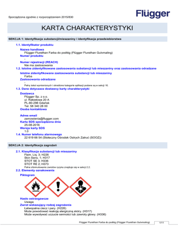 Sporządzona zgodnie z rozporządzeniem 2015/830 KARTA CHARAKTERYSTYKI SEKCJA 1: Identyfikacja substancji/mieszaniny i identyfikacja przedsiebiorstwa 1.1. Identyfikator produktu Nazwa handlowa Flügger Flurethan Farba do podłóg (Flügger Flurethan Gulvmaling) Numer produktu Numer rejestracji (REACH) Nie ma zastosowania 1.2. Istotne zidentyfikowane zastosowania substancji lub mieszaniny oraz zastosowania odradzane Istotne zidentyfikowane zastosowania substancji lub mieszaniny Farba Zastosowania odradzane Pełny tekst wymienionych i określone kategorie aplikacji podane są w sekcji 16. 1.3. Dane dotyczace dostawcy karty charakterystyki Dostawca Flügger Sp. z o.o. ul. Rakietowa 20 A PL-80-298 Gdańsk Tel. 58 340 28 00 Osoba kontaktowa Adres email [email protected] Karta SDS sporządzona dnia 25-08-2016 Wersja karty SDS 1.0 1.4. Numer telefonu alarmowego 22 619 66 54 (Stołeczny Ośrodek Ostrych Zatruć (SOOZ)) SEKCJA 2: Identyfikacja zagrożeń 2.1. Klasyfikacja substancji lub mieszaniny Flam. Liq. 3; H226 Skin Sens. 1; H317 STOT SE 3; H336 STOT RE 2; H373 Pełne sformułowanie zwrotów ryzyka znajduje się w sekcji 2.2. 2.2. Elementy oznakowania Piktogram Hasło ostrzegawcze Uwaga Zwrot wskazujący rodzaj zagrożenia Łatwopalna ciecz i pary. (H226) Może powodować reakcję alergiczną skóry. (H317) Może wywoływać uczucie senności lub zawroty głowy. (H336) Flügger Flurethan Farba do podłóg (Flügger Flurethan Gulvmaling) 1/11 Sporządzona zgodnie z rozporządzeniem 2015/830 Może powodować uszkodzenie ośrodkowego układu nerwowego poprzez długotrwałe lub powtarzane się wdychanie. (H373) Zwroty wskazujące środki ostrożności Ogólne W razie konieczności zasięgnięcia porady lekarza należy pokazać pojemnik lub etykietę. (P101). Chronić przed dziećmi. (P102). Zapobieganie Przechowywać z dala od źródeł ciepła, gorących powierzchni, źródeł iskrzenia, otwartego ognia i innych źródeł zapłonu. Nie palić. (P210). Stosować wyłącznie na zewnątrz lub w dobrze wentylowanym pomieszczeniu (P271). Stosować rękawice ochronne/odzież ochronną. (P280). Reagowanie Przechowywanie Usuwanie Zawartość/pojemnik usuwać do autoryzowanego zakładu utylizacji odpadów. (P501). Zawiera Węglowodory, C9-C11, n-alkany, izoalkany, cykliczne, < 2 % aromatycznych, Węglowodory, C10-C13, nalkany, izoalkany, cykliczne, aromatycznych (2-25 %), Kobaltu bis(2-etyloheksanian), Kwasy tłuszczowe C14-18 i C16-18 nienasycone, poddane działaniu kwasu maleinowego, produkty reakcji z oleiloaminą, Oksym butan-2-onu 2.3. Inne zagrożenia Tkaniny zanieczyszczone preparatem mogą ulec zapaleniu. Po użyciu powinny być nasączone wodą lub zniszczone. Produkt zawiera substancje, które mogą mieć szkodliwe działanie na funkcje rozrodcze. Wyrób zawiera substancje, których rakotwórczość jest podejrzewana lub została dowiedziona. Produkt zawiera organiczny rozpuszczalnik. Wielokrotne wystawienie na działanie organicznych rozcieńczalników może spowodowań uszkodzenia systemu nerwowego i narządów wewnętrznych, np. wątroby i nerek. Informacje uzupełniające na etykiecie Powtarzające się narażenie może powodować wysuszanie lub pękanie skóry. (EUH066) Inne Wyczuwalne oznakowanie. VOC VOC-MAX: 400 g/l, VOC-limit (A/i (SB)): 500 g/l. SEKCJA 3: Skład/ informacja o składnikach 3.1/3.2. Substancje/ Mieszaniny NAZWA: NUMERY IDENTYFIKACYJNE: ZAWARTOŚĆ: CLP KLASYFIKACJA: UWAGA: NAZWA: NUMERY IDENTYFIKACYJNE: ZAWARTOŚĆ: CLP KLASYFIKACJA: UWAGA: NAZWA: NUMERY IDENTYFIKACYJNE: ZAWARTOŚĆ: CLP KLASYFIKACJA: UWAGA: NAZWA: NUMERY IDENTYFIKACYJNE: ZAWARTOŚĆ: CLP KLASYFIKACJA: Węglowodory, C9-C11, n-alkany, izoalkany, cykliczne, < 2 % aromatycznych WEr-nr: 919-857-5 REACH-nr: 01-2119463258-33 15-25% Flam. Liq. 3, Asp. Tox. 1, STOT SE 3 H226, H304, H336, EUH066 S Węglowodory, C10-C13, n-alkany, izoalkany, cykliczne, < 2 % aromatycznych WEr-nr: 918-481-9 REACH-nr: 01-2119457273-39 5-15% Asp. Tox. 1 H304, EUH066 S Węglowodory, C10-C13, n-alkany, izoalkany, cykliczne, aromatycznych (2-25 %) WEr-nr: 919-164-8 REACH-nr: 01-2119473977-17 1-5% STOT RE 1, Asp. Tox. 1, Aquatic Chronic 3 H304, H372, H412, EUH066 S Kwasy tłuszczowe C14-18 i C16-18 nienasycone, poddane działaniu kwasu maleinowego, odukty reakcji z oleiloaminą CAS-nr: 85711-47-3 WEr-nr: 288-307-8 <1% Skin Sens. 1, Aquatic Chronic 3 Flügger Flurethan Farba do podłóg (Flügger Flurethan Gulvmaling) 2/11 Sporządzona zgodnie z rozporządzeniem 2015/830 H317, H412 NAZWA: NUMERY IDENTYFIKACYJNE: ZAWARTOŚĆ: CLP KLASYFIKACJA: UWAGA: Oksym butan-2-onu CAS-nr: 96-29-7 WEr-nr: 202-496-6 REACH-nr: 01-2119539477-28 Nr indeksowy: 616-014-00-0 <1% Acute Tox. 4, Skin Sens. 1, Eye Dam. 1, Carc. 2 H312, H317, H318, H351 S NAZWA: NUMERY IDENTYFIKACYJNE: ZAWARTOŚĆ: CLP KLASYFIKACJA: Kobaltu bis(2-etyloheksanian) CAS-nr: 136-52-7 WEr-nr: 205-250-6 REACH-nr: 01-2119524678-29 <1% Skin Sens. 1A, Eye Irrit. 2, Repr. 2, Aquatic Acute 1, Aquatic Chronic 3 H317, H319, H361f, H400, H412 (M-acute = 1) NAZWA: NUMERY IDENTYFIKACYJNE: ZAWARTOŚĆ: CLP KLASYFIKACJA: 2-Ethylhexanoic acid, zirconium salt CAS-nr: 22464-99-9 WEr-nr: 245-018-1 REACH-nr: 01-2119979088-21 <1% Repr. 2 H361d (*) Pełne sformułowanie zwrotów ryzyka znajduje się w sekcji 16. Wartości graniczne dotyczące higieny pracy wymienione są w sekcji 8, jeśli są dostępne. S = organiczny rozpuszczalnik. Inne informacje ATEmix(inhale, vapour) > 20 ATEmix(dermal) > 2000 ATEmix(oral) > 2000 N chronic (CAT 4) Sum = Sum(Ci/M(chronic)i*25*0.1*10^CAT4) = 0,140032 - 0,210048 N acute (CAT 1) Sum = Sum(Ci/M(acute)i*25) = 0,0063504 - 0,0095256 SEKCJA 4: Środki pierwszej pomocy 4.1. Opis środków pierwszej pomocy Ogólnie W razie wypadku: skontaktować się z lekarzem lub pogotowiem – zabrać ze sobą etykietę lub niniejszą kartę bezpieczeństwa. Lekarz może się zwrócić do Kliniki Medycyny Pracy i Środowiska w szpitalu. Jeśli objawy nie ustają, lub jeśli są wątpliwośc