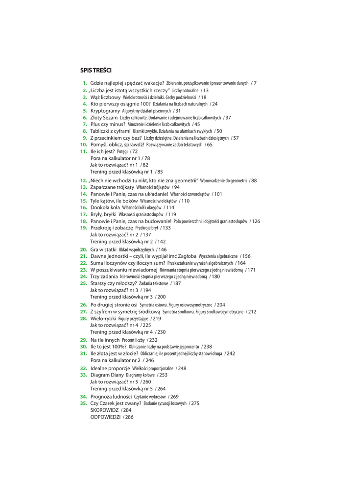 SPIS TREŚCI 1. 2. 3. 4. 5. 6. 7. 8. 9. 10. 11. Gdzie najlepiej spędzać wakacje? Zbieranie, porządkowanie i prezentowanie danych / 7 „Liczba jest istotą wszystkich rzeczy” Liczby naturalne / 13 Wąż liczbowy Wielokrotności i dzielniki. Cechy podzielności / 18 Kto pierwszy osiągnie 100? Działania na liczbach naturalnych / 24 Kryptogramy Algorytmy działań pisemnych / 31 Złoty Sezam Liczby całkowite. Dodawanie i odejmowanie liczb całkowitych / 37 Plus czy minus? Mnożenie i dzielenie liczb całkowitych / 45 Tabliczki z cyframi Ułamki zwykłe. Działania na ułamkach zwykłych / 50 Z przecinkiem czy bez? Liczby dziesiętne. Działania na liczbach dziesiętnych / 57 Pomyśl, oblicz, sprawdź! Rozwiązywanie zadań tekstowych / 65 Ile ich jest? Potęgi / 72 Pora na kalkulator nr 1 / 78 Jak to rozwiązać? nr 1 / 82 Trening przed klasówką nr 1 / 85 12. 13. 14. 15. 16. 17. 18. 19. „Niech nie wchodzi tu nikt, kto nie zna geometrii” Wprowadzenie do geometrii / 88 Zapałczane trójkąty Własności trójkątów / 94 Panowie i Panie, czas na układanie! Własności czworokątów / 101 Tyle kątów, ile boków Własności wielokątów / 110 Dookoła koła Własności kół i okręgów / 114 Bryły, bryłki Własności graniastosłupów / 119 Panowie i Panie, czas na budowanie! Pola powierzchni i objętości graniastosłupów / 126 Przekroję i zobaczę Przekroje brył / 133 Jak to rozwiązać? nr 2 / 137 Trening przed klasówką nr 2 / 142 Gra w statki Układ współrzędnych / 146 Dawne jednostki – czyli, ile wypijał imć Zagłoba Wyrażenia algebraiczne / 156 Suma iloczynów czy iloczyn sum? Przekształcanie wyrażeń algebraicznych / 164 W poszukiwaniu niewiadomej Równania stopnia pierwszego z jedną niewiadomą / 171 Trzy zadania Nierówności stopnia pierwszego z jedną niewiadomą / 180 Starszy czy młodszy? Zadania tekstowe / 187 Jak to rozwiązać? nr 3 / 194 Trening przed klasówką nr 3 / 200 Po drugiej stronie osi Symetria osiowa. Figury osiowosymetryczne / 204 Z szyfrem w symetrię środkową Symetria środkowa. Figury środkowosymetryczne / 212 Wielo-rybki Figury przystające / 219 Jak to rozwiązać? nr 4 / 225 Trening przed klasówką nr 4 / 230 Na tle innych Procent liczby / 232 Ile to jest 100%? Obliczanie liczby na podstawie jej procentu / 238 Ile złota jest w złocie? Obliczanie, ile procent jednej liczby stanowi druga / 242 Pora na kalkulator nr 2 / 246 Idealne proporcje Wielkości proporcjonalne / 248 Diagram Diany Diagramy kołowe / 253 Jak to rozwiązać? nr 5 / 260 Trening przed klasówką nr 5 / 264 Prognoza ludności Czytanie wykresów / 269 Czy Czarek jest cwany? Badanie sytuacji losowych / 275 SKOROWIDZ / 284 ODPOWIEDZI / 286 20. 21. 22. 23. 24. 25. 26. 27. 28. 29. 30. 31. 32. 33. 34. 35.