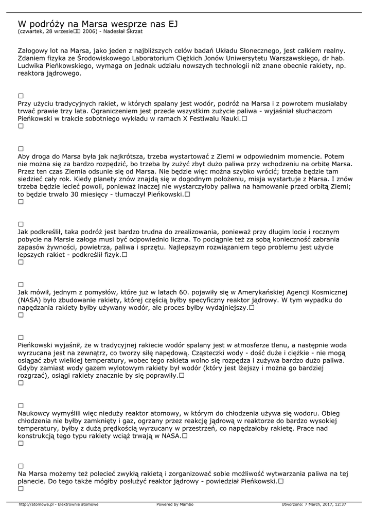 W podróży na Marsa wesprze nas EJ (czwartek, 28 wrzesieÅ„ 2006) - Nadesłał Skrzat Załogowy lot na Marsa, jako jeden z najbliższych celów badań Układu Słonecznego, jest całkiem realny. Zdaniem fizyka ze Środowiskowego Laboratorium Ciężkich Jonów Uniwersytetu Warszawskiego, dr hab. Ludwika Pieńkowskiego, wymaga on jednak udziału nowszych technologii niż znane obecnie rakiety, np. reaktora jądrowego. Przy użyciu tradycyjnych rakiet, w których spalany jest wodór, podróż na Marsa i z powrotem musiałaby trwać prawie trzy lata. Ograniczeniem jest przede wszystkim zużycie paliwa - wyjaśniał słuchaczom Pieńkowski w trakcie sobotniego wykładu w ramach X Festiwalu Nauki. Aby droga do Marsa była jak najkrótsza, trzeba wystartować z Ziemi w odpowiednim momencie. Potem nie można się za bardzo rozpędzić, bo trzeba by zużyć zbyt dużo paliwa przy wchodzeniu na orbitę Marsa. Przez ten czas Ziemia odsunie się od Marsa. Nie będzie więc można szybko wrócić; trzeba będzie tam siedzieć cały rok. Kiedy planety znów znajdą się w dogodnym położeniu, misja wystartuje z Marsa. I znów trzeba będzie lecieć powoli, ponieważ inaczej nie wystarczyłoby paliwa na hamowanie przed orbitą Ziemi; to będzie trwało 30 miesięcy - tłumaczył Pieńkowski. Jak podkreślił, taka podróż jest bardzo trudna do zrealizowania, ponieważ przy długim locie i rocznym pobycie na Marsie załoga musi być odpowiednio liczna. To pociągnie też za sobą konieczność zabrania zapasów żywności, powietrza, paliwa i sprzętu. Najlepszym rozwiązaniem tego problemu jest użycie lepszych rakiet - podkreślił fizyk. Jak mówił, jednym z pomysłów, które już w latach 60. pojawiły się w Amerykańskiej Agencji Kosmicznej (NASA) było zbudowanie rakiety, której częścią byłby specyficzny reaktor jądrowy. W tym wypadku do napędzania rakiety byłby używany wodór, ale proces byłby wydajniejszy. Pieńkowski wyjaśnił, że w tradycyjnej rakiecie wodór spalany jest w atmosferze tlenu, a następnie woda wyrzucana jest na zewnątrz, co tworzy siłę napędową. Cząsteczki wody - dość duże i ciężkie - nie mogą osiągać zbyt wielkiej temperatury, wobec tego rakieta wolno się rozpędza i zużywa bardzo dużo paliwa. Gdyby zamiast wody gazem wylotowym rakiety był wodór (który jest lżejszy i można go bardziej rozgrzać), osiągi rakiety znacznie by się poprawiły. Naukowcy wymyślili więc nieduży reaktor atomowy, w którym do chłodzenia używa się wodoru. Obieg chłodzenia nie byłby zamknięty i gaz, ogrzany przez reakcję jądrową w reaktorze do bardzo wysokiej temperatury, byłby z dużą prędkością wyrzucany w przestrzeń, co napędzałoby rakietę. Prace nad konstrukcją tego typu rakiety wciąż trwają w NASA. Na Marsa możemy też polecieć zwykłą rakietą i zorganizować sobie możliwość wytwarzania paliwa na tej planecie. Do tego także mógłby posłużyć reaktor jądrowy - powiedział Pieńkowski. http://atomowe.pl - Elektrownie atomowe Powered by Mambo Utworzono: 7 March, 2017, 12:37 Według niego, nowoczesny mały reaktor mógłby zostać przetransportowany na Marsa bezzałogowym statkiem. Tam, po przybyciu ludzi, mógłby zostać uruchomiony. Na powierzchni planety najprawdopodobniej znajduje się zamarznięta woda, więc ludzie dysponujący reaktorem mogliby produkować potrzebne im powietrze i paliwo. Temperatura wytwarzana przez reaktor mogłaby posłużyć do rozkładania wody na tlen do oddychania dla ludzi i na wodór - paliwo rakietowe - zaznaczył fizyk. Jego zdaniem, taką technologię można też wykorzystać bez konieczności podróży na Marsa. Reaktor jądrowy nowej generacji, który osiąga wysokie temperatury, mógłby również na Ziemi nie tylko produkować energię elektryczną, ale także rozkładać wodę na tlen i wodór. Ten ostatni byłby wykorzystywany jako surowiec do produkcji związków węgla i wodoru, np. paliwa samochodowego. Węgiel potrzebny do takiej reakcji mógłby pochodzić np. z dwutlenku węgla wydobywającego się z tradycyjnej elektrowni. Nad podobnymi projektami pracują naukowcy w wielu krajach, np. w USA i Chinach, a także w Unii Europejskiej. W Polsce także istnieje konsorcjum badawcze, którego celem jest budowa takich reaktorów na Śląsku. Tam mogłyby zostać użyte do wytwarzania elektryczności, produkcji paliw, a także jako źródło energii do zasilania zakładów przemysłowych. W ramach X Festiwalu Nauki w Warszawie, do 24 września ponad 100 naukowców prezentuje warszawiakom swoje dokonania i zainteresowania badawcze. Warszawskie spotkania z nauką obejmują ponad 500 imprez. Wykłady, pokazy, warsztaty i prezentacje odbywają się nie tylko w laboratoriach i aulach wyższych uczelni czy instytutów naukowych, ale również w muzeach, parkach, obserwatoriach i pod gołym niebem. nuclear.pl http://atomowe.pl - Elektrownie atomowe Powered by Mambo Utworzono: 7 March, 2017, 12:37