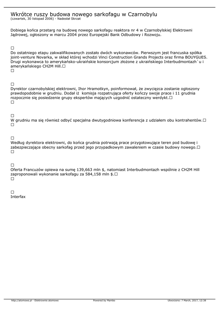 Wkrótce ruszy budowa nowego sarkofagu w Czarnobylu (czwartek, 30 listopad 2006) - Nadesłał Skrzat Dobiega końca przetarg na budowę nowego sarkofagu reaktora nr 4 w Czarnobylskiej Elektrowni Jądrowej, ogłoszony w marcu 2004 przez Europejski Bank Odbudowy i Rozwoju. Do ostatniego etapu zakwalifikowanych zostało dwóch wykonawców. Pierwszym jest francuska spółka joint-venture Novarka, w skład której wchodzi Vinci Construction Grands Projects oraz firma BOUYGUES. Drugi wykonawca to amerykańsko-ukraińskie konsorcjum złożone z ukraińskiego Interbudmontazh`u i amerykańskiego CH2M Hill. Dyrektor czarnobylskiej elektrowni, Ihor Hramotkyn, poinformował, że zwycięzca zostanie ogłoszony prawdopodobnie w grudniu. Dodał iż komisja rozpatrująca oferty kończy swoje prace i 11 grudnia rozpocznie się posiedzenie grupy ekspertów mających uzgodnić ostateczny werdykt. W grudniu ma się również odbyć specjalna dwutygodniowa konferencja z udziałem obu kontrahentów. Według dyrektora elektrowni, do końca grudnia potrwają prace przygotowujące teren pod budowę i zabezpieczające obecny sarkofag przed jego przypadkowym zawaleniem w czasie budowy nowego. Oferta Francuzów opiewa na sumę 139,663 mln $, natomiast Interbudmontazh wspólnie z CH2M Hill zaproponowali wykonanie sarkofagu za 584,158 mln $. Interfax http://atomowe.pl - Elektrownie atomowe Powered by Mambo Utworzono: 7 March, 2017, 12:38