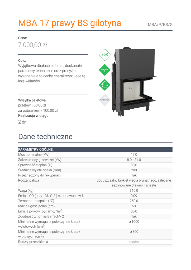MBA 17 prawy BS gilotyna MBA/P/BS/G Cena: 7 000,00 zł Opis: Wyjątkowa dbałość o detale, doskonałe parametry techniczne oraz precyzja wykonania a to cechy charakteryzujące tą linię wkładów. Wysyłka paletowa przelew - 60,00 zł za pobraniem - 100,00 zł Realizacja w ciągu 2 dni Dane techniczne PARAMETRY OGÓLNE: Moc nominalna (kW) Zakres mocy grzewczej (kW) Sprawność cieplna (%) Średnica wylotu spalin (mm) Przeznaczony do rekuperacji Rodzaj paliwa Waga (kg) Emisja CO (przy 13% O 2 ) ≤ podawana w % 17,0 8.0 - 21.0 80,0 200 Tak dopuszczalny brykiet węgla brunatnego, zalecane sezonowane drewno liściaste 310,0 0,09 Temperatura spalin (℃) Max długość polan (cm) 250,0 50 Emisja pyłków (pył) (mg/Nm3) Zgodność z normą BlmSchV 2 35,0 Tak Minimalne wymagane pole czynne kratek wylotowych (cm2) Minimalne wymagane pole czynne kratek wlotowych (cm2) Rodzaj przeszklenia ≥1000 ≥800 boczne Otwieranie drzwi w lewo, do góry Materiał wykonania Szerokość (cm) stal 96,70 Wysokość (cm) Głębokość (cm) 150,00 59,10 Dolot powietrza Wyłożenie komory spalania Popielnik Tak Tak Nie Ozdobna szyba typu glass Tak Zalety MAKSYMALNE WYKORZYSTANIE ENERGII Wykonany z wysoko gatunkowej stali korpus i front odporny na działanie bardzo wysokich temperatur. Efektywne spalanie i dłuższe utrzymywanie temperatury dzięki wyłożeniu komory spalania Acumotte materiałem akumulującym ciepło, który podwyższa temperaturę w komorze. Wysoki czopuch i poprzecznie umieszczone płomieniówki - zwiększają powierzchnię wymiany ciepła pomiędzy wkładem a otoczeniem. Obniżenie temperatury spalin przyczynia się do zwiększenia sprawności urządzenia. Stabilne i wytrzymałe na naprężenia drzwi kominka wykonane z zamkniętego pro lu. Uszczelka drzwi znajduje się w wypro lowanym kanale, co gwarantuje odpowiednie jej przyleganie oraz zapobiega ewentualnemu wypadnięciu podczas eksploatacji. Dopalania cząstek opału dzięki de ektorowi, który wydłuża drogę spalin. Dostarczanie powietrza wyłącznie z zewnątrz dzięki wbudowanemu króćcowi dolotu powietrza 125 mm. Regulacja dolotu powietrza za pomocą jednego regulatora, co wyklucza błędy w niewłaściwym użytkowaniu. Potrójny system dopowietrzenia komory spalania: powietrze pierwotne - skierowane jest na płytę, na której odbywa się spalanie; powietrze wtórne dostarczane jest otworami w tylnej ścianie. Dodatkowo we wkładzie zastosowany jest system czystej szyby (kurtyna powietrza). BEZPIECZEŃSTWO NA NAJWYŻSZYM POZIOMIE Doskonała szczelność dzięki solidnym spawom wykonanym w osłonie gazu szlachetnego. Elementy stalowe wycinane laserowo przy pomocy nowoczesnych urządzeń, a następnie wyginane na giętarkach CNC. Front wkładu wyposażony w ceramikę żaroodporną wytrzymująca temperaturę do 800°C. WYGODNE UŻYTKOWANIE Wkład bezrusztowy - dopalanie na popiele, co oznacza, że opał wypala się na drobny popiół, którego pozostaje minimalna ilość. Uzyskana w ten sposób energia cieplna z drewna zostaje maksymalnie wykorzystana. Płyta dolna wkładu znacznie obniżona w stosunku do drzwi. Ograniczenie osadzanie sadzy dzięki systemowi czystej szyby (kierownica powietrza). NOWOCZESNY DESIGN Wkład kominkowy z dwoma szybami zestawionymi ze sobą pod kątem prostym (szyby łączone bez szprosa). Dekoracyjna szyba typu glass wytrzymująca temperaturę do 800°C, która nadaje kominkowi nowoczesny i elegancki wygląd, optycznie powiększa front wkładu. Gwarancja 5 lat. Rysunek techniczny Opcje dodatkowe Domykanie gilotyna Jest to mechanizm zapewniający samoczynne zamykanie się drzwiczek. 200,00 zł Gwarancja Wszystkie produkty dostępne na www.kratki.com są fabrycznie nowe, wolne od wad zycznych i prawnych oraz zostały legalnie wprowadzone na rynek polski. Producent udziela 5 lat gwarancji od momentu zakupu wkładu na jego sprawne działanie. Wyłożenie ceramiczne objęte jest gwarancją na okres 2 lat od momentu zakupu wkładu. Uszczelnienia kominka objęte jest gwarancją na okres 1 roku od momentu zakupu wkładu. Gwarancją nie jest objęta: ceramika żaroodporna. Zastosowanie wkładu kominkowego, sposób podłączenia do komina oraz warunki eksploatacji muszą być zgodne z instrukcją obsługi. Zwrot Klient będący Konsumentem, który zawarł Umowę sprzedaży, może w terminie 14 dni odstąpić od niej bez podawania przyczyny. Bieg terminu na odstąpienie od Umowy sprzedaży rozpoczyna się od chwili objęcia Towaru w posiadanie przez Klienta lub wskazaną przez niego osobę trzecią inną niż przewoźnik. Oświadczenie można złożyć na formularzu, którego wzór został zamieszczony przez Sprzedawcę na Stronie Internetowej Sklepu pod adresem: formularz odstąpienia. Kratki.pl Marek Bal ul. W. Gombrowicza 4 26-660 Wsola/Jedlińsk www.kratki.com tel. 48 340 10 00 Data publikacji: 08.02.2017