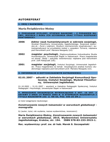 AUTOREFERAT 1. IMIĘ I NAZWISKO. Maria Świątkiewicz-Mośny 2. POSIADANE DYPLOMY, STOPNIE NAUKOWE – Z PODANIEM NAZWY, MIEJSCA I ROKU ICH UZYSKANIA ORAZ T YTUŁU ROZPRAWY DOKTORSKIEJ. 2006 doktor nauk humanistycznych w zakresie socjologii, Wydział Filozoficzny Uniwersytetu Jagiellońskiego. Rozprawa doktorska pt.: Życie z piętnem. Studium mechanizmów stygmatyzacji i autostygmatyzacji na przykładzie kobiet z zespołem Turnera, napisana pod kierunkiem prof. Mariana Niezgody (UJ) 2002 magister psychologii, Międzywydziałowe Indywidualne Studia Humanistyczne, Uniwersytet Śląski w Katowicach. Praca magisterska na temat: Głody i potrzeby wolontariuszy napisana pod kierunkiem prof. Zofii Ratajczak (UŚ). 2001 magister socjologii, Instytut Socjologii, Uniwersytet Jagielloński. Praca magisterska na temat: Socjologiczna analiza humoru studenckiego napisana pod kierunkiem prof. Mariana Niezgody (UJ). 3. INFORMACJE O DOTYCHCZASOWYM ZATRUDNIENIU 02.01.2007 - adiunkt w Zakładzie Socjologii Komunikacji Społecznej, Instytut Socjologii, Wydział Filozoficzny, Uniwersytet Jagielloński. 01.10.2002 – 31.01.2007 - asystent w Katedrze Pedagogiki Społecznej, Instytut Pedagogiki i Psychologii, Uniwersytet Śląski w Katowicach 4. WSKAZANIE OSIĄGNIĘCIA WYNIKAJĄCEGO Z ART. 16 UST. 2 USTAWY Z DNIA 14 MARCA 2003 R. O STOPNIA CH NAUKOWYCH I TYTULE NAUKOWYM (DZ. U. NR 65, POZ. 595 ZE ZM.): a) tytuł osiągnięcia naukowego: Konstruowanie nowych tożsamości w warunkach globalizacji monografia b) (autor, tytuł, rok wydania, nazwa wydawnictwa, recenzenci) Maria Świątkiewicz-Mośny, Konstruowanie nowych tożsamości w warunkach globalizacji, 2015, Wydawnictwo Uniwersytetu Jagiellońskiego, Kraków, str. 194. ISBN 978-83-233-3915-1. Rec. wydawniczy: prof. zw. dr hab. Marek S. Szczepański 2 Maria Świątkiewicz-Mośny, autoreferat c) omówienie celu naukowego i osiągniętych wyników: Celem naukowym projektu badawczego, który dał początek książce „Konstruowanie nowych tożsamości w warunkach globalizacji” była rekonstrukcja wzorów definiowania tożsamości indywidualnej i zbiorowej oraz ich społeczno-kulturowych uwarunkowań. Tożsamość jest pojęciem, które w literaturze przedmiotowej jest rozmaicie pojmowane. Jest też bardzo popularne w nauce i powszechnie używane w codziennym dyskursie. Przemiany współczesnej kultury i procesy globalizacyjne z całym arsenałem konsekwencji doprowadziły do tego, że tożsamość stała się problematyczna a przez to nabrała nowe społeczne znaczenie, stała się ważna i powszechnie dyskutowana. Nie musi być już przypisana, dana raz na zawsze, a coraz częściej jest konstruowana. Zadomowione we współczesnej kulturze reguły alternacji osobowości sprawiają, że społeczny aktor może podejmować decyzje na temat tego kim jest, może dowolnie zmienić przypisane charakterystyki i opisywać siebie na nowo. Ten opis będzie wynikał z cech osobowych i temperamentalnych, ale też z szeroko rozumianego, sprzyjającego tym zamianom otoczenia społeczno-kulturowego. Tożsamość rozumiana jako autodefinicja jest istotnym elementem wpływającym na uczestnictwo społeczne. Dobrym, bo wyrazistym przykładem są biografie osób, które noszą niechciany stygmat. Mechanizmy stygmatyzacji, ale też autostygmatyzacji kształtują tożsamość napiętnowaną (Maria Świątkiewicz-Mośny, 2010). Napiętnowana tożsamość modeluje podejmowane strategie życiowe. Najczęściej ogranicza, jest barierą, którą napiętnowany aktor musi/może pokonać. Rzadziej jest szansą, którą może wykorzystać. Jeżeli tożsamość zdefiniujemy, jako poczucie przynależności do grupy np. narodowej to napotkamy paradoks ważności, o którym pisał też Manuel Castells. Na ile w zglobalizowanym świecie ważne jest poczucie przynależności do grupy narodowej/etnicznej? Czy w czasach, w których istotnymi charakterystykami jest indywidualizm, homogeniczność, racjonalność jest miejsce dla tożsamości narodowych/regionalnych? Najnowsza historia Europy zdaje się podpowiadać, że znaczenie identyfikacji narodowych nie maleje, a w niektórych częściach europejskiej przestrzeni politycznej (Hiszpania, Włochy, Wielka Brytania, Bałkany) nabiera nowego i radykalnego znaczenia. Do pewnego stopnia, z analogicznymi procesami mamy również do czynienia w Polsce, co obrazują dane ostatniego Narodowego Spisu Powszechnego (2011) wskazujące na przyrost ludności deklarującej, identyfikację z nieuwzględnianą w polskim prawie, narodowością śląską. Procesy te pokazują, że tożsamości narodowe, język regionalny są wciąż istotnymi segmentami aksjonormatywnej przestrzeni kulturowej współczesnej 2 3 Maria Świątkiewicz-Mośny, autoreferat Europy i wywierają wpływ na kształtowanie się struktur społecznych i osobowości społecznej jednostek. Inspiracje płynące z tych dwóch perspektyw znalazły swoje odzwierciedlenie w monografii „Konstruowanie nowych tożsamości w warunkach globalizacji”. Przedmiotem socjologicznych analiz podejmowanych w książce jest rekonstrukcja społeczno-kulturowych kontekstów procesów konstruowania tożsamości uwzględniająca zarówno wymiar procesów socjalizacyjnych, zwłaszcza w rodzinie, w szkole i w środowisku zamieszkania oraz poprzez media regionalne. Projekt badań zrealizowany został w formule metodologii badań jakościowych, a ramy teoretyczne ogarniające badane przez mnie zagadnienia wyznaczają założenia socjologii konstruktywistycznej najpełniej wyłożone w pracach Petera L. Bergera i Thomasa Luckmanna. W pierwszym rozdziale książki pokazuję różne sposoby definiowania tożsamości. Tożsamość może być rozumiana jako cecha jednostki (tożsamość indywidualna, np. tożsamość napiętnowana), albo grupy (tożsamość zbiorowa, np. narodowa). Niektórzy zwracają uwagę na indywidualny, osobowy charakter tożsamości, inni z kolei podkreślają rolę grup społecznych (także grup o