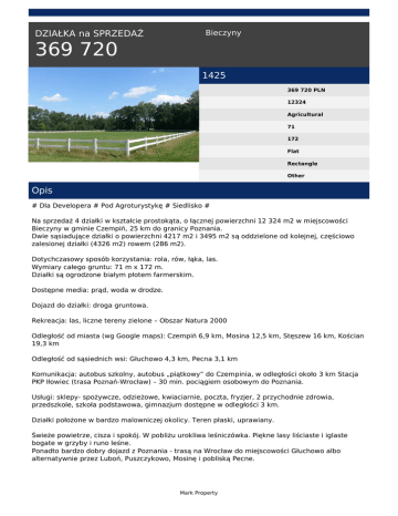 DZIAŁKA na SPRZEDAŻ Bieczyny 369 720 1425 369 720 PLN 12324 Agricultural 71 172 Flat Rectangle Other Opis # Dla Developera # Pod Agroturystykę # Siedlisko # Na sprzedaż 4 działki w kształcie prostokąta, o łącznej powierzchni 12 324 m2 w miejscowości Bieczyny w gminie Czempiń, 25 km do granicy Poznania. Dwie sąsiadujące działki o powierzchni 4217 m2 i 3495 m2 są oddzielone od kolejnej, częściowo zalesionej działki (4326 m2) rowem (286 m2). Dotychczasowy sposób korzystania: rola, rów, łąka, las. Wymiary całego gruntu: 71 m x 172 m. Działki są ogrodzone białym płotem farmerskim. Dostępne media: prąd, woda w drodze. Dojazd do działki: droga gruntowa. Rekreacja: las, liczne tereny zielone – Obszar Natura 2000 Odległość od miasta (wg Google maps): Czempiń 6,9 km, Mosina 12,5 km, Stęszew 16 km, Kościan 19,3 km Odległość od sąsiednich wsi: Głuchowo 4,3 km, Pecna 3,1 km Komunikacja: autobus szkolny, autobus „piątkowy” do Czempinia, w odległości około 3 km Stacja PKP Iłowiec (trasa Poznań-Wrocław) – 30 min. pociągiem osobowym do Poznania. Usługi: sklepy- spożywcze, odzieżowe, kwiaciarnie, poczta, fryzjer, 2 przychodnie zdrowia, przedszkole, szkoła podstawowa, gimnazjum dostępne w odległości 3 km. Działki położone w bardzo malowniczej okolicy. Teren płaski, uprawiany. Świeże powietrze, cisza i spokój. W pobliżu urokliwa leśniczówka. Piękne lasy liściaste i iglaste bogate w grzyby i runo leśne. Ponadto bardzo dobry dojazd z Poznania - trasą na Wrocław do miejscowości Głuchowo albo alternatywnie przez Luboń, Puszczykowo, Mosinę i pobliską Pecne. Mark Property Idealne miejsce na osiedle domów jednorodzinnych. Można tu również, w tak pięknych okolicznościach przyrody, wybudować siedlisko. Możliwość kupienia całości, albo poszczególnych działek. Ewelina Wrona tel. 533 343 100 email: [email protected] Mark Property Powered by TCPDF (www.tcpdf.org)