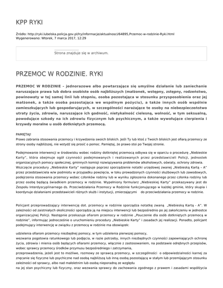 KPP RYKI Źródło: http://ryki.lubelska.policja.gov.pl/lry/informacje/aktualnosci/64895,Przemoc-w-rodzinie-Ryki.html Wygenerowano: Wtorek, 7 marca 2017, 12:29 Strona znajduje się w archiwum. PRZEMOC W RODZINIE. RYKI PRZEMOC W RODZINIE – jednorazowe albo powtarzające się umyślne działanie lub zaniechanie naruszające prawa lub dobra osobiste osób najbliższych (małżonek, wstępny, zstępny, rodzeństwo, powinowaty w tej samej linii lub stopniu, osoba pozostająca w stosunku przysposobienia oraz jej małżonek, a także osoba pozostająca we wspólnym pożyciu), a także innych osób wspólnie zamieszkujących lub gospodarujących, w szczególności narażające te osoby na niebezpieczeństwo utraty życia, zdrowia, naruszające ich godność, nietykalność cielesną, wolność, w tym seksualną, powodujące szkody na ich zdrowiu fizycznym lub psychicznym, a także wywołujące cierpienia i krzywdy moralne u osób dotkniętych przemocą. PAMIĘTAJ! Prawo zabrania stosowania przemocy i krzywdzenia swoich bliskich. Jeśli Ty lub ktoś z Twoich bliskich jest ofiarą przemocy ze strony osoby najbliższej, nie wstydź się prosić o pomoc. Pamiętaj, że prawo stoi po Twojej stronie. Podejmowanie interwencji w środowisku wobec rodziny dotkniętej przemocą odbywa się w oparciu o procedurę „Niebieskie Karty”, która obejmuje ogół czynności podejmowanych i realizowanych przez przedstawicieli Policji, jednostek organizacyjnych pomocy społecznej, gminnych komisji rozwiązywania problemów alkoholowych, oświaty, ochrony zdrowia. Wszczęcie procedury „Niebieskie Karty” następuje poprzez sporządzenie notatki urzędowej zwanej „Niebieską Kartą – A” przez przedstawiciela w/w podmiotu w przypadku powzięcia, w toku prowadzonych czynności służbowych lub zawodowych, podejrzenia stosowania przemocy wobec członków rodziny lub w wyniku zgłoszenia dokonanego przez członka rodziny lub przez osobę będącą świadkiem przemocy w rodzinie. Wypełniony formularz „Niebieskiej Karty” przekazywany jest do Zespołu Interdyscyplinarnego ds. Przeciwdziałania Przemocy w Rodzinie funkcjonującego w każdej gminie, który skupia i koordynuje działaniami przedstawicieli różnych służb i instytucji, zmierzającymi do przeciwdziałania przemocy w rodzinie. Policjant przeprowadzający interwencję dot. przemocy w rodzinie sporządza notatkę zwaną „Niebieską Kartą - A”. W zależności od zaistniałych okoliczności sporządza ją na miejscu interwencji lub bezpośrednio po jej zakończeniu w jednostce organizacyjnej Policji. Następnie przekazuje ofiarom przemocy w rodzinie „Pouczenie dla osób dotkniętych przemocą w rodzinie”, informując jednocześnie o uruchomieniu procedury „Niebieskie Karty” i zasadach jej realizacji. Ponadto, policjant podejmujący interwencję w związku z przemocą w rodzinie ma obowiązek: udzielenia ofiarom przemocy niezbędnej pomocy, w tym udzielenia pierwszej pomocy, wezwania pogotowia ratunkowego lub podjęcia, w razie potrzeby, innych niezbędnych czynności zapewniających ochronę życia, zdrowia i mienia osób będących ofiarami przemocy, włącznie z zastosowaniem, na podstawie odrębnych przepisów, wobec sprawcy przemocy środków przymusu bezpośredniego i zatrzymania, przeprowadzenia, jeżeli jest to możliwe, rozmowy ze sprawcą przemocy, w szczególności o odpowiedzialności karnej za znęcanie się fizyczne lub psychiczne nad osobą najbliższą lub inną osobą pozostającą w stałym lub przemijającym stosunku zależności od sprawcy, albo nad małoletnim lub osobą nieporadną ze względu na jej stan psychiczny lub fizyczny, oraz wezwania sprawcy do zachowania zgodnego z prawem i zasadami współżycia społecznego, przeprowadzenia na miejscu zdarzenia, w przypadkach niecierpiących zwłoki, czynności procesowych w niezbędnym zakresie, w granicach koniecznych do zabezpieczenia śladów i dowodów przestępstwa. Zadania dzielnicowego Czynności na rzecz rodziny wynikające z realizacji procedury „Niebieskie Karty” podejmowane po sporządzeniu „Niebieskiej Karty - A” realizuje dzielnicowy. Dzielnicowy uczestniczy w pracach Zespołu Interdyscyplinarnego/Grupy Roboczej na rzecz danej rodziny i podejmuje działania zmierzające do zapobiegania zagrożeniom m.in. poprzez dokonywanie wizyt sprawdzających stan bezpieczeństwa w środowisku i inicjowanie działań pomocowych. Przeprowadza również rozmowy, w szczególności ze sprawcą przemocy n/t odpowiedzialności karnej za dopuszczenie się przestępstwa znęcania. Pamiętaj! Do podstawowych zadań Policji należy m. in.: 1.Ochrona życia i zdrowia ludzi oraz mienia przed bezprawnymi zamachami naruszającymi te dobra, 2.Inicjowanie i organizowanie działań mających na celu zapobieganie popełnianiu przestępstw i wykroczeń oraz zjawiskom kryminogennym i współdziałanie w tym zakresie z organami państwowymi, samorządowymi i organizacjami pozarządowymi, 3.Wykrywanie przestępstw i wykroczeń oraz ściganie ich sprawców. Jeżeli doświadczasz przemocy w rodzinie lub jesteś świadkiem cierpienia innej osoby z powodu: bicia, kopania, szarpania za włosy, popychania, okaleczania, duszenia, przypalania, szantażowania, straszenia, upokarzania, poniżania, obrzucania wulgarnymi wyzwiskami, wyrzucania z domu, nadmiernego kontrolowania, zmuszania do odbywania stosunków seksualnych lub poddawania się nieakceptowanym przez nią zachowaniom seksualnym, uzależnienia finansowego od swojego partnera, który zakazuje jej podjęcia pracy, nie daje pieniędzy na zaspokajanie podstawowych potrzeb, zaniedbywania dzieci, osób starszych, chorych (dot. pozbawienia elementarnej opieki lekarskiej, głodzonych lub wykorzystywanych), powiadom Policję lub inne służby zajmujące się przeciwdziałaniem przemocy w rodzinie w rejonie Twojego miejsca zamieszkania. Wykaz instytucji i organizacji pomocowych udzielających wsparcia osobom pokrzywdzonym przemocą w rodzi
