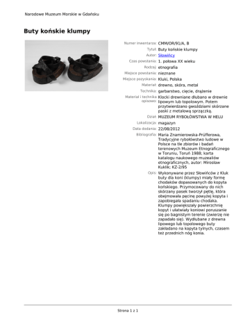 Narodowe Muzeum Morskie w Gdańsku Buty końskie klumpy Numer inwentarza: CMM/OR/91/A, B Tytuł: Buty końskie klumpy Autor: Słowińcy Czas powstania: 1. połowa XX wieku Rodzaj: etnografia Miejsce powstania: nieznane Miejsce pozyskania: Kluki, Polska Materiał: drewno, skóra, metal Technika: garbarstwo, cięcie, drążenie Materiał i technika Klocki drewniane dłubano w drewnie opisowo: lipowym lub topolowym. Potem przytwierdzano gwoździami skórzane paski z metalową sprzączką. Dział: MUZEUM RYBOŁÓWSTWA W HELU Lokalizacja: magazyn Data dodania: 22/08/2012 Bibliografia: Maria Znamierowska-Prüfferowa, Tradycyjne rybołówstwo ludowe w Polsce na tle zbiorów i badań terenowych Muzeum Etnograficznego w Toruniu, Toruń 1988; karta katalogu naukowego muzealiów etnograficznych, autor: Mirosław Kuklik; KZ-2/95 Opis: Wykonywane przez Słowińców z Kluk buty dla koni (klumpy) miały formę chodaków dopasowanych do kopyta końskiego. Przymocowany do nich skórzany pasek tworzył pętlę, która obejmowała pęcinę powyżej kopyta i zapobiegała spadaniu chodaka. Klumpy powiększały powierzchnię kopyt i ułatwiały koniowi poruszanie się po bagnistym terenie (zwierzę nie zapadało się). Wydłubane z drewna lipowego lub topolowego buty zakładano na kopyta tylnych, czasem też przednich nóg konia. Strona 1 z 1