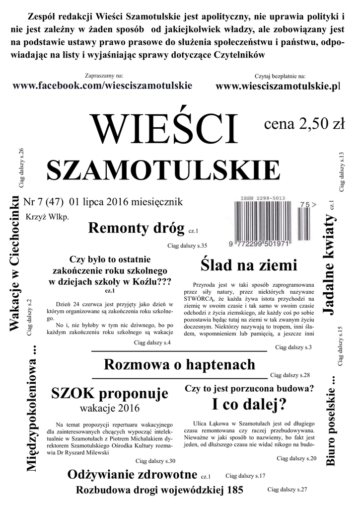 Zespół redakcji Wieści Szamotulskie jest apolityczny, nie uprawia polityki i nie jest zależny w żaden sposób od jakiejkolwiek władzy, ale zobowiązany jest na podstawie ustawy prawo prasowe do służenia społeczeństwu i państwu, odpowiadając na listy i wyjaśniając sprawy dotyczące Czytelników Zapraszamy na: Czytaj bezpłatnie na: www.facebook.com/wiesciszamotulskie cena 2,50 zł Ciąg dalszy s.13 Ciąg dalszy s.26 WIEŚCI SZAMOTULSKIE Ciąg dalszy s.35 Czy było to ostatnie zakończenie roku szkolnego w dziejach szkoły w Koźlu??? cz.1 Międzypokoleniowa ... Dzień 24 czerwca jest przyjęty jako dzień w którym organizowane są zakończenia roku szkolnego. No i, nie byłoby w tym nic dziwnego, bo po każdym zakończeniu roku szkolnego są wakacje Ślad na ziemi Przyroda jest w taki sposób zaprogramowana przez siły natury, przez niektórych nazywane STWÓRCĄ, że każda żywa istota przychodzi na ziemię w swoim czasie i tak samo w swoim czasie odchodzi z życia ziemskiego, ale każdy coś po sobie pozostawia będąc tutaj na ziemi w tak zwanym życiu doczesnym. Niektórzy nazywają to tropem, inni śladem, wspomnieniem lub pamięcią, a jeszcze inni Ciąg dalszy s.4 Ciąg dalszy s.3 Rozmowa o haptenach SZOK proponuje Czy to jest porzucona budowa? I co dalej? wakacje 2016 Na temat propozycji repertuaru wakacyjnego dla zainteresowanych chcących wypocząć intelektualnie w Szamotułach z Piotrem Michalakiem dyrektorem Szamotulskiego Ośrodka Kultury rozmawia Dr Ryszard Milewski Ciąg dalszy s.30 Ciąg dalszy s.28 Ulica Łąkowa w Szamotułach jest od długiego czasu remontowana czy raczej przebudowywana. Nieważne w jaki sposób to nazwiemy, bo fakt jest jeden, od dłuższego czasu nie widać nikogo na budo- Odżywianie zdrowotne cz.1 Ciąg dalszy s.20 Ciąg dalszy s.17 Rozbudowa drogi wojewódzkiej 185 Ciąg dalszy s.27 Ciąg dalszy s.15 cz.1 Jadalne kwiaty Remonty dróg Biuro poselskie ... Krzyż Wlkp. cz.1 Nr 7 (47) 01 lipca 2016 miesięcznik Ciąg dalszy s.2 Wakacje w Ciechocinku www.wiesciszamotulskie.pl Ciąg dalszy ze s.1 Międzypokoleniowa impreza integracyjna Zostaliśmy zaproszeni na kolejną międzypokoleniową imprezę integracyjną zorganizowaną przez Stowarzyszenie Pomocy na rzecz Rodziny i Osób Niepełnospraw- nych „Pomocna Dłoń” funkcjonujące w Pniewach pod kierownictwem prezes Danuty Strojwąs. W przeszłości bywaliśmy już na tego typu imprezach organizowanych przez „Pomocną Dłoń”. Tym razem podobnie jak w przeszłości z podopiecznymi prezes Strojwąs przyjechali zaproszeni przez prezes Strojwąs goście: Justyna Jóźwiak opiekunka grupy z podopiecznymi z Domu Pomocy Społecznej z Łężeczek, i Andrzej Mikołajczak nauczyciel ze Szkoły Podstawowej w Pniewach z klasą czwartą, oraz wolontariuszki Teresa Polanowska, Henryka Grześkowiak, Henryka Antos. Spotkanie rozpoczęło się o g.1400 ósmego czerwca 2016 w goCiąg dalszy s.6 Wjazd do gospodarstwa agroturystycznego w Zajączkowie. WIEŚCI SZAMOTULSKIE ISSN2299-5013 Redaktor naczelny : dr Ryszard Milewski. Zespół redakcyjny : inż. Czesław Baliński, Marian Nowak. Adres redakcji: ul. Świerkowa 1, 64-520 Obrzycko. Kontakt : tel. 606559313, mail : [email protected] Wydawca : Wydawnictwo STOKROTKA, mgr Agnieszka Sakra, ul. Świerkowa 1, 64-520 Obrzycko, tel. 606559313. Postanowienie SO : sygn.akt I Ns. Rej. Pr. 146/12. Druk wykonano : Wydawnictwo STOKROTKA, mgr Agnieszka Sakra, ul. Świerkowa 1, 64-520 Obrzycko. Redakcja nie zwraca otrzymanych materiałów, oraz zastrzega sobie prawo do skracania i adiustacji tekstów i listów. Redakcja nie odpowiada za treść ogłoszeń, reklam, listów. str. 2 Nr 7 (47) Wieści Szamotulskie 0 1 lipca 2016r. Ciąg dalszy ze s.1 Ślad na ziemi nazywają to dobrem materialnym. Nazw jest tyle ile jest nazywających. Nie jest ważne w jaki sposób nazwiemy nasz ślad na ziemi, ważne jest to, co po sobie zostawiamy. A najważniejsze jest to, że zostawiamy po sobie dobre wspomnienie. Dobre, czyli takie które przez większość społeczeństwa uznawane jest za pozytywne, godne naśladowania, które u niektórych może wzbudzać nawet nutkę zazdrości, bo chciałoby się naśladować, itp. I na takiej to właśnie zasadzie nasi rodzice, dziadkowie, i jeszcze wcześniejsi przodkowie coś po sobie zostawili. Zostawili swój ślad na ziemi, że tutaj byli, że tutaj żyli, że tutaj się rozwijali duchowo, fizycznie, materialnie. A życie ziemskie składa się z sukcesów i porażek, z chwil przyjemnych i mniej przyjemnych. Do chwil przyjemnych niewątpliwie należą różnego rodzaju uroczystości, organizowane z różnych powo- Namiot z gośćmi w trakcie mszy świętej. Nr 7 (47) Wieści Szamotulskie 01 lipca 2016 r. dów. Każdy z nas ma w swoim życiu tak zwane swoje święta, często przedstawiane w formie uroczystości, na które to zaprasza się najbliższe osoby, przyjaciół domu, kolegów, i bliskich znajomych. I właśnie z bardzo wielka radością przyjęliśmy zaproszenie na dwie bardzo wielkie i ważne uroczystości odbywające się w tym samym czasie i w tym samym miejscu, w życiu rodziny Państwa Ju- Ciąg dalszy s.8 str. 3 Ciąg dalszy ze s.1 Czy było to ostatnie zakończenie roku szkolnego w dziejach szkoły w Koźlu??? cz.1 nazywane letnimi a pierwszego września organizowane są rozpoczęcia roku szkolnego nazywane też inauguracjami. I tak trwa od lat, i jeszcze dłużej. Ale nieraz kolej rzeczy ulega zmianie, i dane zakończenie roku szkolnego w dziejach szkoły może okazać się ostatnim zakończeniem roku szkolnego. No bo, wszystko w życiu ulega zmianom, przeobrażeniom, zgodnie z przeobrażeniami społecznymi i lokalnymi. A może przede wszystkim prawami finansowymi, nazywanymi ekonomią. I właśnie nasi Czytelnicy poinformowali nas, że na zasadzie takich przeobrażeń lokalnych, ma ulec likwidacji Szkoła Podstawowa w Koźlu. A zakończenie roku szkolnego 24 czerwca 2016 ma być w dziejach szkoły ostatnim zakończe