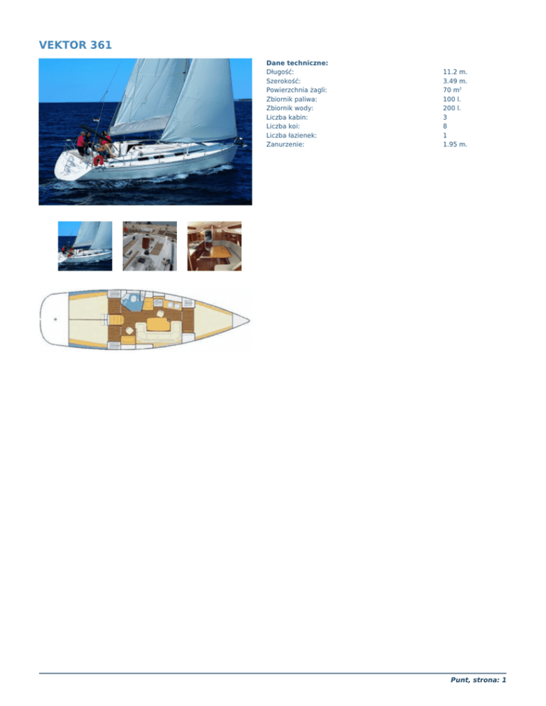 VEKTOR 361 Dane techniczne: Długość: Szerokość: Powierzchnia żagli: Zbiornik paliwa: Zbiornik wody: Liczba kabin: Liczba koi: Liczba łazienek: Zanurzenie: 11.2 m. 3.49 m. 70 m2 100 l. 200 l. 3 8 1 1.95 m. Punt, strona: 1