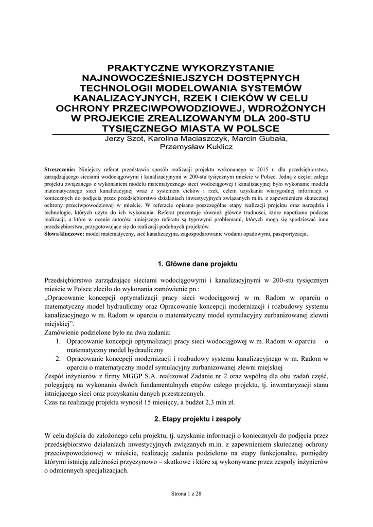 PRAKTYCZNE WYKORZYSTANIE NAJNOWOCZEŚNIEJSZYCH DOSTĘPNYCH TECHNOLOGII MODELOWANIA SYSTEMÓW KANALIZACYJNYCH, RZEK I CIEKÓW W CELU OCHRONY PRZECIWPOWODZIOWEJ, WDROŻONYCH W PROJEKCIE ZREALIZOWANYM DLA 200-STU TYSIĘCZNEGO MIASTA W POLSCE Jerzy Szot, Karolina Maciaszczyk, Marcin Gubała, Przemysław Kuklicz Streszczenie: Niniejszy referat przedstawia sposób realizacji projektu wykonanego w 2015 r. dla przedsiębiorstwa, zarządzającego sieciami wodociągowymi i kanalizacyjnymi w 200-stu tysięcznym mieście w Polsce. Jedną z części całego projektu związanego z wykonaniem modelu matematycznego sieci wodociągowej i kanalizacyjnej było wykonanie modelu matematycznego sieci kanalizacyjnej wraz z systemem cieków i rzek, celem uzyskania wiarygodnej informacji o koniecznych do podjęcia przez przedsiębiorstwo działaniach inwestycyjnych związanych m.in. z zapewnieniem skutecznej ochrony przeciwpowodziowej w mieście. W referacie opisano poszczególne etapy realizacji projektu oraz narzędzia i technologie, których użyto do ich wykonania. Referat prezentuje również główne trudności, które napotkano podczas realizacji, a które w ocenie autorów niniejszego referatu są typowymi problemami, których mogą się spodziewać inne przedsiębiorstwa, przygotowujące się do realizacji podobnych projektów. Słowa kluczowe: model matematyczny, sieć kanalizacyjna, zagospodarowanie wodami opadowymi, paszportyzacja. 1. Główne dane projektu Przedsiębiorstwo zarządzające sieciami wodociągowymi i kanalizacyjnymi w 200-stu tysięcznym mieście w Polsce zleciło do wykonania zamówienie pn.: „Opracowanie koncepcji optymalizacji pracy sieci wodociągowej w m. Radom w oparciu o matematyczny model hydrauliczny oraz Opracowanie koncepcji modernizacji i rozbudowy systemu kanalizacyjnego w m. Radom w oparciu o matematyczny model symulacyjny zurbanizowanej zlewni miejskiej”. Zamówienie podzielone było na dwa zadania: 1. Opracowanie koncepcji optymalizacji pracy sieci wodociągowej w m. Radom w oparciu o matematyczny model hydrauliczny 2. Opracowanie koncepcji modernizacji i rozbudowy systemu kanalizacyjnego w m. Radom w oparciu o matematyczny model symulacyjny zurbanizowanej zlewni miejskiej Zespół inżynierów z firmy MGGP S.A. realizował Zadanie nr 2 oraz wspólną dla obu zadań część, polegającą na wykonaniu dwóch fundamentalnych etapów całego projektu, tj. inwentaryzacji stanu istniejącego sieci oraz pozyskaniu danych przestrzennych. Czas na realizację projektu wynosił 15 miesięcy, a budżet 2,3 mln zł. 2. Etapy projektu i zespoły W celu dojścia do założonego celu projektu, tj. uzyskania informacji o koniecznych do podjęcia przez przedsiębiorstwo działaniach inwestycyjnych związanych m.in. z zapewnieniem skutecznej ochrony przeciwpowodziowej w mieście, realizację zadania podzielono na etapy funkcjonalne, pomiędzy którymi istnieją zależności przyczynowo – skutkowe i które są wykonywane przez zespoły inżynierów o odmiennych specjalizacjach. Strona 1 z 28 Etap I Etap II Etap III Etap IV Etap V Etap VI Etap VII Opis etapu Inwentaryzacja stanu istniejącego (paszportyzacja) Pozyskanie danych przestrzennych Wstępny model matematyczny (kanały zamknięte i otwarte) Kampania pomiarowa Docelowy model matematyczny (kanały zamknięte i otwarte) Koncepcja z analizą rzeczowo - finansową Szkolenie personelu Zespół podstawowy Zespół GIS Zespół wspierający Informatycy, Inżynierowie sanitarni Zespół AERO GIS Zespół SANITARNY i GIS RZECZNY Zespół POMIAROWY Inżynierowie sanitarni Zespół SANITARNY i RZECZNY Zespół SANITARNY Kosztorysant Zespół SANITARNY Rysunek 1 - Etapy projektu i zespół 3. Harmonogram W celu zaplanowania realizacji projektu w okresie 15 miesięcy, należało przede wszystkim wziąć pod uwagę realizację Etapu II czyli pozyskania danych przestrzennych. Etap ten musiał zostać wykonany jako jeden z pierwszych, gdyż do realizacji kolejnych etapów potrzebne były dane właśnie z tego etapu, tj. Ortofotomapa i Numeryczny Model Terenu. Realizacja tego etapu uwarunkowana jest w dużym stopniu porą roku. Mianowicie w celu pozyskania przydatnych danych, czyli zdjęć lotniczych, koniecznym jest aby na drzewach nie było liści, a teren nie był przykryty warstwą śniegu. W związku z tym, etap ten może być realizowany tylko późną jesienią lub wczesną wiosną. Etap I Etap II Etap III Etap IV Etap V Etap VI Etap VII 2014 Opis etapu IV kw. Inwentaryzacja stanu istniejącego (paszportyzacja) Pozyskanie danych przestrzennych Wstępny model matematyczny (kanały zamknięte i otwarte) Kampania pomiarowa Docelowy model matematyczny (kanały zamknięte i otwarte) Koncepcja z analizą rzeczowo finansową Szkolenie personelu Rysunek 2 - Harmonogram pracy Strona 2 z 28 2015 I kw. II kw. III kw. IV kw. 4. Etap I – Inwentaryzacja stanu istniejącego (paszportyzacja) W celu przygotowania inwentaryzacji stanu istniejącego sieci i dokonania jej paszportyzacji na potrzeby modelu, należało skorzystać z następujących dokumentów: map cyfrowych z warstwami tematycznymi, skanów map zasadniczych, wersji elektronicznej posiadanej dokumentacji technicznej o aktywach wodociągowych i kanalizacyjnych (skany, mapy wektorowe, zdjęcia, materiały z inwentaryzacji), ksiąg inwentarzowych, kopii dokumentacji powykonawczej, bazy danych o wodomierzach w formacie Excel*xlsx lub Access.mdb; listy zasuw zamkniętych obecnie na sieci wodociągowej/ pozostałych materiałów, które mogą być przydatne do uzupełnienia brakujących informacji o sieciach i obiektach wod-kan. Rysunek 3 - Schemat ideowy źródeł do pozyskiwania danych do paszportyzacji sieci Strona 3 z 28 Ortofotomapa o odpowiedniej rozdzielczości np. 5cm, pozwala na identyfikacje brakujących elementów sieci – np. studzienek. Rysunek 4 - Ortofotomapa W celu zapewnienia optymalnego modelu danych konieczne jest opracowanie słowników dla poszczególnych elementów sieci